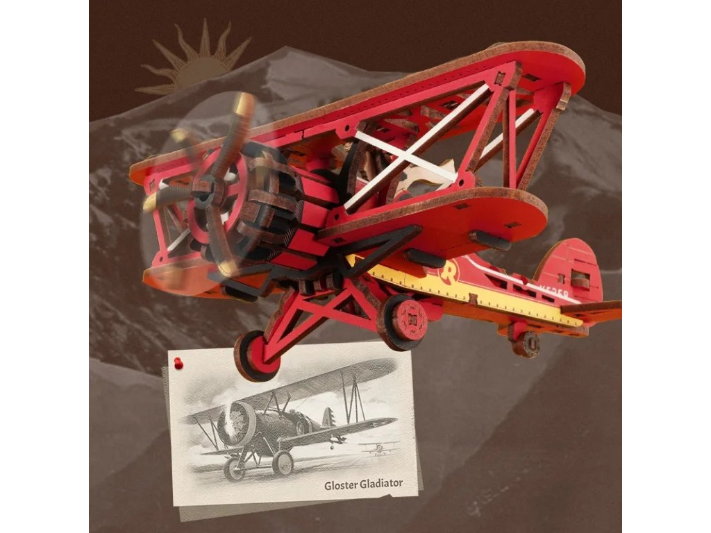 Užijte si bezpečný let na palubě červeného dvojplošníku s otevřeným kokpitem s otáčející se třílistou vrtulí v nápadné černožluté barevné kombinaci. Dvojplošník je replikou letadla Gloster Gladiator z 30. let 20. století v měřítku 1 : 60, jednoho z nejikoničtějších a posledních válečných dvojplošníků, které kdy byly vyrobeny. Má pohyblivé kormidlo, což dodává jeho designu interaktivní prvek. Letadlo uvedete do pohybu jemným zatlačením na závaží kyvadla, které zahájí konzistentní kývavý pohyb, který napodobuje houpání a naklánění letadla při letu. Je součástí řady Gravity Swing, která spojuje zábavu se vzděláváním a probouzí zvědavost všech věkových kategorií. Tyto chytré modely s kyvadlovým mechanismem umožňují lidem objevovat základní principy fyziky hravou formou. Pojmy jako gravitace, pohyb, rovnováha či přeměna potenciální a kinetické energie se stávají nejen pochopitelnými, ale i zábavnými. Věda se mění v dobrodružství, které rozvíjí kreativitu i praktické dovednosti. 3D mechanická skládačka je skvělý způsob, jak si užít kreativní a edukativní hraní a zároveň vytvořit nádherný model, který se může stát netradičním dárkem či ozdobou interiéru. Skládání podporuje rozvoj jemné motoriky, prostorového myšlení a trpělivosti. Je to možnost, jak kombinovat zábavu se vzděláváním. Všechny přesně vyřezané dílky do sebe lehce zapadnou bez použití lepidla či nástrojů, aby výsledek byl stabilní a odolný. Skládačka je dodávána v nesloženém stavu, zabalená v krabici s podrobným návodem k sestavení. Hlavní vlastnosti: 163 dílkůdoba skládání 1,5 hodstřední obtížnost sestaveníkyvadlový pohonsestavení bez použití lepidla a nástrojůvýjimečný vzhledvhodné pro děti i dospělérozvíjí logické a motorické dovednostipodporuje trpělivost dětíideální jako dárek nebo jedinečná dekoracesoučást řady Gravity Swing