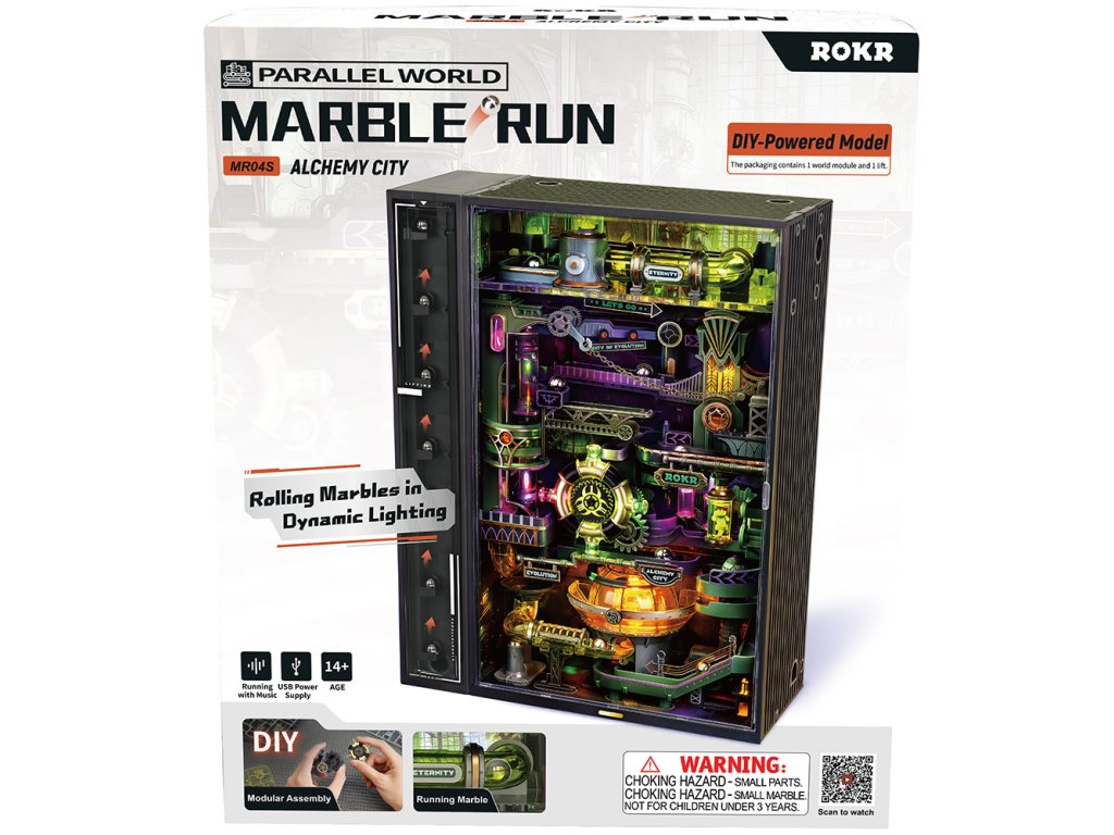 Tato moderní kuličková stavebnice přináší nekonečnou zábavu plnou pohybu, světel a zvuků. Díky důmyslnému mechanickému systému se kuličky neustále pohybují po dráze a automaticky se vracejí zpět na začátek, takže hra nikdy nekončí. Kuličky po výjezdu sjíždějí dlouhou, přehlednou dráhu s průhlednými tunely, výtahem a zajímavými překážkami, které můžete sledovat z každého úhlu. Celou cestu oživují barevná světla a světelné efekty, které vytvářejí poutavou podívanou a dodávají stavebnici jedinečnou atmosféru. Skládačka nabízí dva režimy použití - hravý režim se světly a zvuky pro aktivní hraní nebo klidnější režim s jemným světlem a tlumenými zvuky, ideální jako dekorace do pokoje. Díky velkému množství kombinací si můžete dráhu sestavit pokaždé jinak a přizpůsobit ji podle své fantazie. Sada je kompatibilní s dalšími kuličkovými stavebnicemi ze stejné série, které lze dokoupit zvlášť. Skvěle se hodí pro děti i dospělé, kteří mají rádi kreativní stavění a chytré mechanismy. 3D skládačka je skvělý způsob, jak si užít kreativní a edukativní hraní a zároveň vytvořit netradiční dárek či doplněk interiéru. Skládání skládačky podporuje rozvoj jemné motoriky, prostorového myšlení a trpělivosti. Pozvěte svou rodinu nebo přátele a užijte si zábavné tvoření bez nutnosti použití lepidla nebo nástrojů. Všechny dílky do sebe lehce zapadnou, aby výsledek byl stabilní a odolný. Skládačka je dodávána v nesloženém stavu, zabalená v krabici s podrobným návodem k sestavení. Prosím, vezměte na vědomí, že tento produkt vytváří záblesky světla, které mohou u citlivých osob vyvolat epileptický záchvat. Hlavní vlastnosti: 1 modul města, 1 výtah247 přesných dílkůdoba sestavení 2 hodinystřední obtížnost sestaveníbez použití lepidlarozvíjí logické a motorické dovednostipodporuje trpělivost dětíLED osvětleník napájení slouží USB-C kabel - není součástí balenípodrobný návod k sestavenímožnost propojení s MR01S, MR02S, MR03S