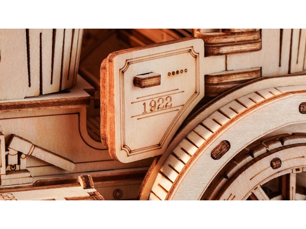 V éře mosazi byli tito veteráni mistrovským dílem řemesla a technologie, v 10. letech minulého století. Karoserie "runabout" připomíná kočáry tažené koňmi. Má aerodynamický blatník s liniemi, které jsou kontinuálně vedeny od předu až dozadu, zástěrkami blatníků částečně zakrývajícími kola. V interiéru byl vybaven řadící pákou a pohodlným sedadlem ve stylu pohovky pro pohodlí a eleganci. Vůz ale nebyl pouze o estetice. Díky některým speciálním funkcím byl i bezpečnější. Střecha byla navržena pro jednu osobu zakrývající přední i zadní sedadla. 3D Historický veterán se může pochlubit otevíratelnými dveřmi a tím dodat modelu autenticitu, takže je pro automobilové nadšence přitažlivější. Dále je vybaven otevíratelnou bedýnkou na nářadí a rezervní pneumatikou. Jeho sestavením získáte dokonalou dekoraci, se kterou zažijete kouzlo jedinočné éry historických vozidel. Skládadačka je dodávána v nesloženém stavu, balena v krabici. Součástí balení je detailní návod k sestavení. Hlavní vlastnosti: 298 precizně vyřezávaných dílůdoba montáže cca 4 hodinyvelikost po složení cca 19x9,2x11,5 cm