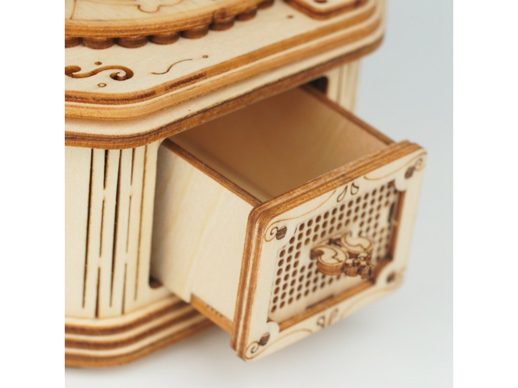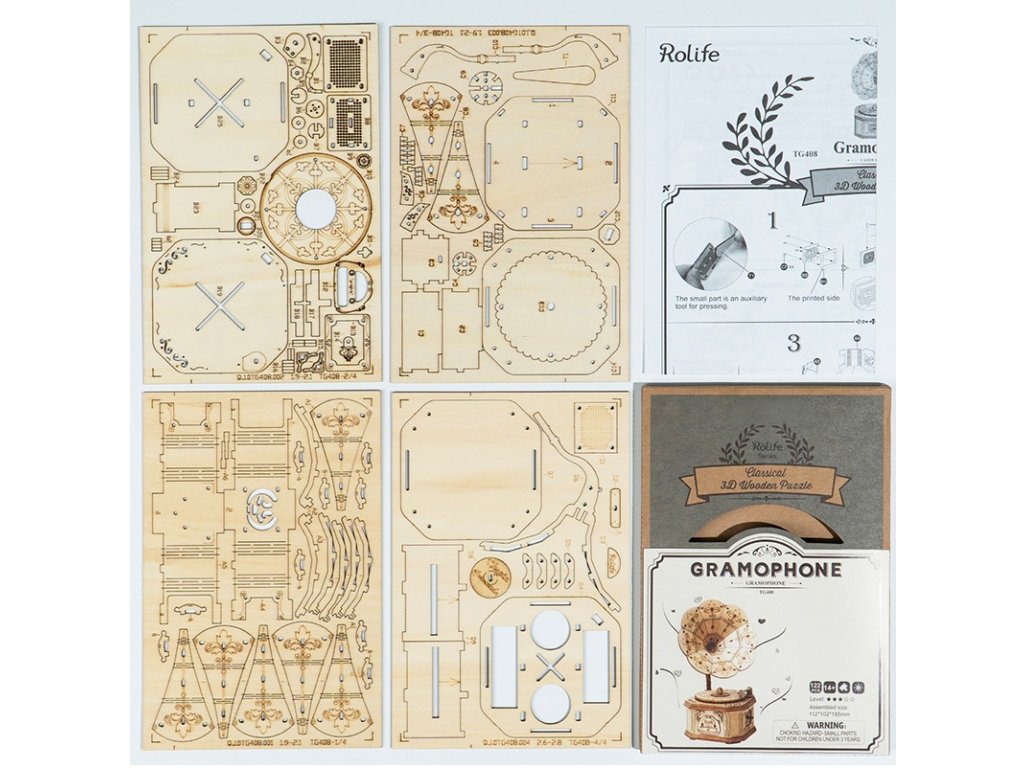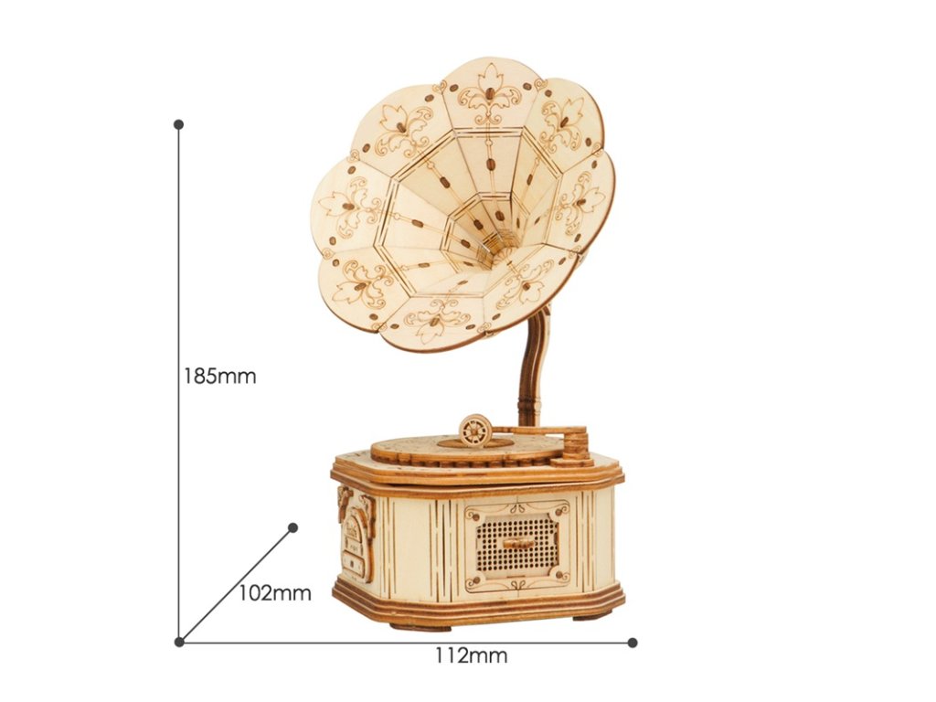 Detailní model starožitného gramofonu, vybavený přihrádkou. Patří do řady skládaček, které jsou určeny k vystavení, nejsou interaktivní a nemají žádné pohyblivé díly. Skládačka je dodávána v nesloženém stavu, balena v krabici. Vybaveno detailním návodem k sestavení. Hlavní vlastnosti:122 precizně vyřezaných dílkůnízká obtížnost sestavení