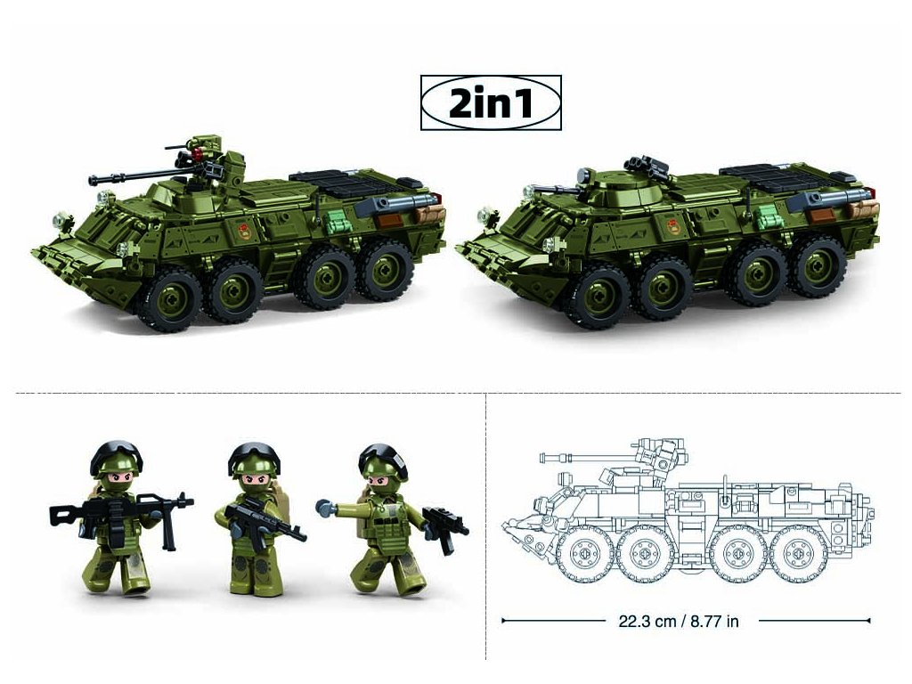 Stavebnice Sluban Model Bricks M38-B1251 Tank BTR-80AS IFV v měřítku 1:35 je určena pro děti od 8 let. S rozměry balení 42,5 x 33 x 6,7 cm a délkou tanku 22,3 cm obsahuje celkem 619 dílků a 4 figurky.