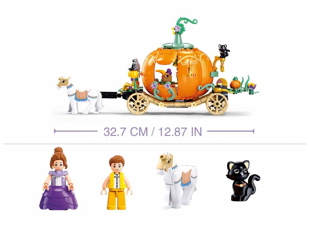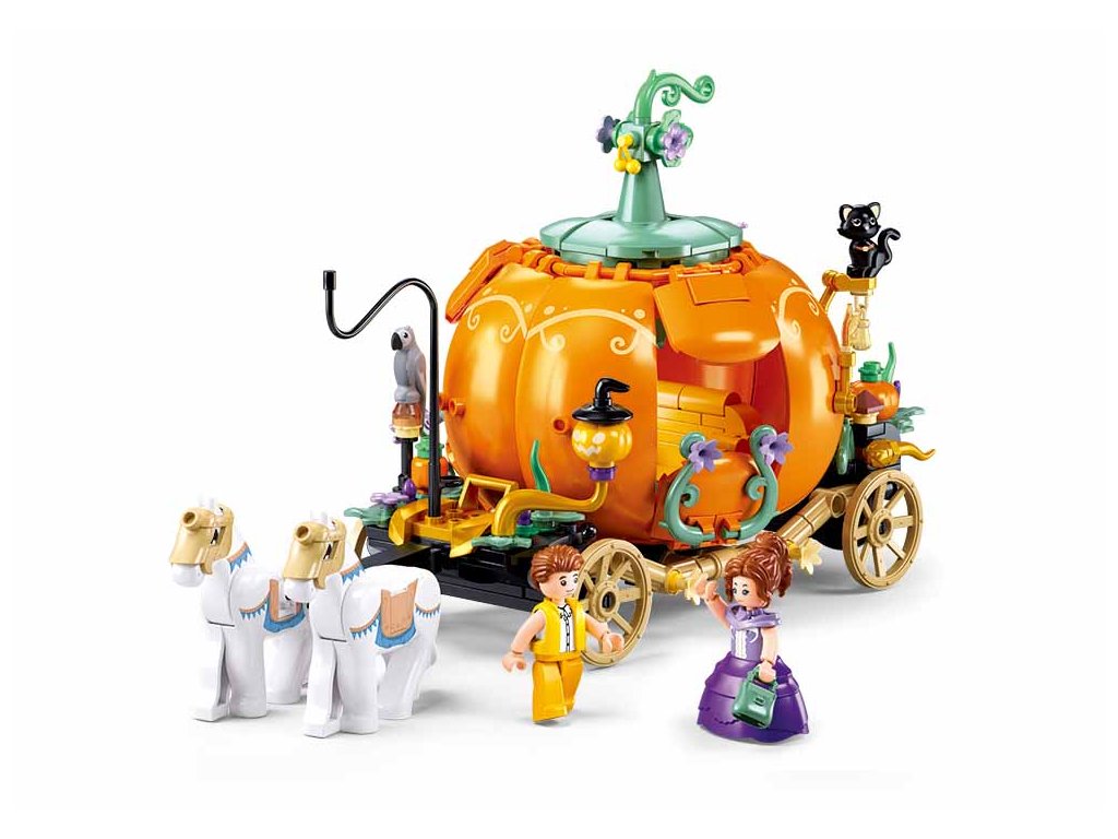 Stavebnice Sluban Girls Dyňobraní M38-B1176 Kouzelný dýňový kočár přináší malým dobrodruhům vzrušující zážitek z pohádkového světa. Balení o rozměrech 38,1x28,7x6,7 cm obsahuje celkem 320 dílků, včetně dvou figurek, a po sestavení dosahuje kočár délky 32,7 cm. Tato stavebnice je určená pro děti od sedmi let.