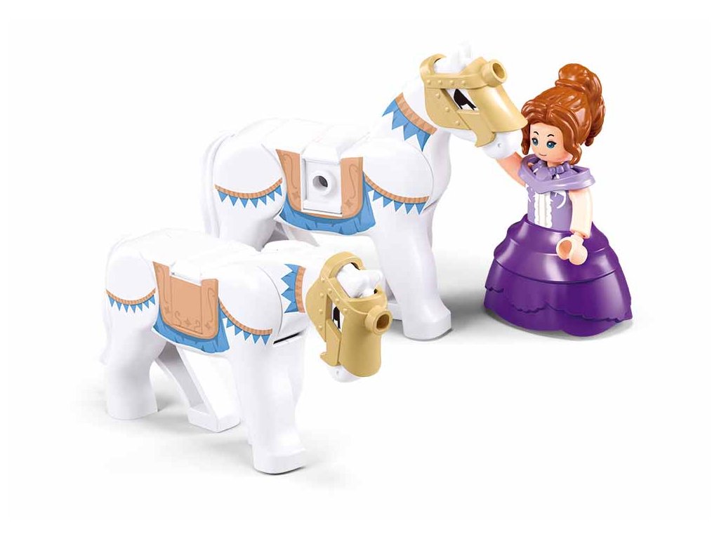 V setu figurují dvě postavy – dívka v fialových šatech s hnědými vlasy a chlapec v žlutém oblečení. Dva bílí koně s ozdobnými postroji skvěle doplňují celkový dojem a umožňují dětem prožít dobrodružství v kouzelném světě.
