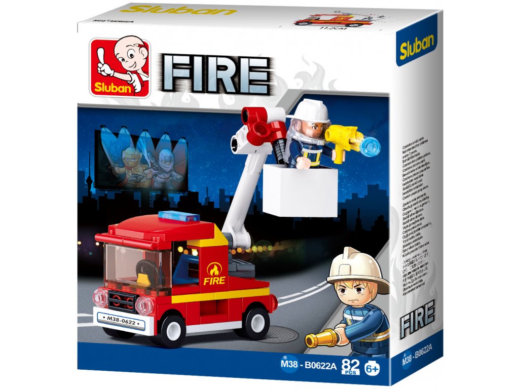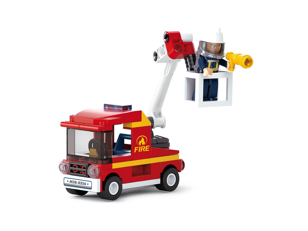 Malý hasičský vůz s plošinou. Vůz je po sestavení dlouhý více než 11cm. Stavebnice obsahuje 82 dílků a jednu figurku.