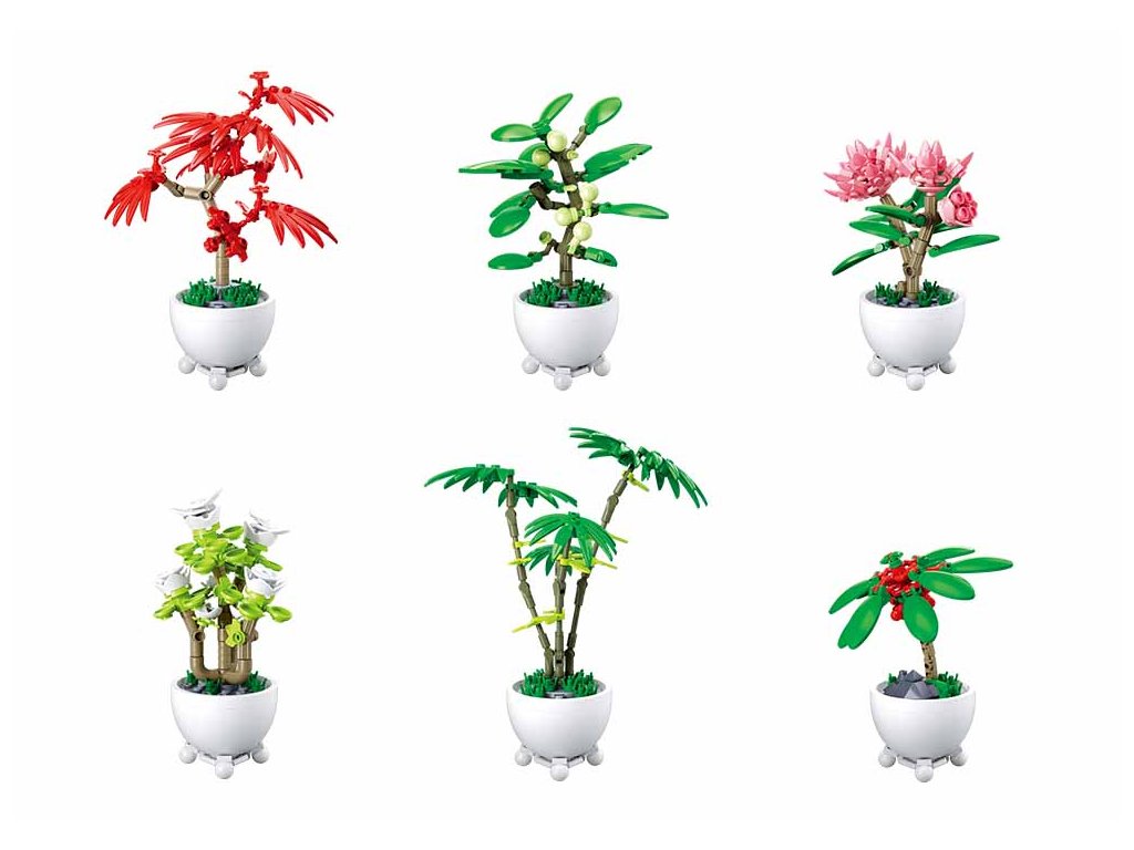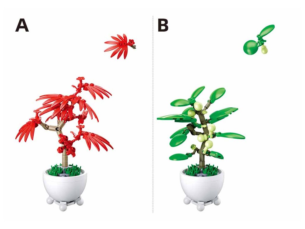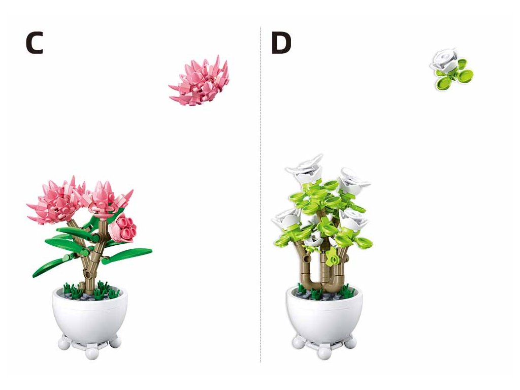 Model A zobrazuje červenou květinu s dlouhými, úzkými okvětními lístky, která připomíná tropický strom. Tento model obsahuje 76 dílků. Model B představuje zelenou rostlinu s kulatými listy a bílými kvítky, která se skládá z 103 dílků a přináší do sestavy jemnost a styl. Růžová květina v modelu C, s bohatými okvětními lístky, evokuje orchidej a obsahuje 107 dílků, což dodává celému aranžmá na atraktivitě.