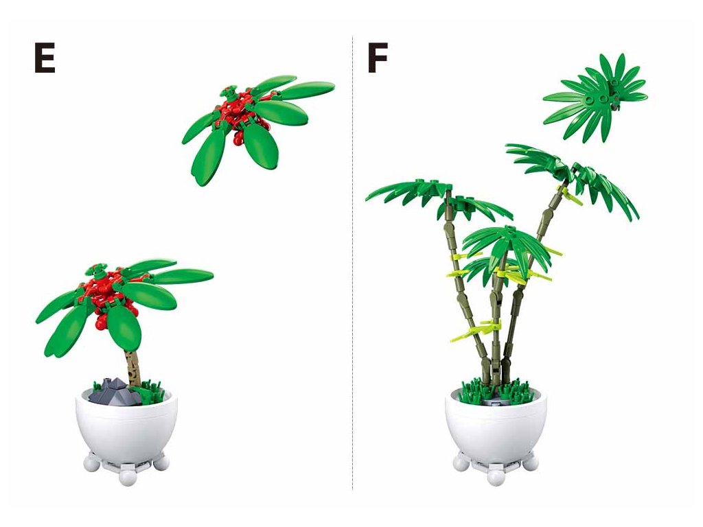 Zelená rostlina s bílými květy v modelu D, inspirovaná liliemi, má 99 dílků a vnáší do kolekce svěží prvek. Model E zobrazuje zelenou rostlinu s červenými kvítky a velkými listy, obsahující 65 dílků, což vytváří kontrastující a živý vzhled. Na závěr model F zobrazuje tropickou palmu s dlouhými zelenými listy, která se skládá z 82 dílků a dokonale doplňuje celkovou atmosféru tropického ráje.