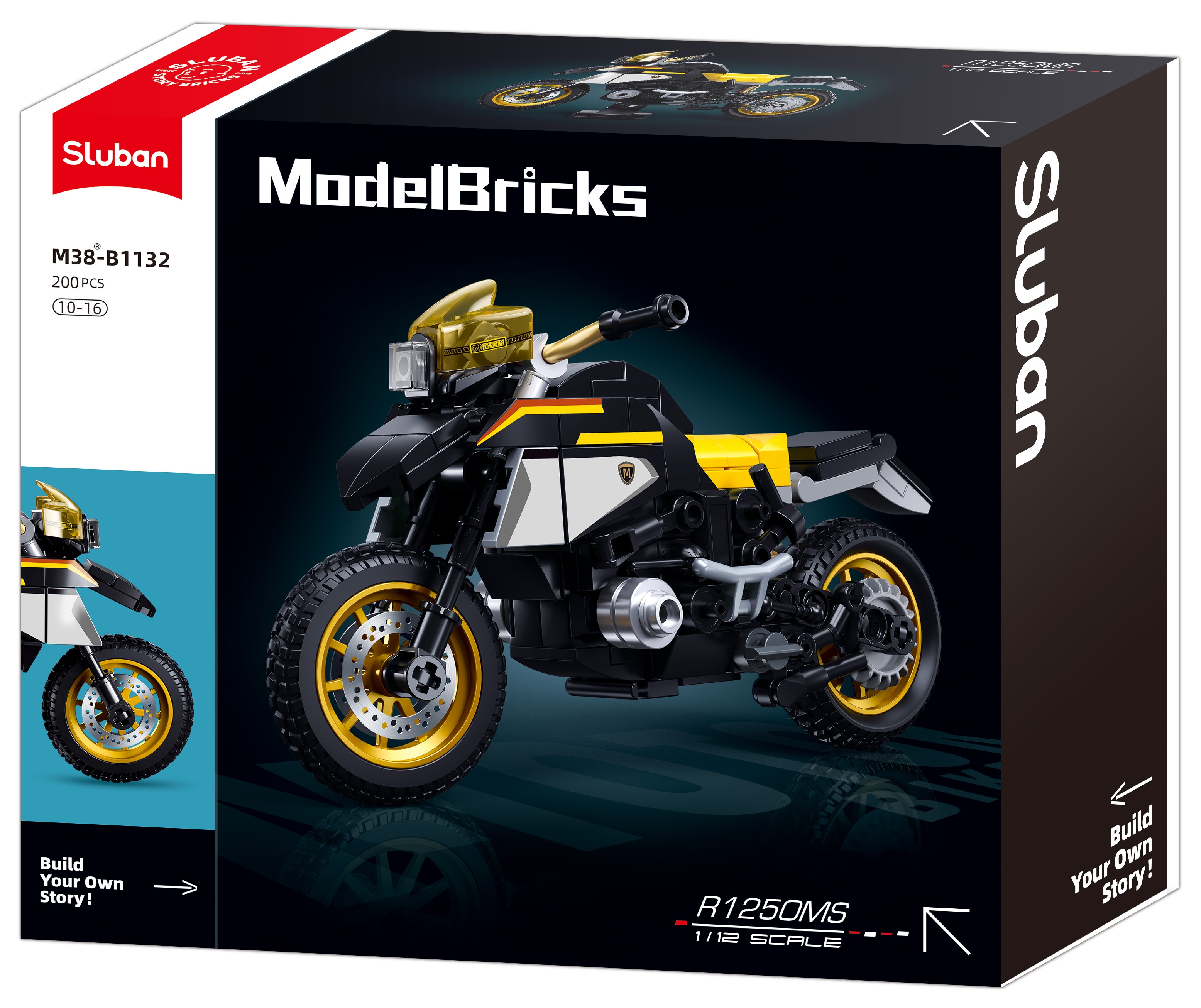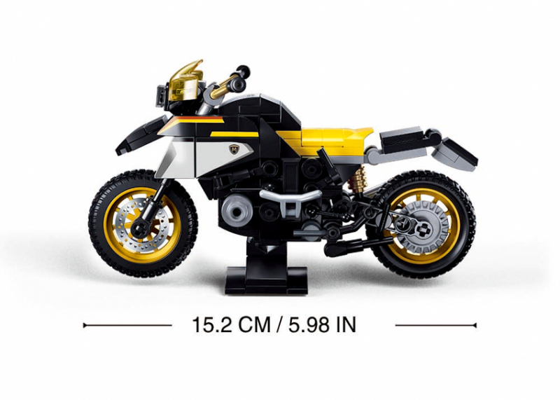 Stavebnice Sluban Model Bricks M38-B1132 přináší model motorky R1250 GS v měřítku 1:12, který je jedním ze šesti nových modelů motorek od Sluban. Sestavený model se může pochlubit 200 dílky a po dokončení měří 15 cm na délku. Motorka zaujme svou černou barvou s žlutými prvky a věrně napodobuje tvar a design originálního stroje s obsahem motoru 1250cc.