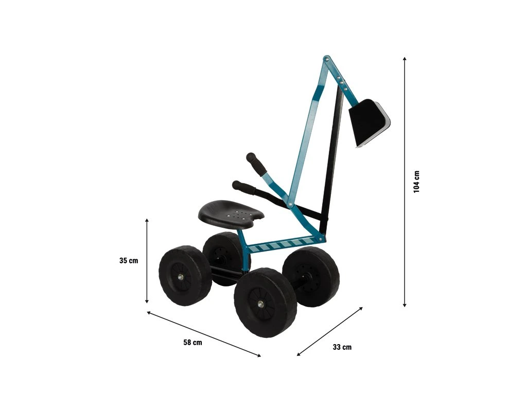 Dětský bagr s otočnou konstrukcí o 360° nabízí realistickou herní zábavu bez kompromisů. Robustní bagrová lžíce se ovládá pomocí dvou pák, které dětem umožňují snadno nabírat, zvedat a vyklápět písek i drobné poklady. Pevný kovový rám je navržen pro zatížení až 50 kg a doplněn pohodlným plastovým sedátkem. Díky velkým kolům o průměru 20 cm je bagr snadno pojízdný a děti s ním mohou samostatně manévrovat po pískovišti i zahradě. Bagr vnáší do hry autentickou atmosféru staveniště a motivuje děti k aktivní hře venku. Podporuje rozvoj hrubé motoriky, koordinace pohybů i prostorové představivosti a zároveň stimuluje kreativitu a fantazii. Ergonomicky tvarované rukojeti jsou přizpůsobené malým dětským rukám a usnadňují ovládání. Díky realistickým funkcím si malí stavebníci mohou hravě vyzkoušet kopání, zvedání i vyklápění téměř jako skuteční profesionálové. Hodiny zábavy na čerstvém vzduchu jsou zaručeny. Hlavní vlastnosti: konstrukce otočná o 360° pro maximální mobilitu pohyblivá lopata rýpadla, která se ovládá dvěma páčkami (funkce uchopení a vysypání)robustní kovový rám, nosnost až 50 kgergonomicky tvarované rukojetipodporuje motoricke dovednosti, koordinaci ruka-oko a povzbuzuje k hraníideální na zahradu a pískovištěvyrobeno v Německu