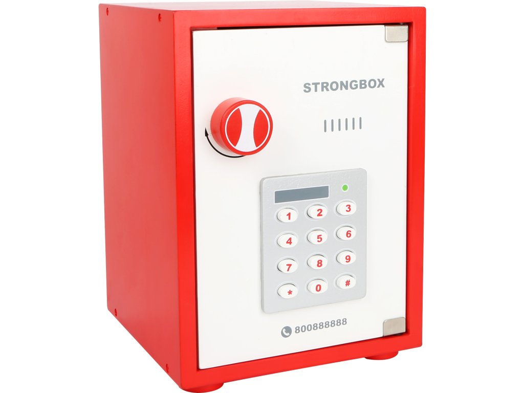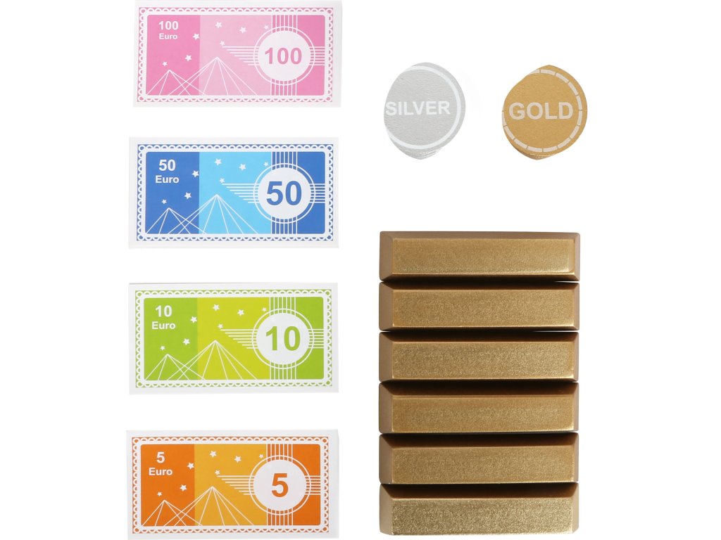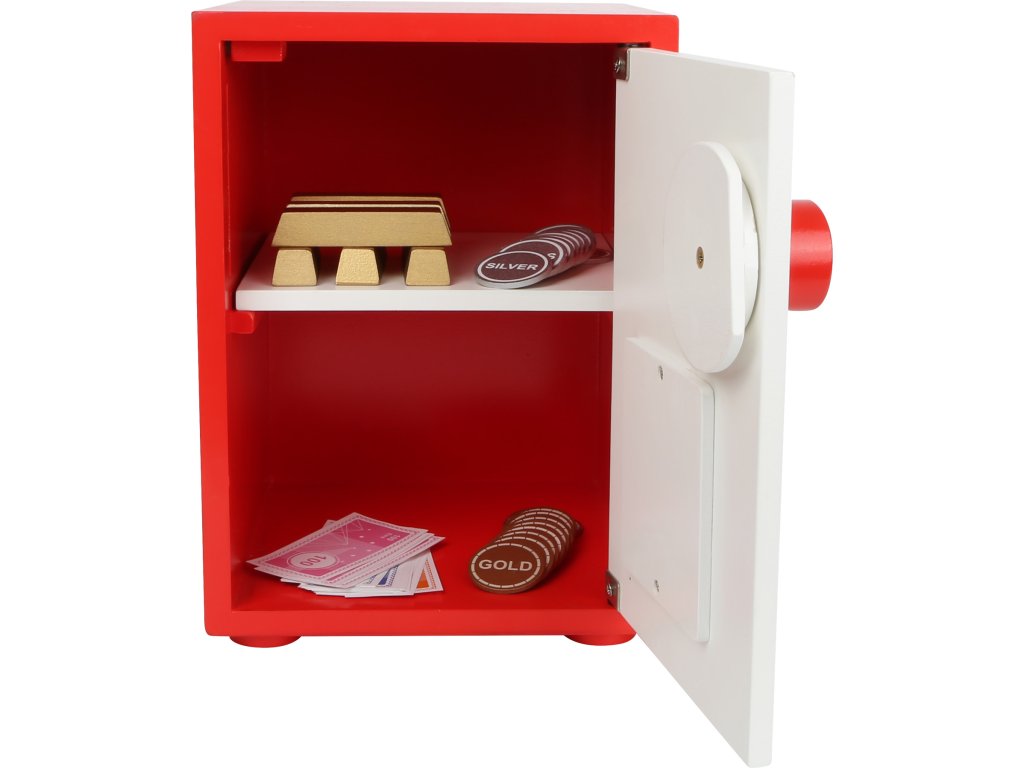 Bankéři a lupiči, pozor! Tento dřevěný sejf je opravdu něco! Při správné kombinaci se sejf otevře a odhalí svá tajemství – Euro bankovky, zlaté a stříbrné mince, ale i cihličky zlata (vyrobené ze dřeva). Otočný zámek vydává zvuk a tlačítka se dají mačkat. Hlavní vlastnosti: obsahuje 68 ks příslušenstvíotáčivý cvakající ciferník a mačkací tlačítka pro zadání kóduvhodné pro hraní rolí či na úschovu vlastních drobných pokladů
