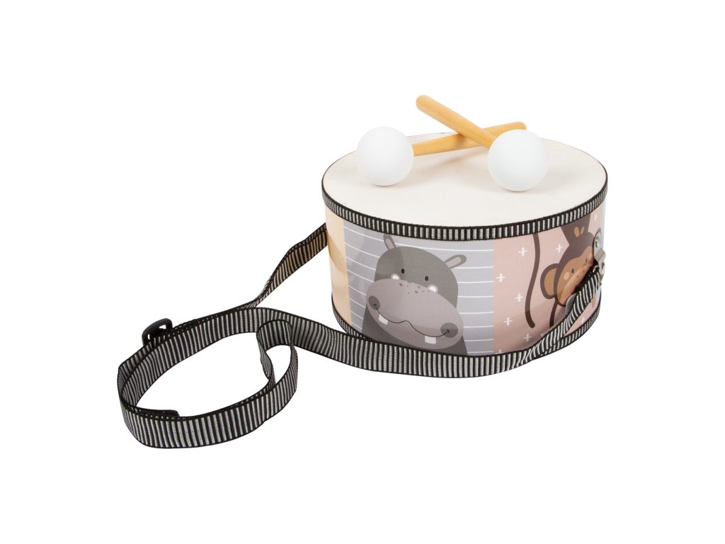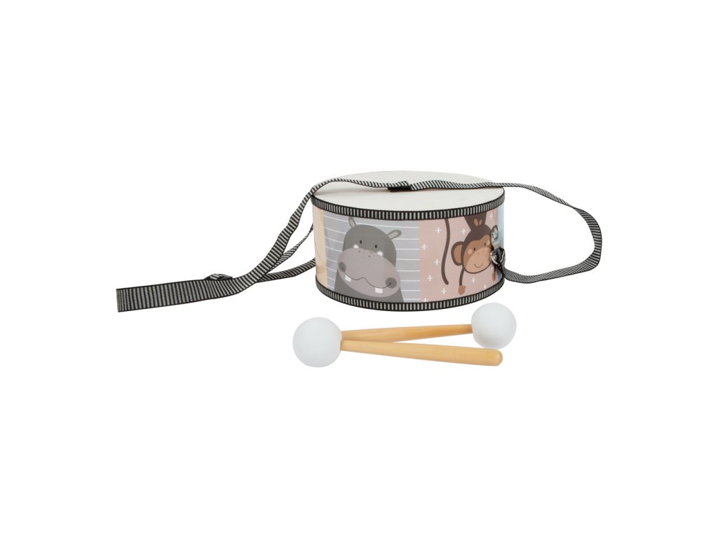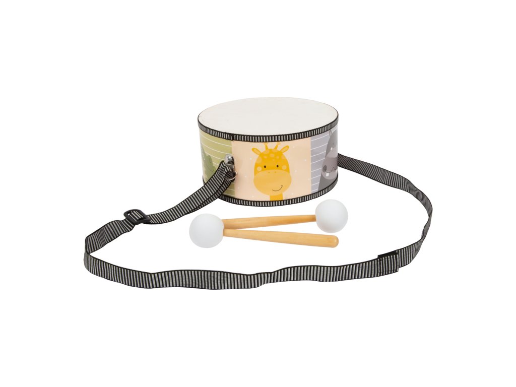V rytmech divočiny! S bubínkem dekorovaným zvířátky ze safari mohou děti získat své první hudební zkušenosti. Je dodáván s dvojicí paliček s pěnovými zakončeními pro příjemný zvuk vzbuzující veselou náladu. Díky praktickému, nastavitelnému popruhu s ním děti mohou vyrazit na pochod. Popruh je pro větší bezpečnost a pohodlné odepínání vybaven zapínáním na suchý zip. Svou barevností a motivy se hravě stane ozdobou každého dětského pokoje. Hlavní vlastnosti:bubínek a 2 paličkynastavitelný popruh