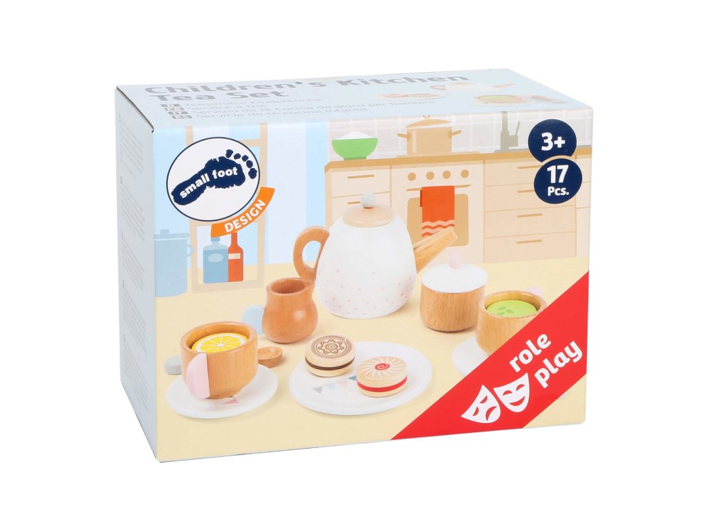 Máte chuť na lahodný čaj, nebo kávu se zákuskem? Zprostředkujte svým dětem možnost sehrát roli způsobných hostitelů, nechejte se obsloužit a vychutnejte si s nimi sladkou přestávku! S bohatou čajovou soupravou mohou děti rozvíjet fantazii, učit se pravidlům servisu a společenskému chování. Překvapí Vás pečlivým zpracováním z masivního dřeva, součásti jsou robustní a zvláště přizpůsobené dětským ručkám. Přírodní materiál dovedně přiznává a hravě kombinuje s jemnými pastelovými odstíny. Provedení klade důraz na detail, víčka konvičky i cukřenky jsou proto odnímatelná a hra může být ještě uvěřitelnější. Sadou můžete vhodně doplnit dětskou kuchyňku, stánek, nebo makety dezertů. Hlavní vlastnosti:konvička s víčkem, 2 šálky s podšálky a lžičkami, 3 různé kapsle náplní, mlékovka, cukřenka s víčkem, talířek a 2 makety sušenekatraktivní a robustní provedení z masivního dřeva