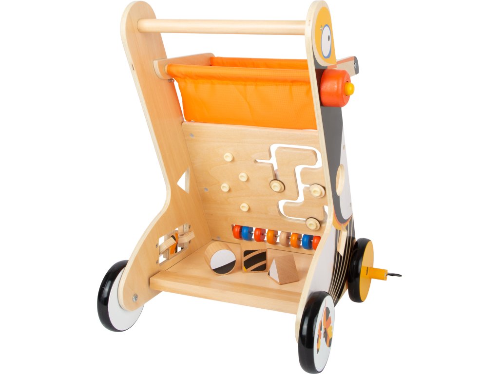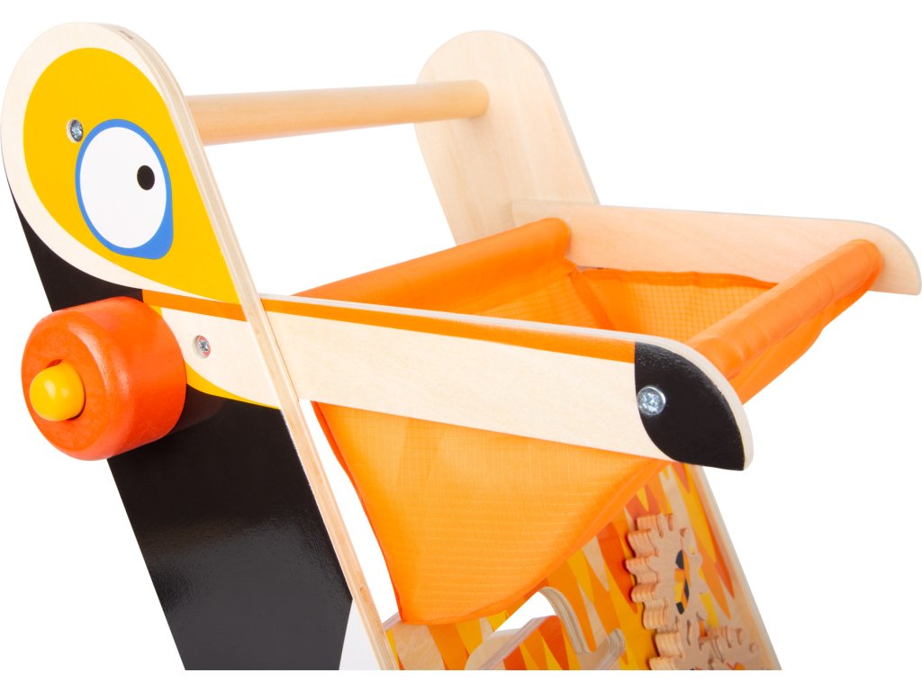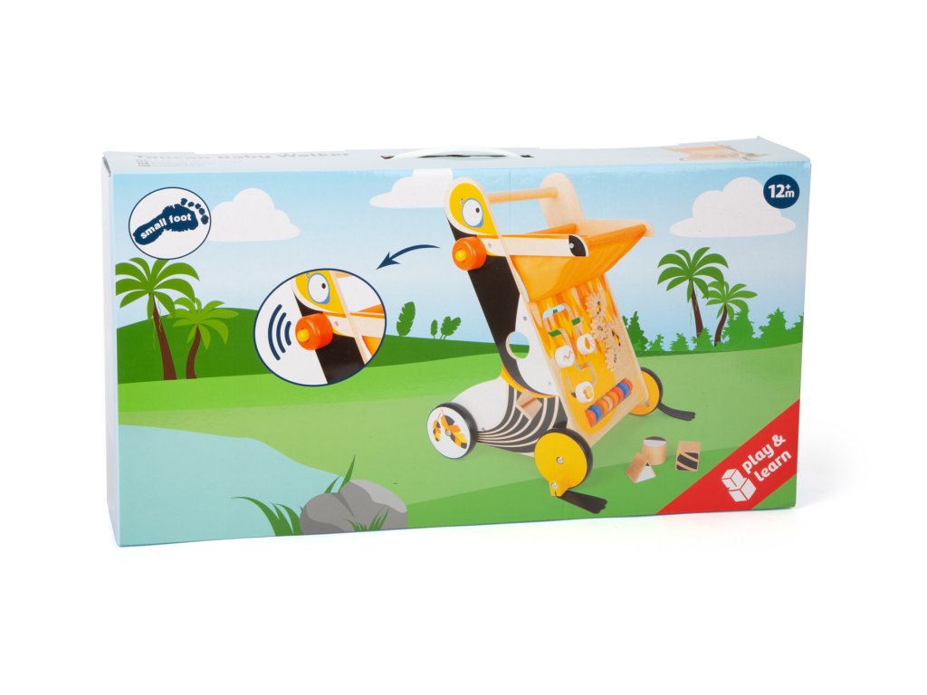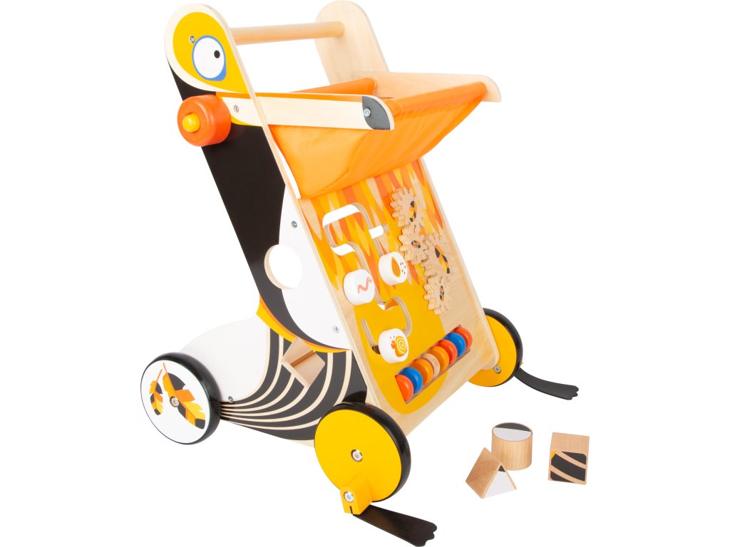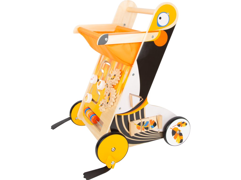 To je ale krásný ptáček! Nevšední dětské chodítko tukan dětem nabídne hru i zábavu v jednom. Chodítko nabízí různé aktivity na 3 stranách, například vkládačku, počítadlo, posuvný labyrint, ozubená kolečka... Podpoří děti při chůzi a také potrénuje jejich jemnou motoriku. „Zobák“ a spodní část chodítka nabízejí úložný prostor pro dřevěné kostky či jiné hračky. Tukan má na předních kolech „nožičky“, které při pohybu vydávají vtipný zvuk. Pogumovaná kolečka také zajištují tichý chod po pevných podlahách. Chodítko je dřevěné a má krásný design. Textilii košíku můžete umýt vlhkým hadrem nebo vyprat. Je praktickým společníkem pro první krůčky, který svým atraktivním a exotickým designem dělá dojem na malé i velké. Hlavní vlastnosti: Obzvláště stabilní, díky robustní konstrukci a trojúhelníkovému tvaru Pogumovaná kola pro tiché a bezpečné ježděníDalší možnosti hraní s dřevěnými vkládacími kostkami , herními prvky, klaksonem, labyrintem a ozubenými koly Klapající nožičky vydávají při jízdě vtipné zvuky Zobák a spodní díl mohou být také praktické úložné prostory Úložný koš (zobák) je vyroben ze snadno udržovatelné a čistitelné látky