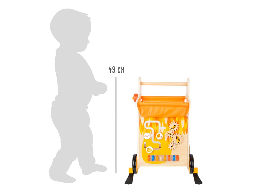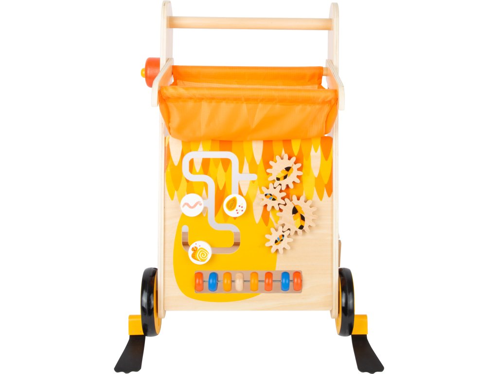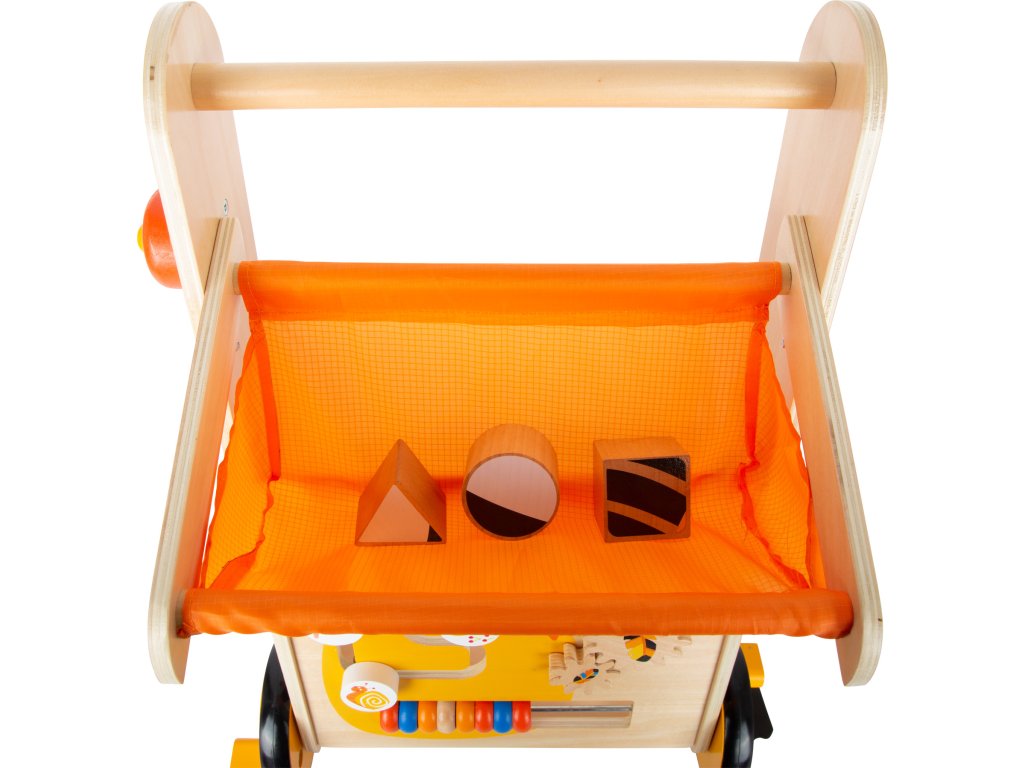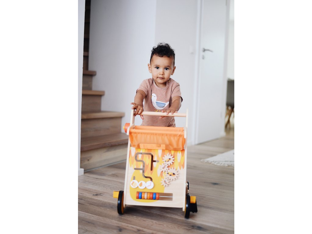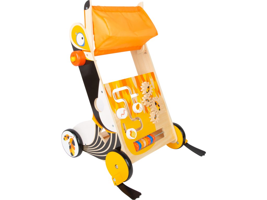 To je ale krásný ptáček! Nevšední dětské chodítko tukan dětem nabídne hru i zábavu v jednom. Chodítko nabízí různé aktivity na 3 stranách, například vkládačku, počítadlo, posuvný labyrint, ozubená kolečka... Podpoří děti při chůzi a také potrénuje jejich jemnou motoriku. „Zobák“ a spodní část chodítka nabízejí úložný prostor pro dřevěné kostky či jiné hračky. Tukan má na předních kolech „nožičky“, které při pohybu vydávají vtipný zvuk. Pogumovaná kolečka také zajištují tichý chod po pevných podlahách. Chodítko je dřevěné a má krásný design. Textilii košíku můžete umýt vlhkým hadrem nebo vyprat. Je praktickým společníkem pro první krůčky, který svým atraktivním a exotickým designem dělá dojem na malé i velké. Hlavní vlastnosti: Obzvláště stabilní, díky robustní konstrukci a trojúhelníkovému tvaru Pogumovaná kola pro tiché a bezpečné ježděníDalší možnosti hraní s dřevěnými vkládacími kostkami , herními prvky, klaksonem, labyrintem a ozubenými koly Klapající nožičky vydávají při jízdě vtipné zvuky Zobák a spodní díl mohou být také praktické úložné prostory Úložný koš (zobák) je vyroben ze snadno udržovatelné a čistitelné látky
