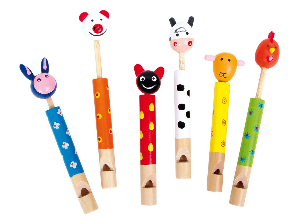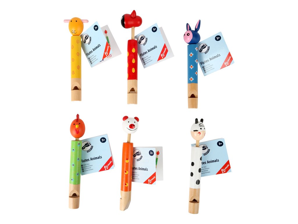 Jasně barevné dětské flétny ze dřeva s roztomilými zvířecími hlavami aneb první zkušenosti s muzicírováním. Přehrávaný tón lze jednoduše měnit tažením dřevěné tyče. Zahrajte si s krávou, kohoutem, oslem a dalšími zvířátky první melodie. Nejedná se o hudební nástroj, ale o hračku. Hlavní vlastnosti: sada obsahuje 6 kusů píšťalek jednoduché ovládánírozvíjí talent dětí, cit pro rytmus a melodii
