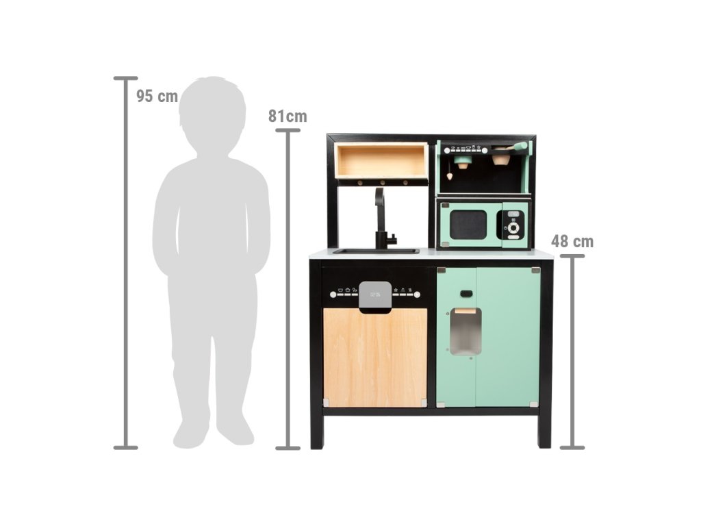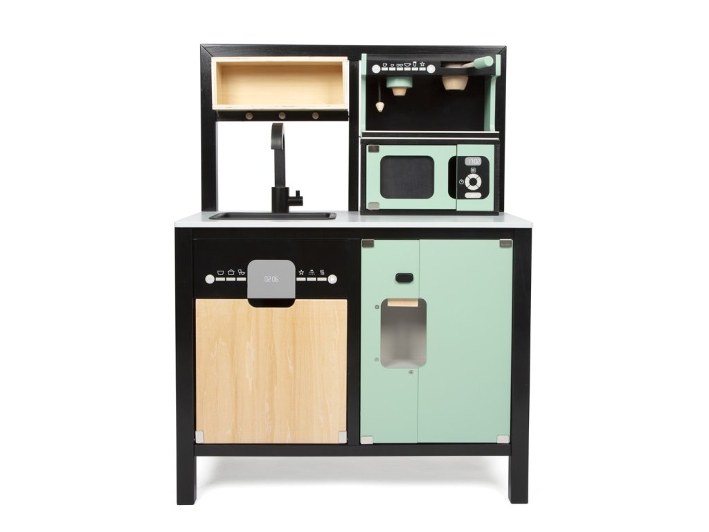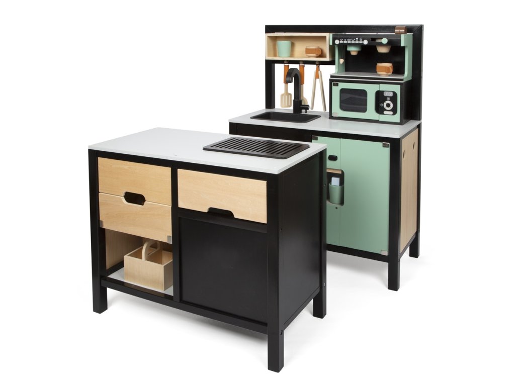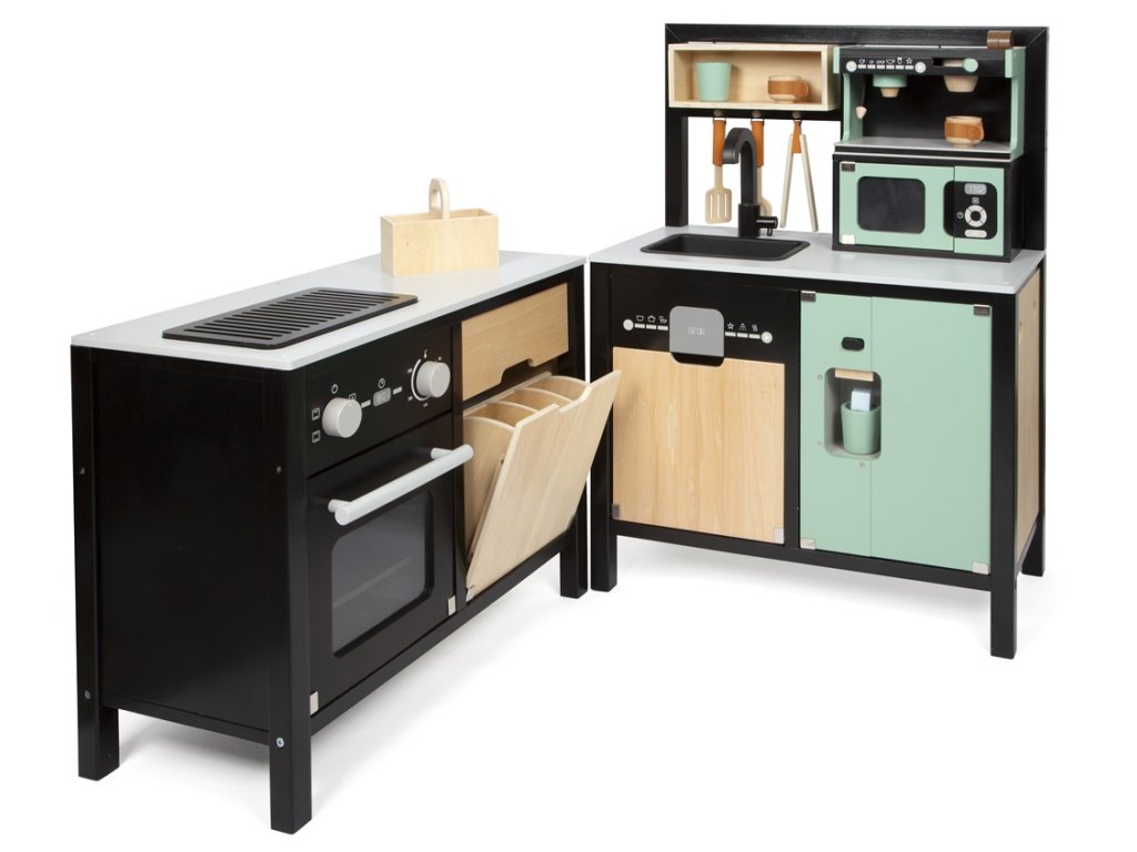Tato dřevěná dětská kuchyňka v industriálním designu nabízí vše, co malé kuchařky nebo kuchaři potřebují pro vaření. Předností je moderní vzhled ve stylové barevné kombinaci černého rámu a přírodního dřeva, praktický kuchyňský ostrůvek, který se dá použít samostatně nebo přidat k dalšímu dílu a vytvořit rohovou kuchyňskou sestavu. A tolik spotřebičů, nádobí a doplňků! Součástí je mimo jiné varná deska, trouba, mikrovlná trouba, lednice s výrobníkem ledu, kávovar, odpadkový koš, 3 kusy kuchyňského náčiní, hrnec s poklicí, pánev, 2 šálky na kávu, kelímky a 3 kostky ledu. Dvířka se samozřejmě dají otevírat. Hlavní vlastnosti: podporuje děti v dlouhotrvající představivé hřerůzné odkládací a úložné prostoryrozvíjí hru na role a sociální dovednosti