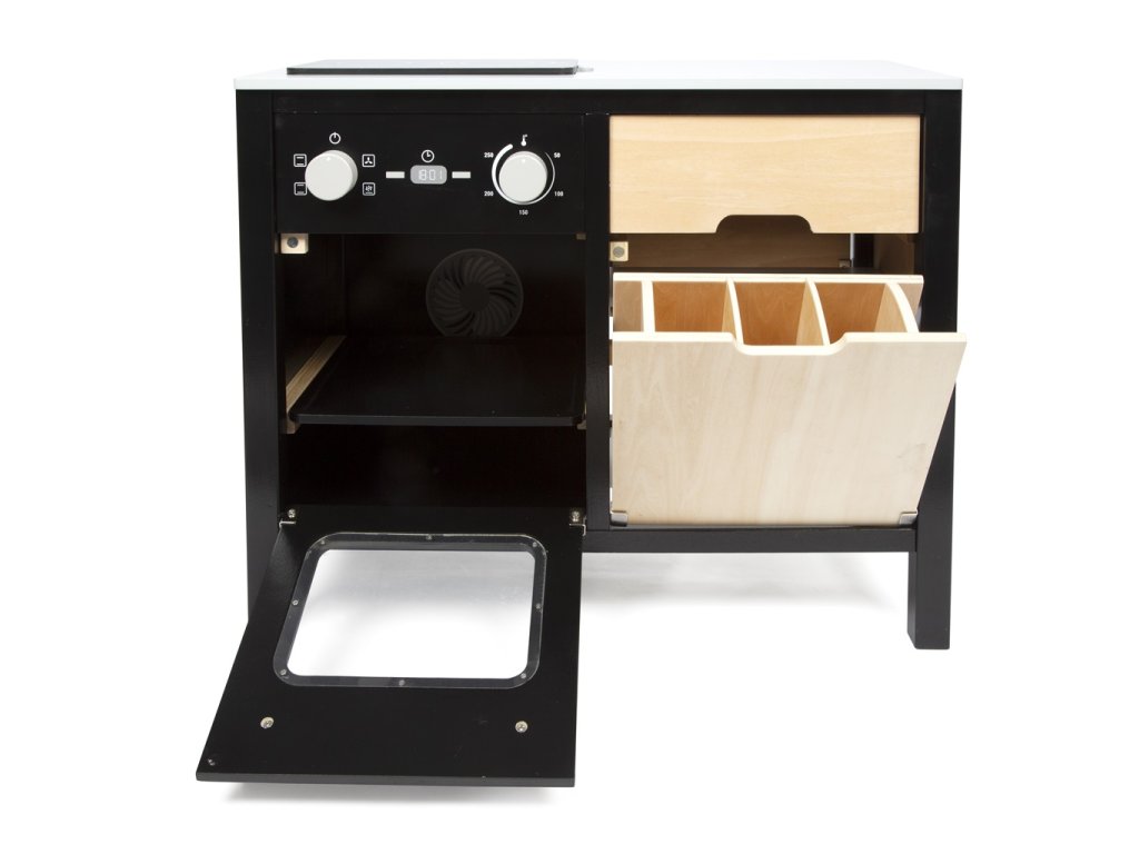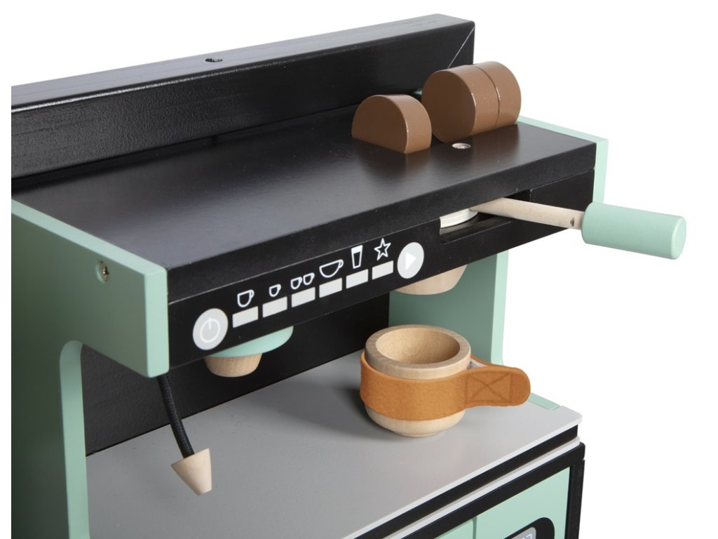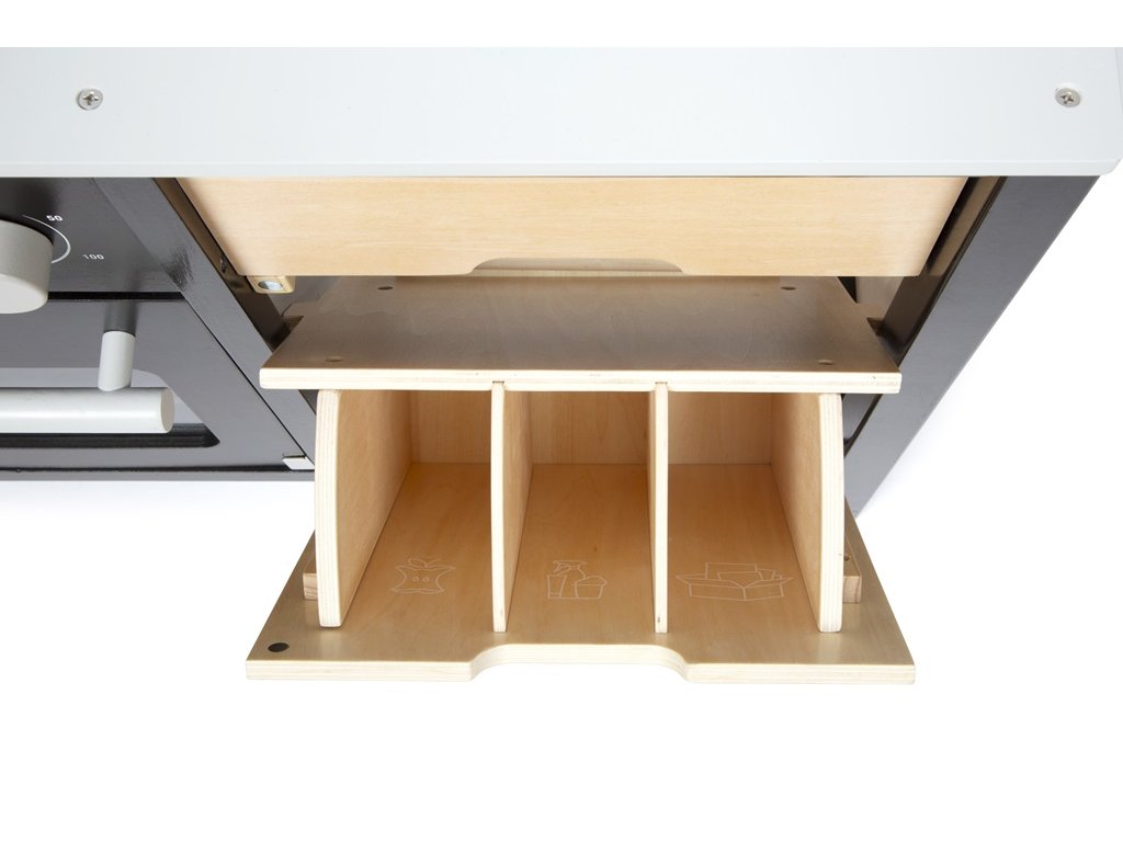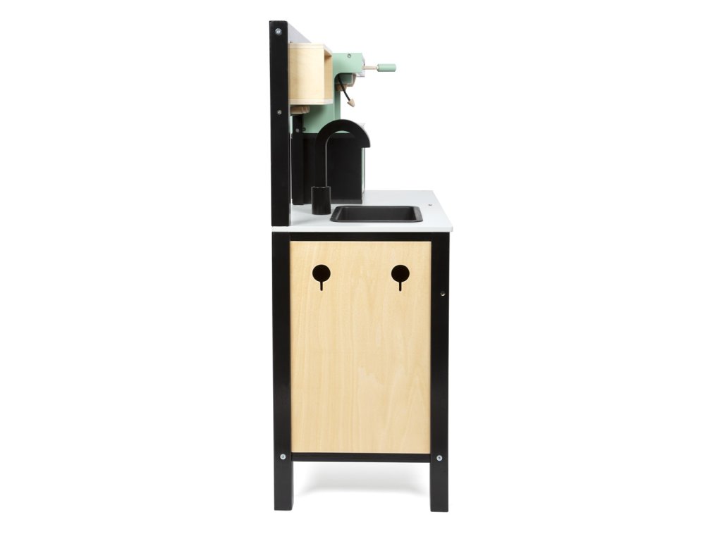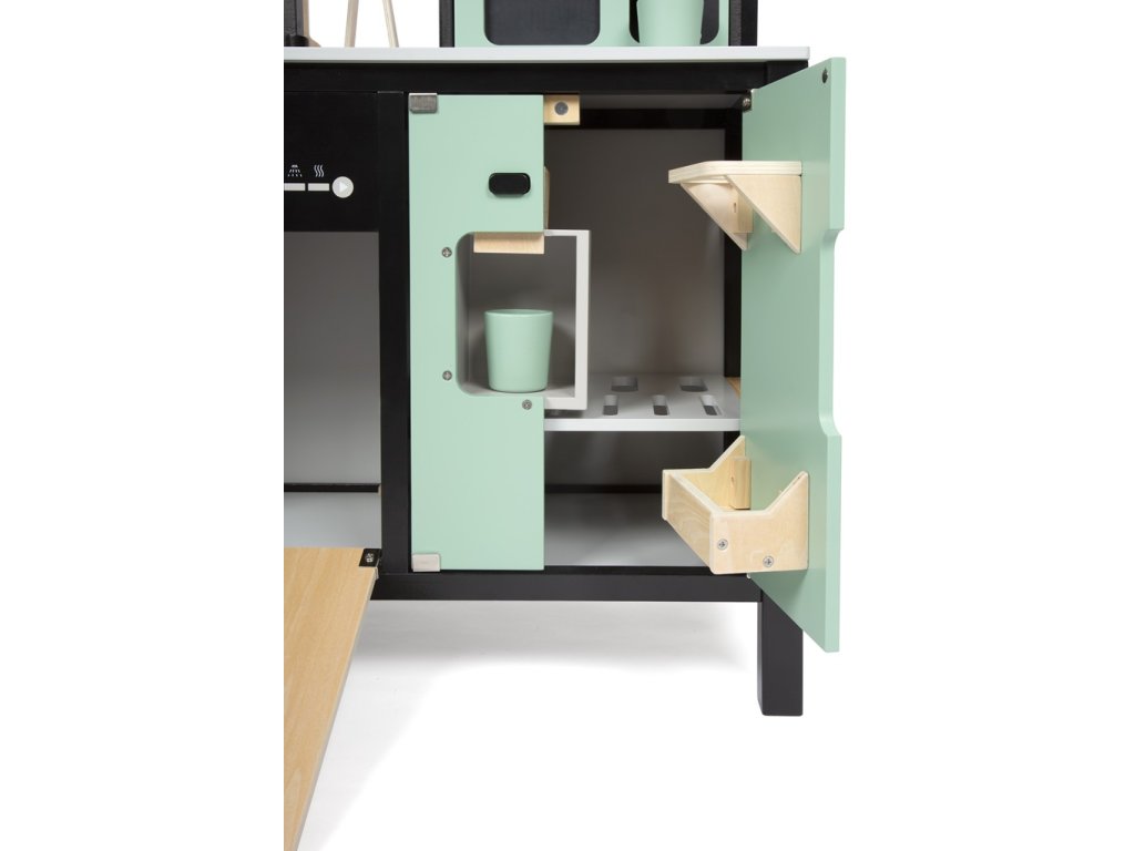 Tato dřevěná dětská kuchyňka v industriálním designu nabízí vše, co malé kuchařky nebo kuchaři potřebují pro vaření. Předností je moderní vzhled ve stylové barevné kombinaci černého rámu a přírodního dřeva, praktický kuchyňský ostrůvek, který se dá použít samostatně nebo přidat k dalšímu dílu a vytvořit rohovou kuchyňskou sestavu. A tolik spotřebičů, nádobí a doplňků! Součástí je mimo jiné varná deska, trouba, mikrovlná trouba, lednice s výrobníkem ledu, kávovar, odpadkový koš, 3 kusy kuchyňského náčiní, hrnec s poklicí, pánev, 2 šálky na kávu, kelímky a 3 kostky ledu. Dvířka se samozřejmě dají otevírat. Hlavní vlastnosti: podporuje děti v dlouhotrvající představivé hřerůzné odkládací a úložné prostoryrozvíjí hru na role a sociální dovednosti