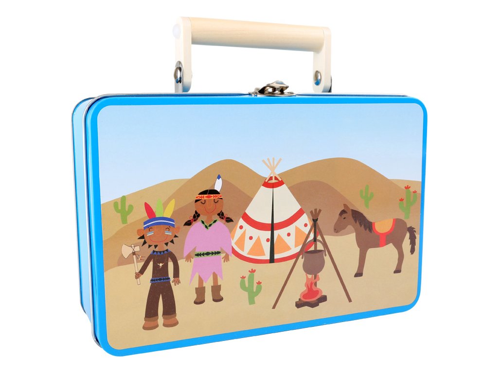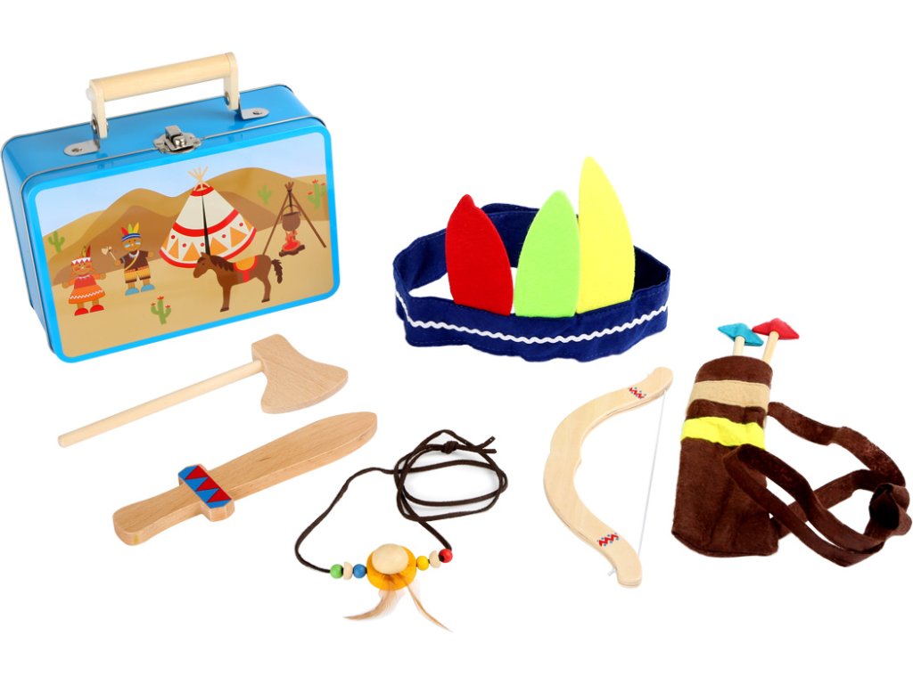 Představte si zvuk bubnů v dálce, pohled na rozlehlé prérie a vzrušení z dobrodružství na Divokém západě. Nyní můžete přenést tuhle magickou atmosféru přímo do dětského pokoje s naším "Small Foot Dětským kufrem - indiánská sada"! Nechte své děti objevovat svět fantazie, kde se stávají hrdými indiány, mistři lukostřelby a statečnými průzkumníky nekonečných plání. Vinnetou by při pohledu na tento kufr zbledl závistí! Každý detail indiánské sady je navržen s láskou a péčí. Plstěná čelenka zdobená třemi pestrobarevnými peříčky, luk a šíp v plstěném toulci, a sekera s nožem zdobené koženými řemínky a korálky– vše je připraveno pro autentické dobrodružství. A co víc? Součástí je i indiánský náhrdelník, který dodá vašemu malému válečníkovi ten pravý šmrnc. Sledujte, jak se oči vašeho dítěte rozzáří, když poprvé otevře tento kovový kufr plný pokladů a stanou se mistrem svého imaginárního světa. Naše indiánská sada, vyrobená s unikátním německým designem, ztělesňuje kvalitu a bezpečnost, abyste vy mohli mít klid na duši, zatímco vaše děti si vytvářejí nezapomenutelné vzpomínky. A navíc, naše láska ke dřevu a závazek k udržitelnosti znamená, že každý kus této sady je krokem k lepší budoucnosti. Sledujte, jak se fantazie vašeho dítěte rozkvétá na pozadí Divokého západu Hlavní vlastnosti: 7 dílů (1 kovové pouzdro, 1 nůž, 1 sekera, 1 řetízek, 1 čelenka, 1 luk, 2 šípy, 1 plstěný šáček)praktický přenosný kufřík