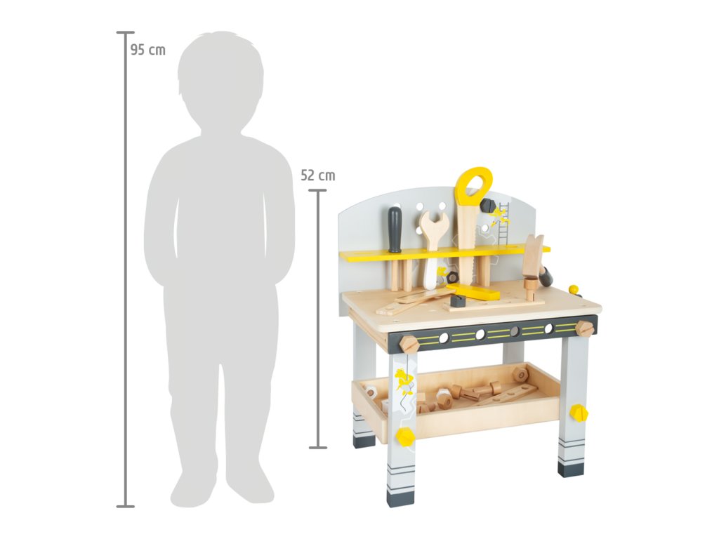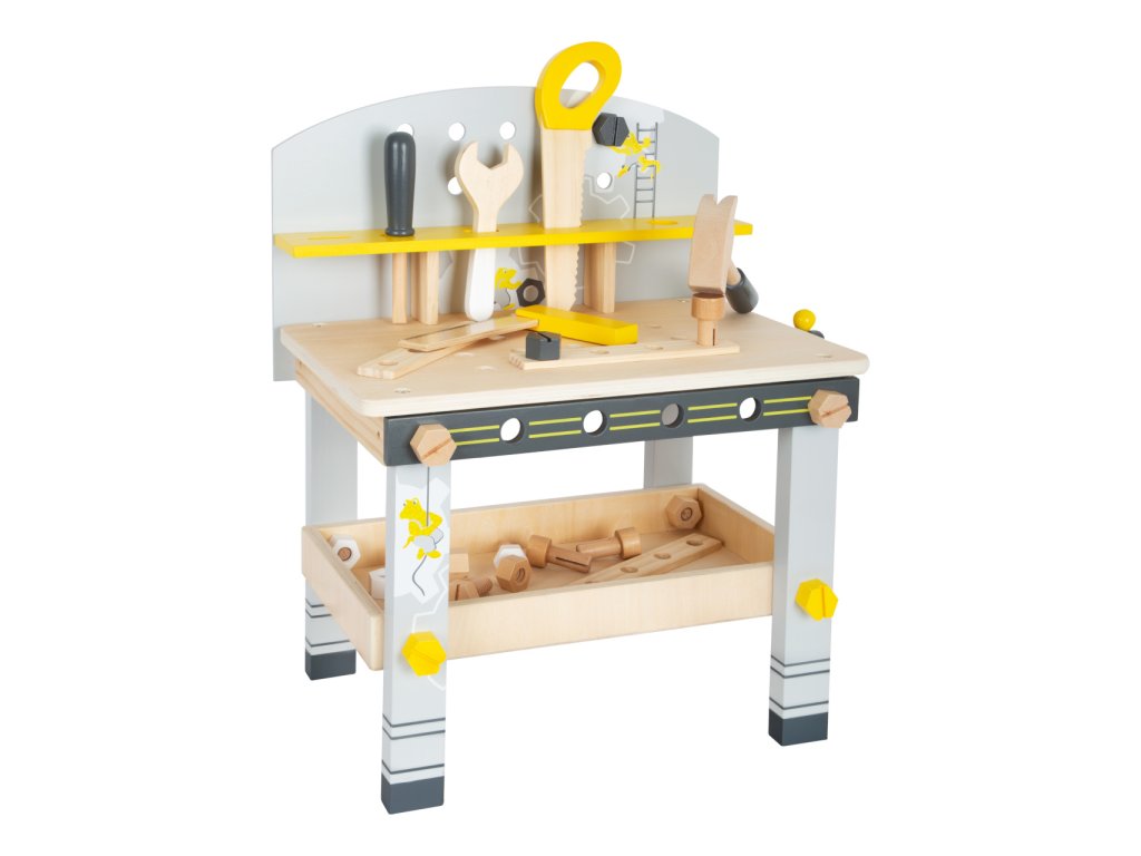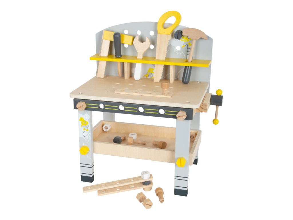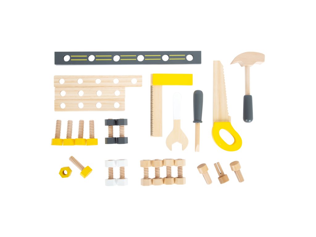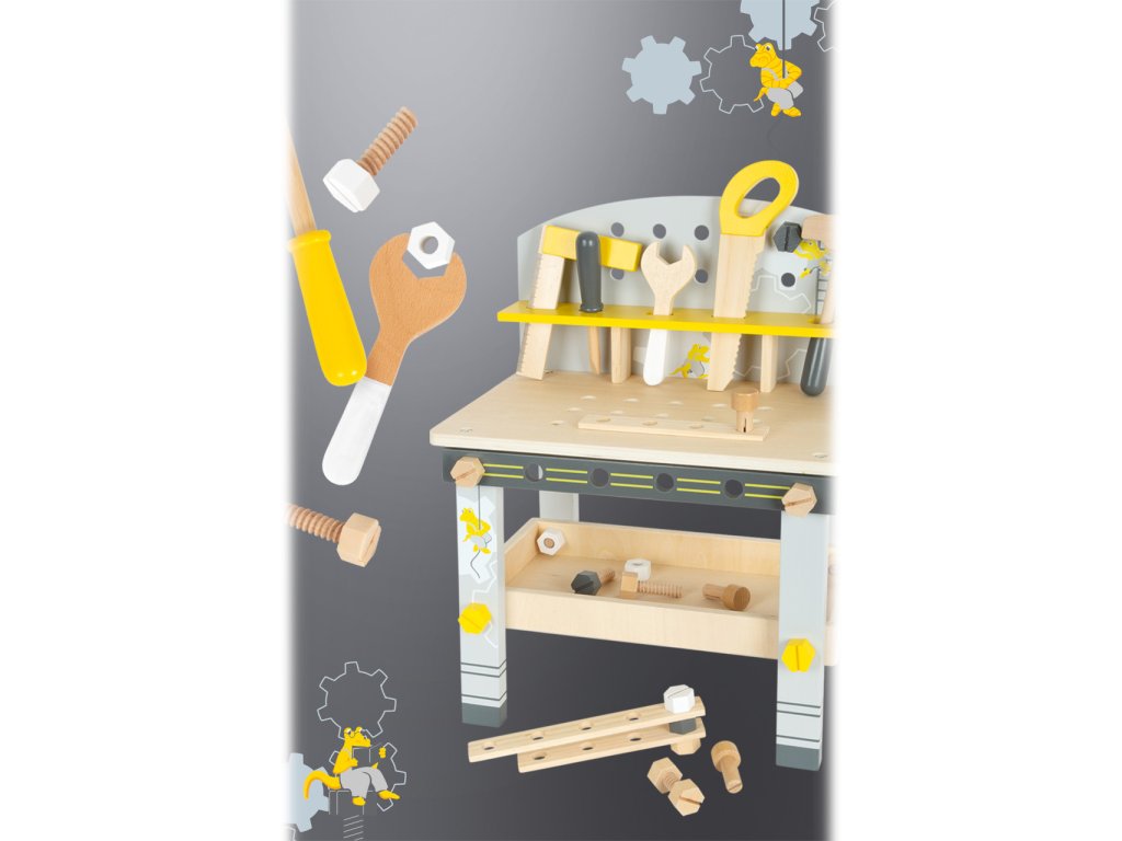 V této dílně se toho děje opravdu hodně. S tímto kompaktním ponkem v klasických barvách, který je viditělně dřevěný si děti mohou otestovat svou zručnost. Děti vám také mohou pomoci se složením tohoto herního ponku! Všechno nářadí a doplňky můžete do ponku uložit tak, aby nezabíraly moc místa. V balení 5 kusů nářadí a mnoho doplňků – 1 svěrák, 3 perforované dřevěné pásky, 1 metr, 1 pilka, 2 šroubováky, 1 kladivo, 5 šroubů, 5 matek, 3 dřevěné hřebíky. Hlavní vlastnosti rozmanitá hra na kompaktním ponkupěkné barvy s viditelným dřevempět ks dřevěného nářadí a svěrákděti mohou pomoci se složením ponkujednoduché uložení nářadí a doplňkůpěkné dětské ilustrace Miniwob MiniwobSeznamte se s malými woby, nadšenými krokodýlími kutily! S jejich pomocí jde všechna práce jako po másle a žádná stavba není dost velká a promyšlená. Pestrá řada nástrojů a nářadí skýtá dokonalou zábavu pro všechny malé řemeslníky, jejich prostřednictvím mohou být kreativní a realizovat všechny své fantastické nápady. Jednotlivé sady je možno mezi sebou kombinovat a rozšiřovat s rostoucími dovednostmi dětí. Díky jednotícímu barevnému motivu a vyobrazením roztomilých Wobů je možno vytvořit jedinečný a ucelený dílenský koutek, který bude zároveň hodnotnou stavebnicí rozvíjející zručnost a představivost.