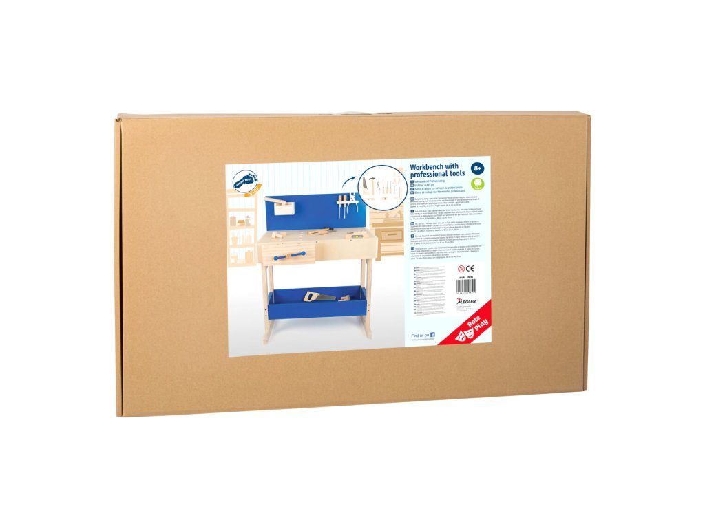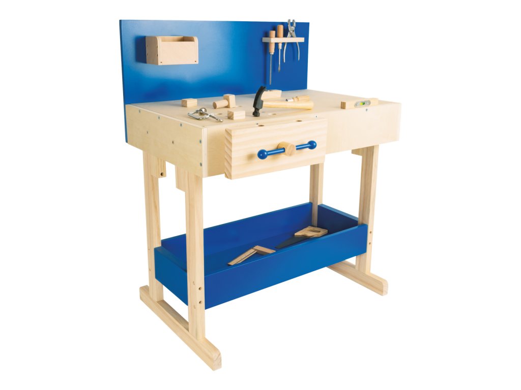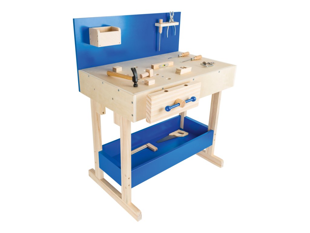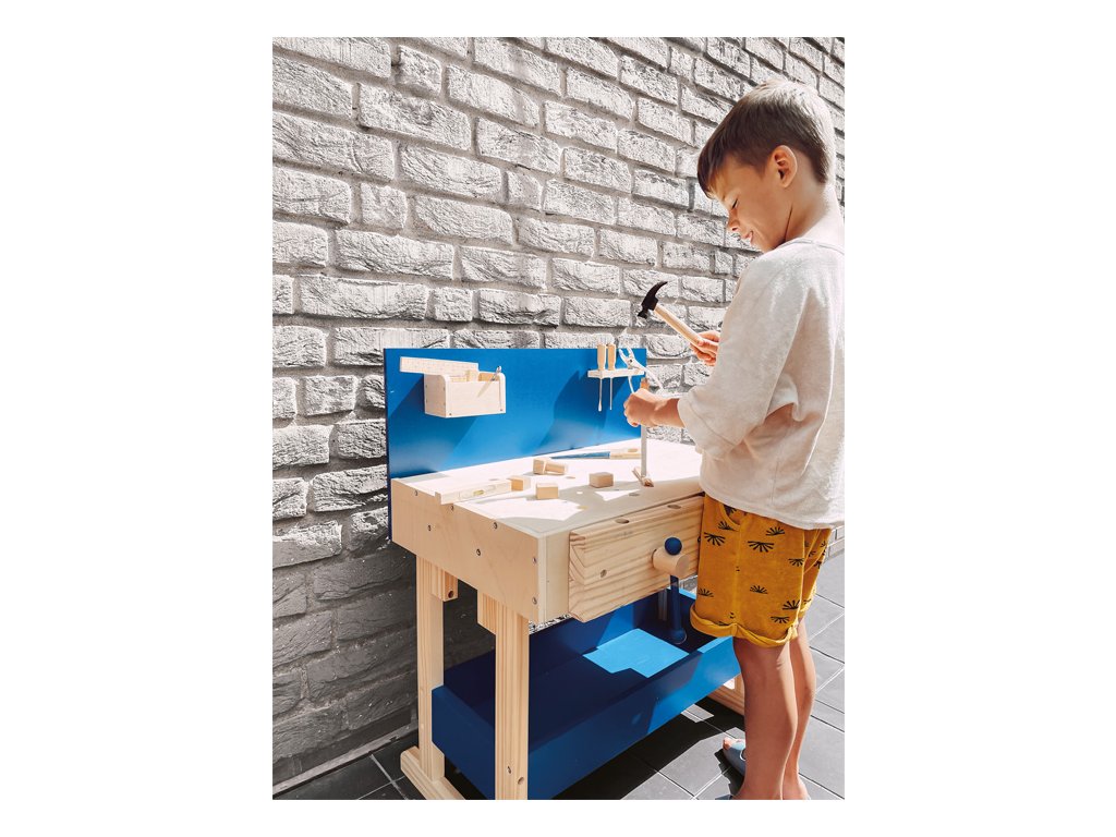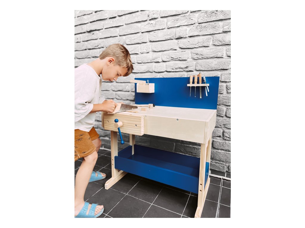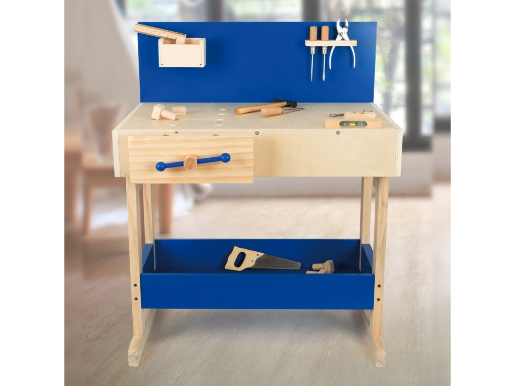 Dřevěný ponk vyrobený z masivu s policemi v modré barvě. Pod pracovní deskou, kterou lze přizpůsobit výšce dítěte, je úložná police na nářadí. Zadní stěna ponku je opatřena praktickým držákem na nářadí a úložnou přihrádkou pro drobné součástky. Nářadí je svými rozměry vhodné pro malé kutily. Je vyrobeno z pevného dřeva a kovu a je tak skutečně funkční. Pro nadšené malé kutily bude tento ponk inspirací k tvorbě a poznávání nářádí, materiálů a výrobních technologií. V neposlední řadě si kutilové prohloubí manuální zručnost. Hlavní vlastnosti: robustní kostrukce14 ks příslušenstvívýškově nastavitelná velká pracovní plochanabádá ke kreativní hřevhodné pro praváky i leváky