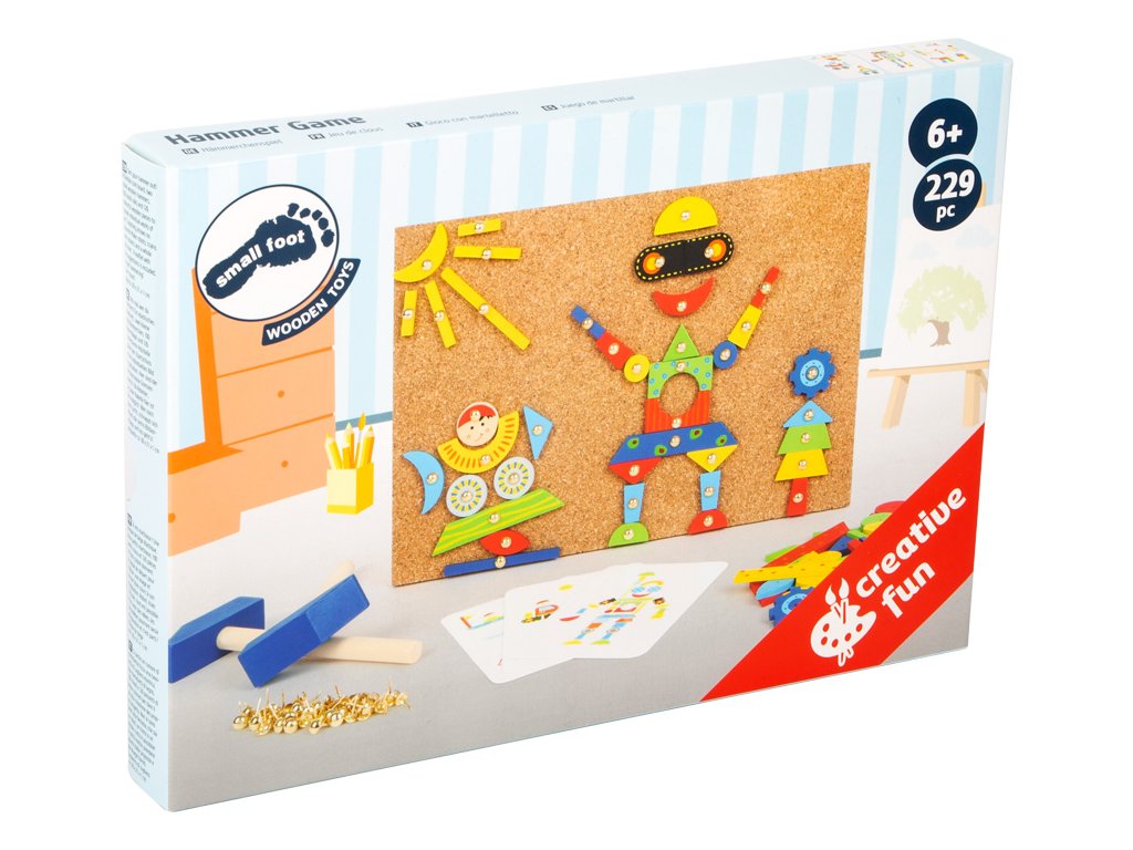 V balení najdete korkovou desku, kladivo, připínáčky a dřevěné objekty různých tvarů. Děti si mohou na desce/nástěnce díky zatloukačce vytvořit různé obrázky. Ať je to robot nebo raketa, tato sada obsahuje vše k vytvoření kouzelného obrazu. V balení najdete také obrázkové předlohy, z kterých se děti mohou inspirovat. Tato hra podporuje rozvoj kreativity a dá dětem vlastní prostor pro tvoření. Hlavní vlastnosti: podporuje kreativitu a koncentracipodporuje jemnou motoriku