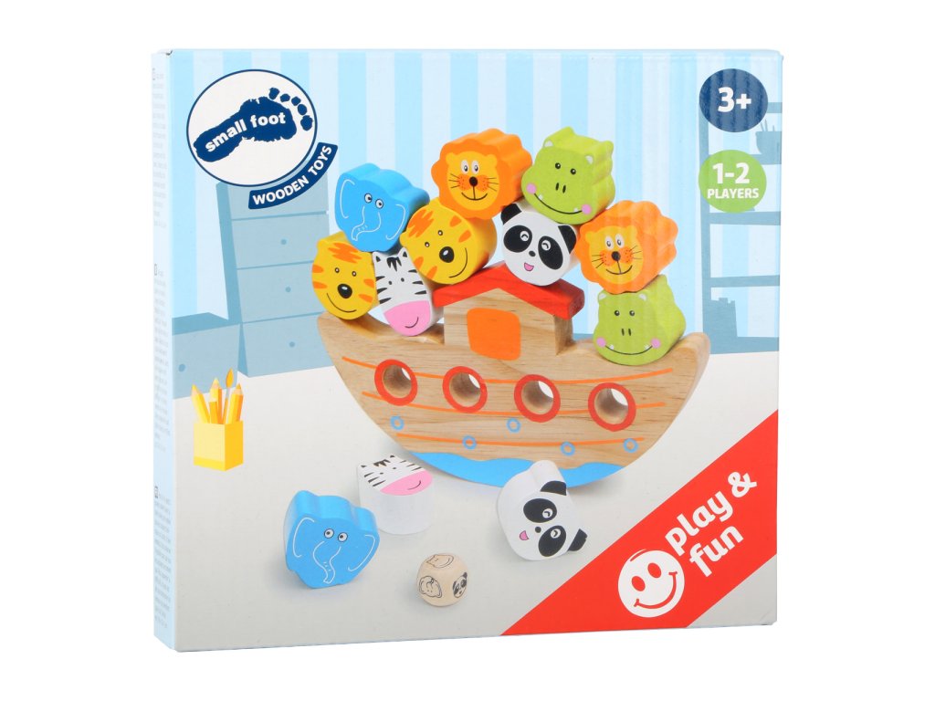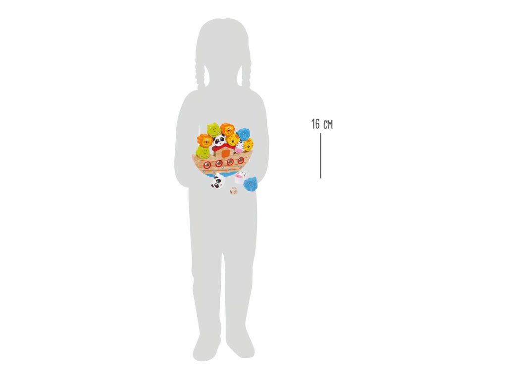 Při této hře musí být na sebe zvířata stavěna tak, aby archa nebyla vyvedena z rovnováhy a pasažéři nespadli dolů. Krásná hra na zkoušku šikovnosti z barevně lakovaného dřeva, pro trénink jemné motoriky a trpělivosti. Malá kostka určuje symboly, které zvířátko má být postaveno na archu. Lze však hrát i bez kostky, aby se tak snížila obtížnost hry. Hlavní vlastnosti: dětská dovednostní hra ze dřeva pro celou rodinu12 zvířat, archa a hrací kostkavysoce kvalitní zpracováníprocvičuje soustředění, jemnou motoriku a zručnost