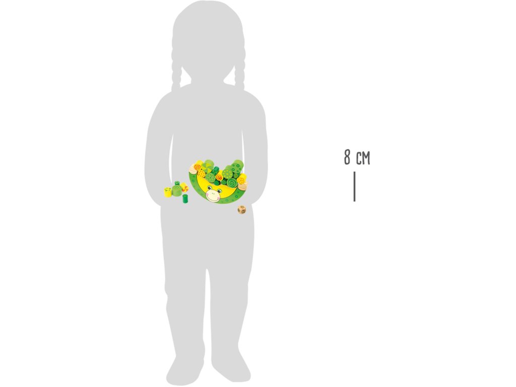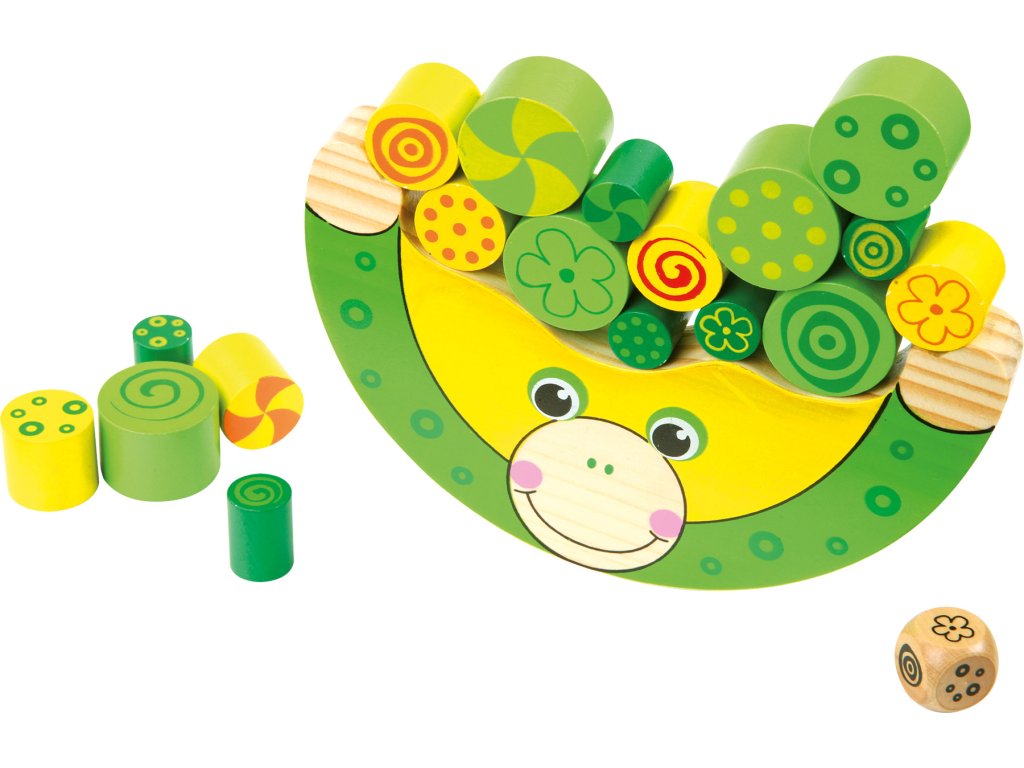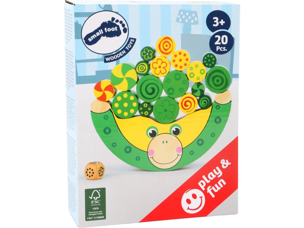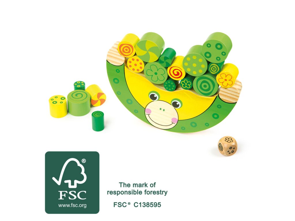 Dřevěná hra, při které si děti procvičují jemnou motoriku, úsudek, logické myšlení a trpělivost. Hra je určena pro 1-4 hráče. Velikost padnoucí přesně do malých ručiček a umožňuje hodiny a hodiny kreativní zábavy. Vyrobeno ze 100% FSC certifikovaného dřeva. Pravidla hry: Položte žábu na rovnou plochu. 1 hráč: Hoď kostkou a příslušnou barvu polož na žabku. Hoď kostkou znovu a umísti další barevný váleček. Ujisti se, že žába drží rovnováhu a nespadne. Pokračuj ve hře do doby, než umístíš poslední váleček. Pokud ztratí žába rovnováhu a válečky spadnou, začni od začátku. 2 až 4 hráči: V házení kostkou a umísťování válečků se střídejte. Hráč, jehož váleček spadne, je vyřazen ze hry. Ostatní pokračují ve hře. Hlavní vlastnosti: vyrobeno ze 100% FSC certifikovaného dřevarozvíjí motoriku Značka a certifikát FSC® (Forest Stewardship Council) zaručuje, že dřevo, ze kterého byl produkt vyroben, nebylo vytěženo nelegálně a pochází z lesů obhospodařovaných šetrným či přírodě blízkým způsobem, ve kterém jsou dodržovány přísné environmentální a sociální požadavky. Značka FSC® na výrobku znamená, že svým nákupem pomáháte chránit lesy a podporujete šetrné, odpovědné či přírodě blízké hospodaření, díky kterému jsou naše lesy stabilnější, zdravější, mají přirozenou druhovou skladbu a lépe odolávají negativním následkům klimatických změn.