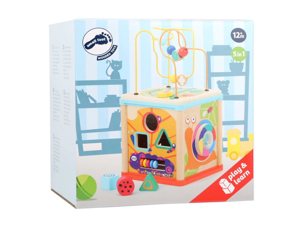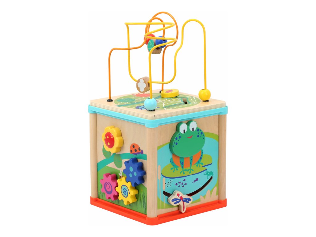 Motorická kostka nabízí na svých stěnách mnoho příležitostí ke hrám a zábavě. Dětskou zručnost a orientaci v prostoru lze přirozeně rozvíjet korálkovým bludištěm na víku, vkládačkou, nebo ozubenými kolečky. Kostka je bohatě dekorována pestrobarevnými motivy s mnoha roztomilými zvířátky, ty mohou zároveň s rozmanitými tvary, chrastítkem a dalšími atrakcemi pomoci různými způsoby zdokonalovat poznávací dovednosti dětí. Hračka je vyrobena ze silné překližky a odolného nezávadného plastu, můžet tak nabídnout vysokou životnost. Díky otočnému víku je prakticky skladná a lze ji hravě umístit do poličky, kterou zpestří svou barevností. Hlavní vlastnosti:kostka s víkem a 3 díly vkládačky5 stěn s různými atrakcemirobustní a odolné provedení