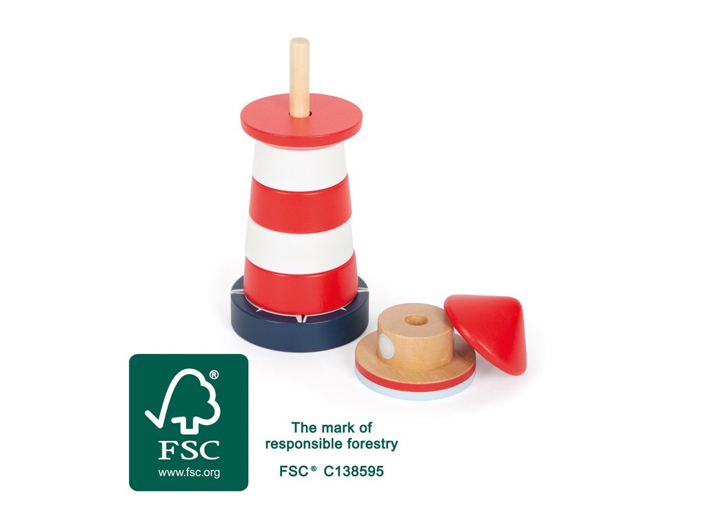 Barevná stohovací věž vyrobená ze 100% certifikovaného dřeva FSC®. Ideální zábava skládání v námořním vzhledu pro malé strážce majáků. Tato stohovací věž motivuje i ty nejmenší, aby roztřídili sedm různých stohovacích prvků majáku podle velikosti a složili je na sebe. Vzniká tak skvělý skládací maják, jehož stavba trénuje motoriku, koordinaci ruka-oko a porozumění barvám a velikostem. Ohebný kolík s gumovým uchycením zajišťuje bezpečnost při hře. Tato motorická klasika vhodná pro děti zaručuje dlouhotrvající zábavu. Stohovací maják se také skvěle hodí i jako dekorace do dětského pokoje. Hlavní vlastnosti: sedm barevných dřevěných prvků pro stohování a vkládánísnadno uchopitelné pro malé dětské ručičkytrénink koordinace ruka-oko a motorických dovednostívyrobeno ze dřeva FSC® Značka a certifikát FSC® (Forest Stewardship Council) zaručuje, že dřevo, ze kterého byl produkt vyroben, nebylo vytěženo nelegálně a pochází z lesů obhospodařovaných šetrným či přírodě blízkým způsobem, ve kterém jsou dodržovány přísné environmentální a sociální požadavky. Značka FSC® na výrobku znamená, že svým nákupem pomáháte chránit lesy a podporujete šetrné, odpovědné či přírodě blízké hospodaření, díky kterému jsou naše lesy stabilnější, zdravější, mají přirozenou druhovou skladbu a lépe odolávají negativním následkům klimatických změn.