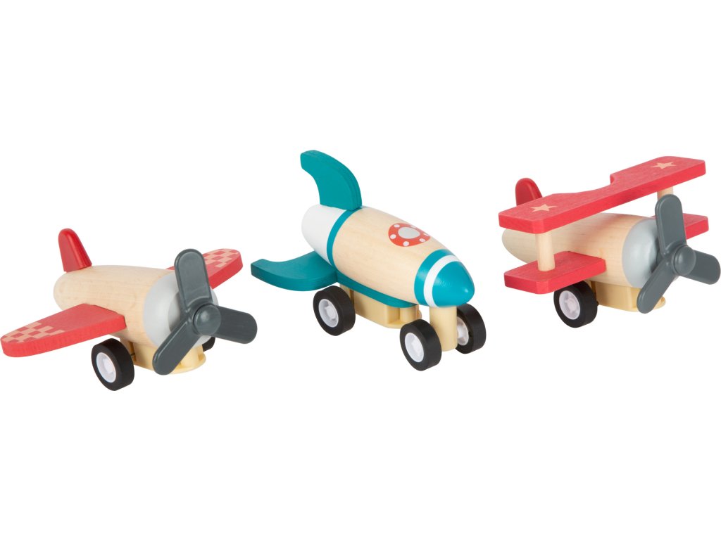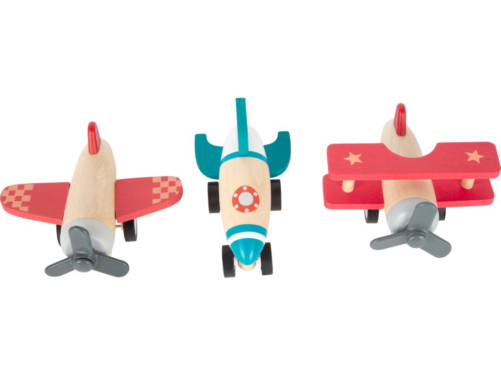 Všichni piloti nechť se dostaví do svých kabin! Tato tři natahovací letadla jsou vyrobena z pevného dřeva. Jsou to vlastně dvě letadla a jedna raketa s podvozkem. Díky vestavěnému natahovacímu mechanismu mohou letadla „vyletět“ vpřed opravdu velkou rychlostí. Které bude rychlejší? Jednoplošník, dvouplošník nebo raketa? Hlavní vlastnosti Raketa a 2 typy letadelNatahovací mechanismusPřírodní i lakované dřevo