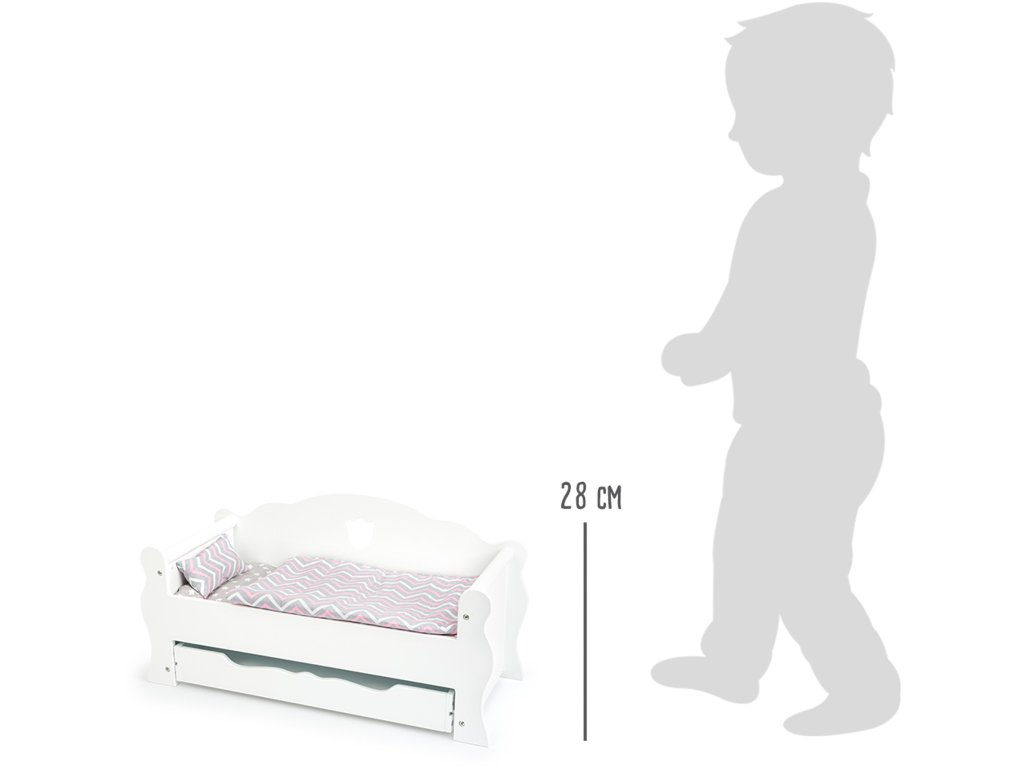 Tuto elegantní postel lze v mžiku proměnit na komfortní pohovku, a tak si najde své využití ve dne i v noci. Do praktického úložného prostoru schováme peřinku a polštář nebo jej využijeme jako místo pro dalšího spáče. Panenky či plyšáci jistě ocení možnost se po náročném dni natáhnout a odpočinout si. Hlavní vlastnosti: vhodné pro panenky do 45 cmpraktický výsuvný úložný prostor pod postelísoučástí matrace, peřinka a polštář