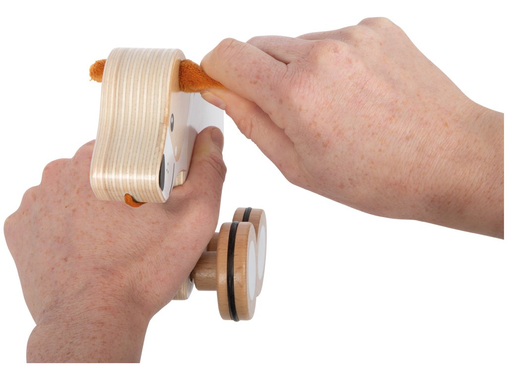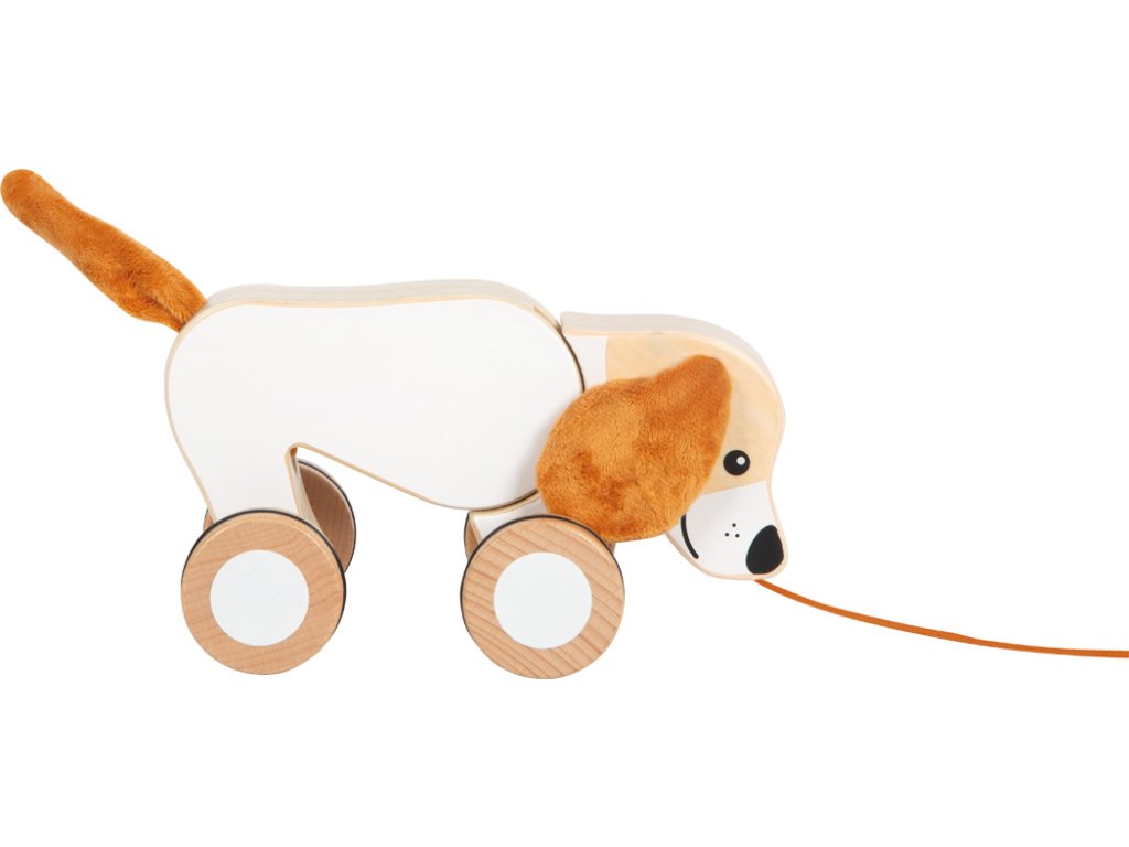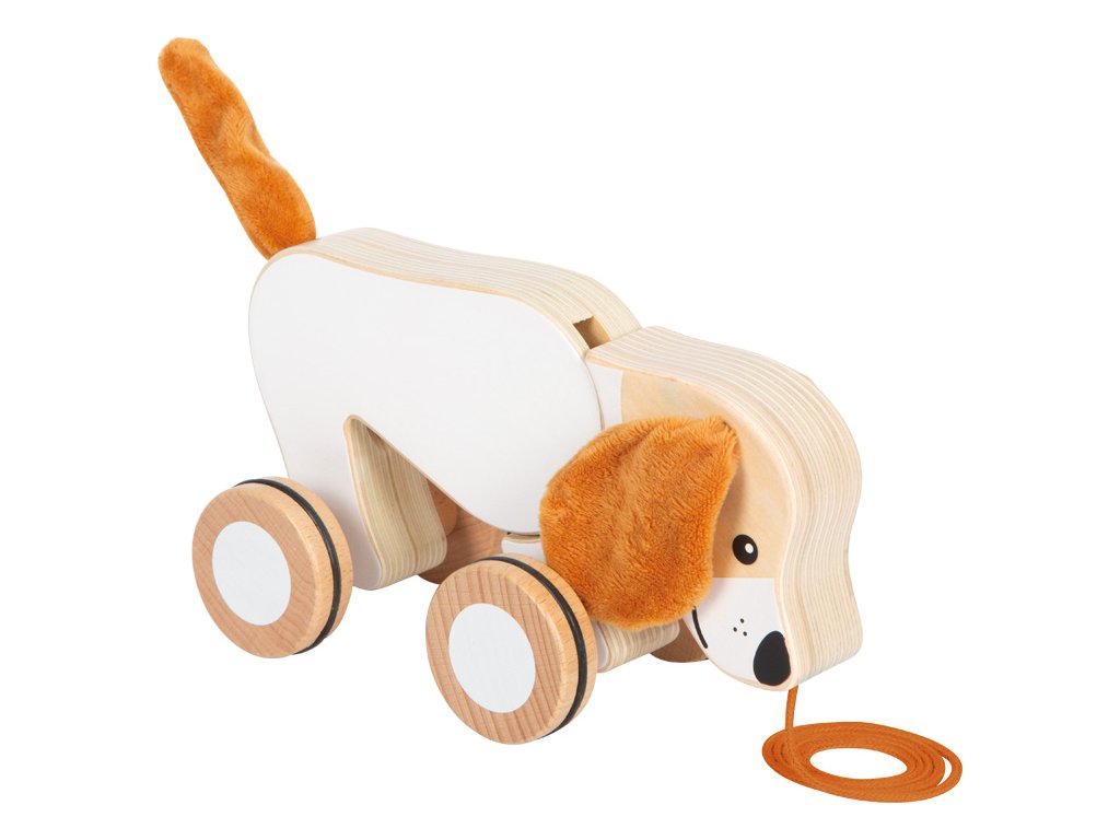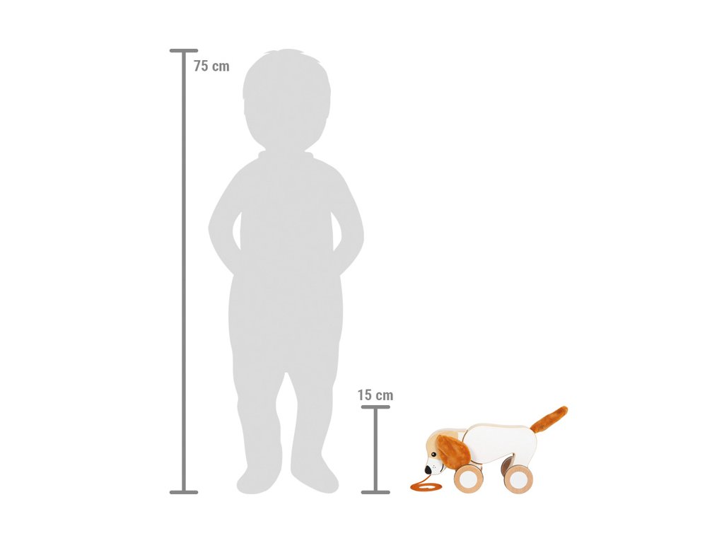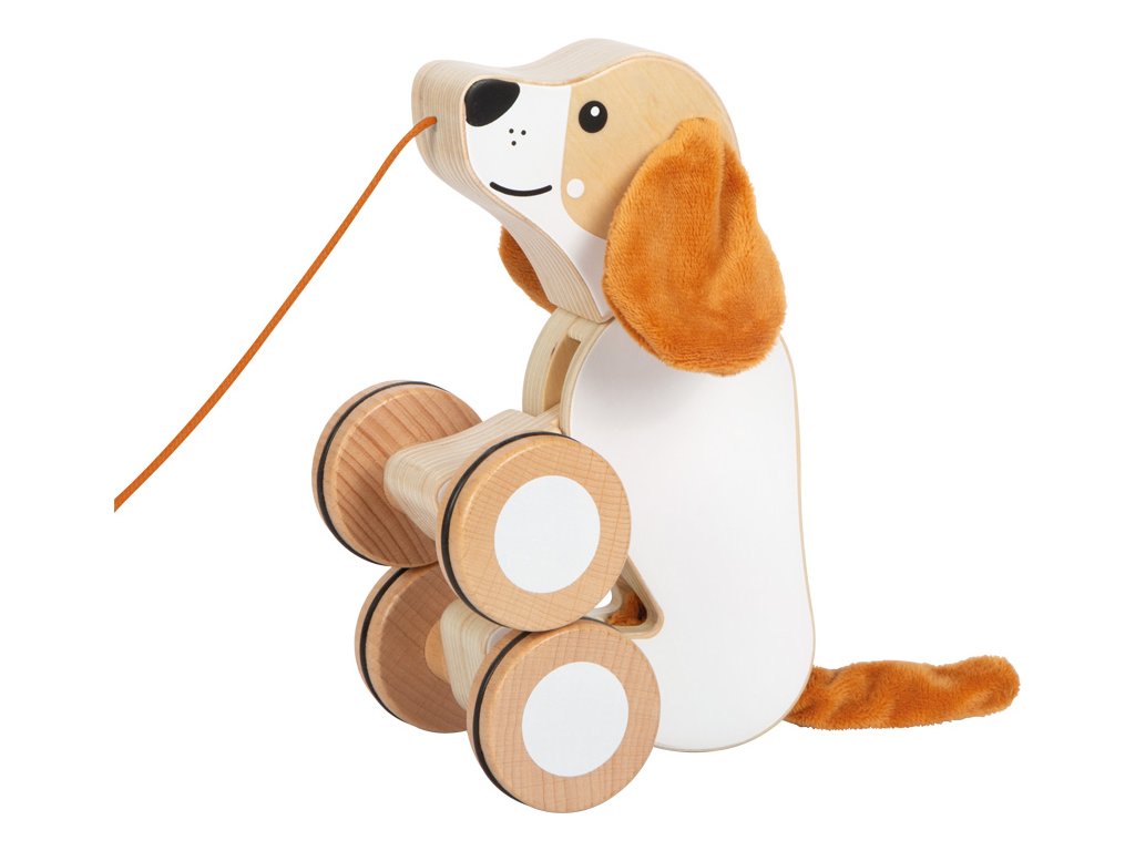 Haf, haf! Nejlepší přítel člověka roztomilý pejsek s měkkýma ušima a ocáskem vyrobený z vysoce kvalitního pevného dřeva se jistě stane nezapomenutelným kamarádem každého dítka při jeho prvních samostatných krůčcích. Dá se snadno táhnout na provázku a povzbuzuje malé děti k lezení a chůzi. Užijí si tak při procházkách spoustu zábavy. Přední část těla pejska a hlava jsou pohyblivé, takže může panáčkovat a když se povolí provázek, vypadá to, že pejsek očichává podlahu. Pogumovaná kolečka napomáhají plynulé a tiché jízdě. Hračka podporuje rozvoj motorických dovedností, pohyblivosti a smyslového vnímání. Uši a ocásek lze snadno odebrat a vyprat. Hlavní vlastnosti: robustní provedenípohyblivé tělo a hlavaodnímatelné měkké uši a ocásekse šňůrou dlouhou 60 cmpodporuje rovnováhu a koordinaci pohybůrozvíjí motorické dovednostis tichými pogumovanými kolečkyinspiruje dětskou kreativitu a představivost