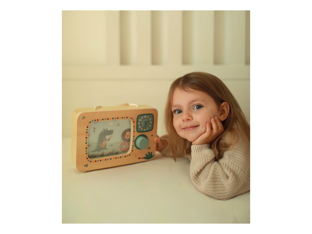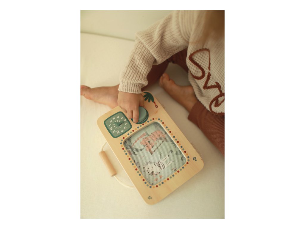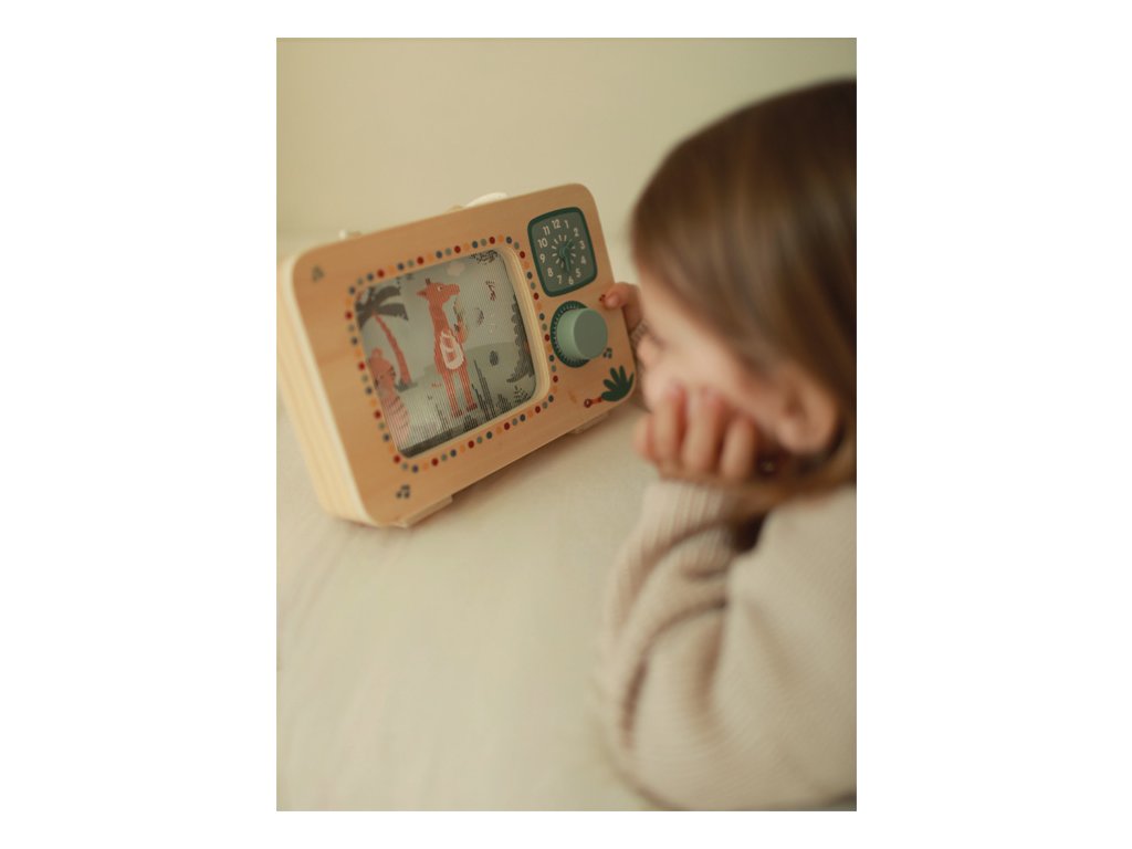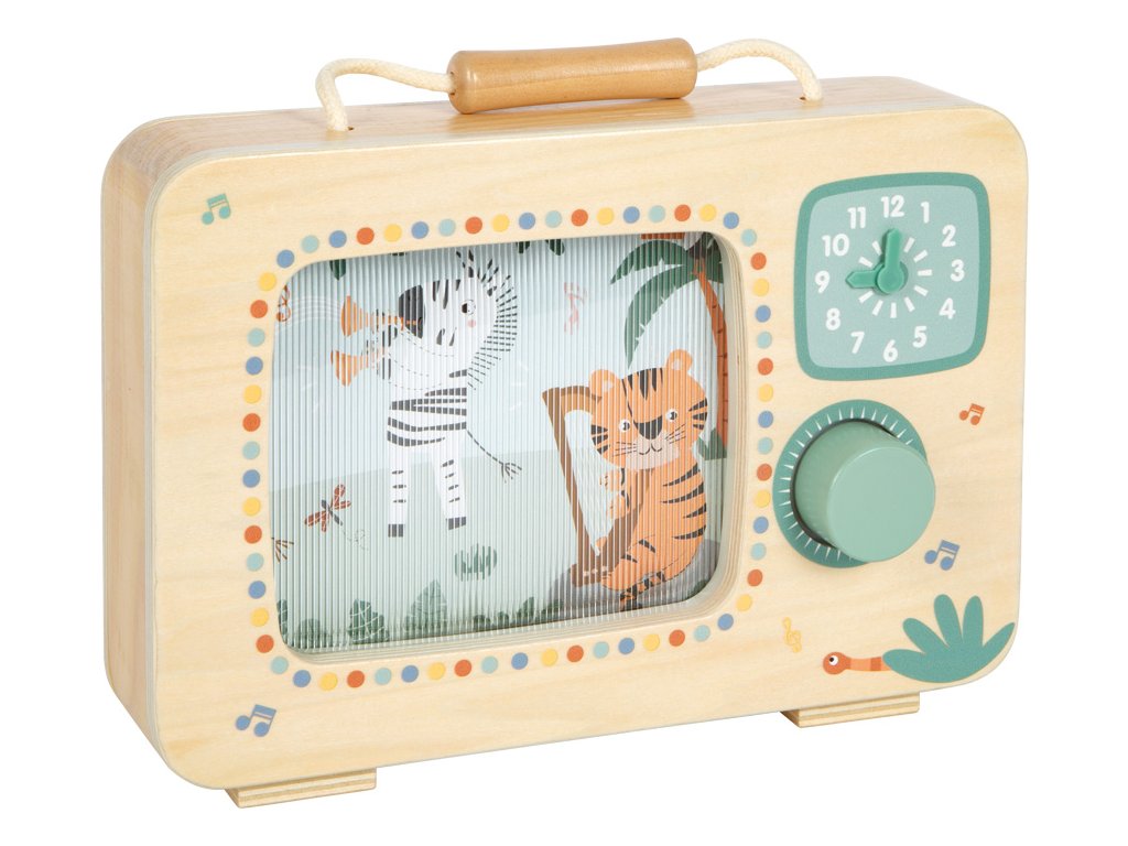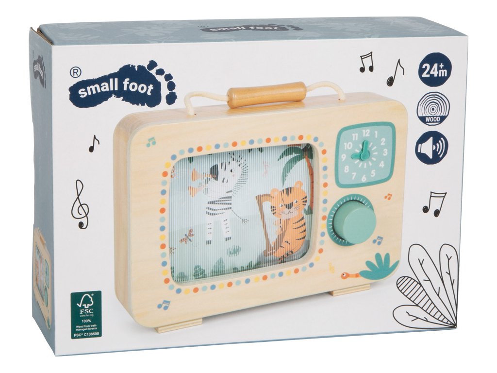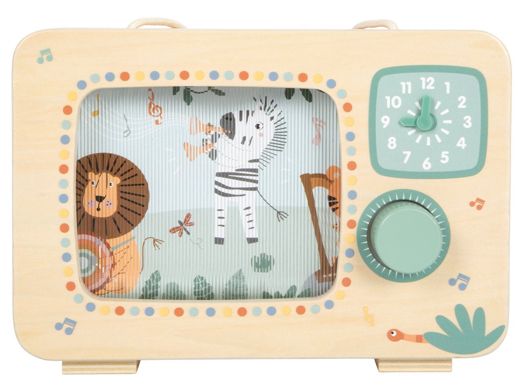 Tato kouzelná hudební skříňka ve tvaru televize vyrobená ze 100% certifikovaného dřeva FSC® přináší dětem radost z hudby, pohybu i objevování. Po otočení knoflíku se barevný obrázek safari zvířátek rozpohybuje a zazní jemná melodie, doprovázená příjemným cvakavým zvukem otočného knoflíku.V hlavní roli je veselý orchestr zvířátek ze safari, který ožívá při každém otočení. Díky praktické rukojeti si mohou děti hrací skříňku snadno vzít kamkoli s sebou. Na přední straně se nachází hodiny s potištěným ciferníkem a pohyblivými ručičkami, které lákají k prvním hrám s časem. Hračka rozvíjí jemnou motoriku, koordinace ruka-oko, sluchové i zrakové vnímání a podporuje představivost. Perfektně ladí s ostatními produkty z oblíbené kolekce Safari, společně tvoří harmonický svět plný hudby a dobrodružství. Hlavní vlastnosti: vyrobena ze 100% certifikovaného dřeva FSC® ve tvaru televize, originální a dekorativní doplněk dětského pokoje pohyblivý obrázek safari zvířátek otočný knoflík s jemným cvakavým zvukem praktická rukojeť umožňuje snadné přenášení kamkoli potištěné hodiny s pohyblivými ručičkami rozvíjí jemnou motoriku, koordinaci, zrakové a sluchové vnímání Značka a certifikát FSC® (Forest Stewardship Council) zaručuje, že dřevo, ze kterého byl produkt vyroben, nebylo vytěženo nelegálně a pochází z lesů obhospodařovaných šetrným či přírodě blízkým způsobem, ve kterém jsou dodržovány přísné environmentální a sociální požadavky. Značka FSC® na výrobku znamená, že svým nákupem pomáháte chránit lesy a podporujete šetrné, odpovědné či přírodě blízké hospodaření, díky kterému jsou naše lesy stabilnější, zdravější, mají přirozenou druhovou skladbu a lépe odolávají negativním následkům klimatických změn.
