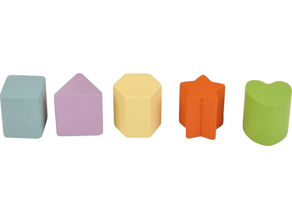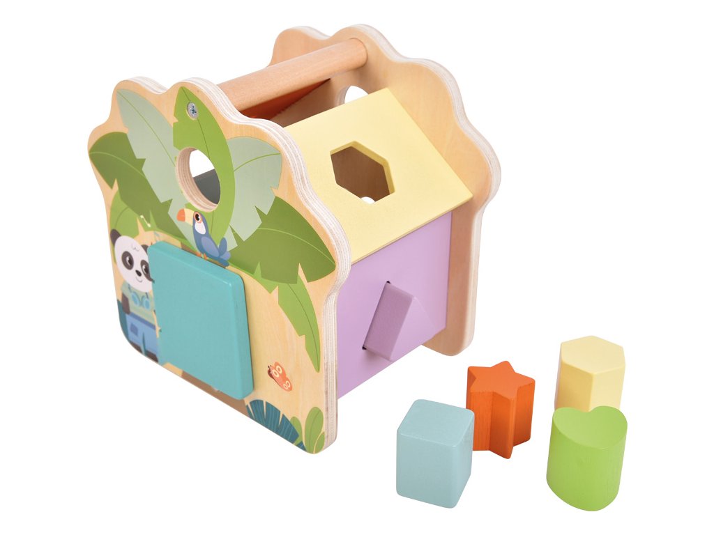 Třídění, vkládání a učení ještě nikdy nebylo tak zábavné! Tento s láskou navržený domeček z certifikovaného FSC® 100% dřeva přináší dětem hravý způsob, jak objevovat svět tvarů a barev. Barevné dřevěné kostky v pěti různých tvarech se vkládají do odpovídajících otvorů po stranách domečku a procvičují tak logické myšlení, jemnou motoriku a koordinaci ruka-oko.Po vložení všech kostek lze dvířka jednoduše otevřít a kostky znovu vysypat. Domeček zdobí roztomilé ilustrace pandy, tygra a palmy, které v dětech probouzejí fantazii a chuť objevovat svět džungle. Díky pestrým barvám, hladkým hranám a zaobleným tvarům je hra naprosto bezpečná i pro malé ručičky. Praktická rukojeť na střeše umožňuje domeček snadno přenášet, ideální na cesty, do školky nebo na hraní doma. Hlavní vlastnosti: vyrobeno z FSC® 100% certifikovaného dřeva obsahuje 5 barevných a tvarově odlišných kostekstřecha s praktickou rukojetí pro snadné přenášení podporuje rozvoj jemné motoriky, trpělivosti a koordinaceučí rozpoznávat barvy a tvary hravou formou Značka a certifikát FSC® (Forest Stewardship Council) zaručuje, že dřevo, ze kterého byl produkt vyroben, nebylo vytěženo nelegálně a pochází z lesů obhospodařovaných šetrným či přírodě blízkým způsobem, ve kterém jsou dodržovány přísné environmentální a sociální požadavky. Značka FSC® na výrobku znamená, že svým nákupem pomáháte chránit lesy a podporujete šetrné, odpovědné či přírodě blízké hospodaření, díky kterému jsou naše lesy stabilnější, zdravější, mají přirozenou druhovou skladbu a lépe odolávají negativním následkům klimatických změn.