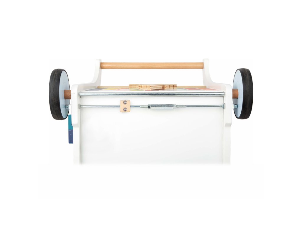 Chodítko ve tvaru slona je multifunkčním doplnkěm pro hru i výuku, přináší zábavu na všech svých pěti stranách! Děti se mohou zabavit duhovým labyrintem, vkládačkou s různými tvary, kreslením na tabulku, nebo otáčením a odklápěním různobarevných prvků. Svrchní desku s labyrintem lze odklápět, je vybavená výřezy bránícími skřípnutí dětských prstů. Odklopením odhalíte objemný úložný prostor na hračky, nebo oblíbeného plyšáka. Kola vozítka jsou opatřena pogumováním, které zajišťuje kultivovaný, tichý chod na všech typech povrchů. Jsou také vybavena brzdou, kterou můžete seřídit rychlost a oporu dle věku a pohybových schopností Vašich dětí. Výrobek vyžaduje montáž, dodáváno s obrázkovým návodem k sestavení. Hlavní vlastnosti: multifunkční chodítko a 6 dílků vkládačkyvkládačka, bludiště, otáčivé kostky, odklápěcí trojúhelník a tabulka pro kreslení křídoupraktický úložný prostortichý chododolné dřevěné provedení