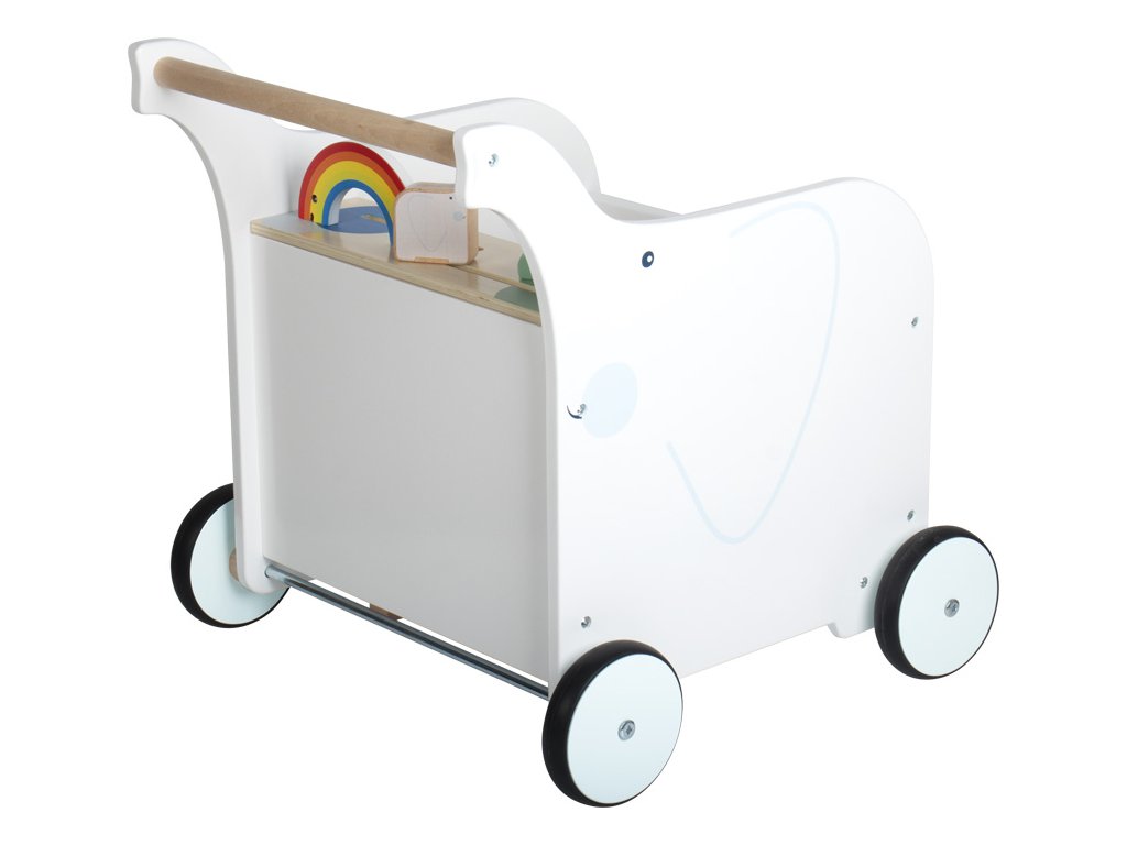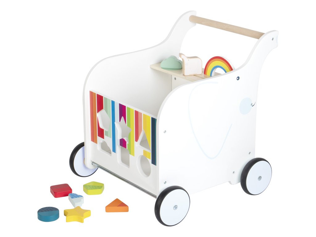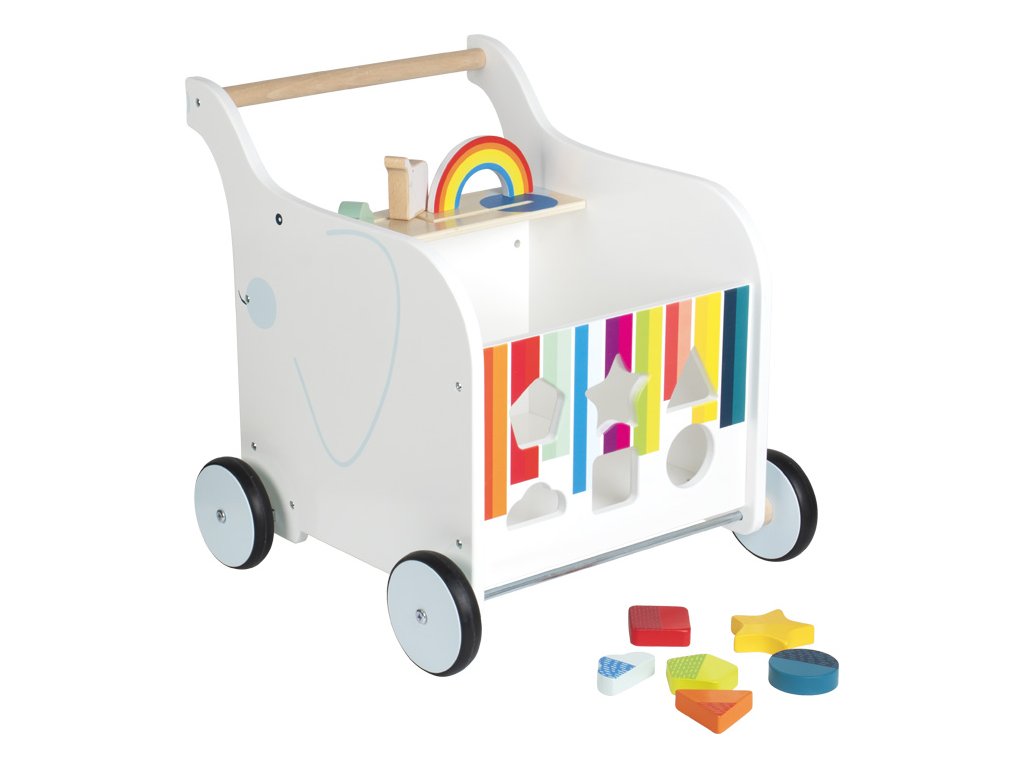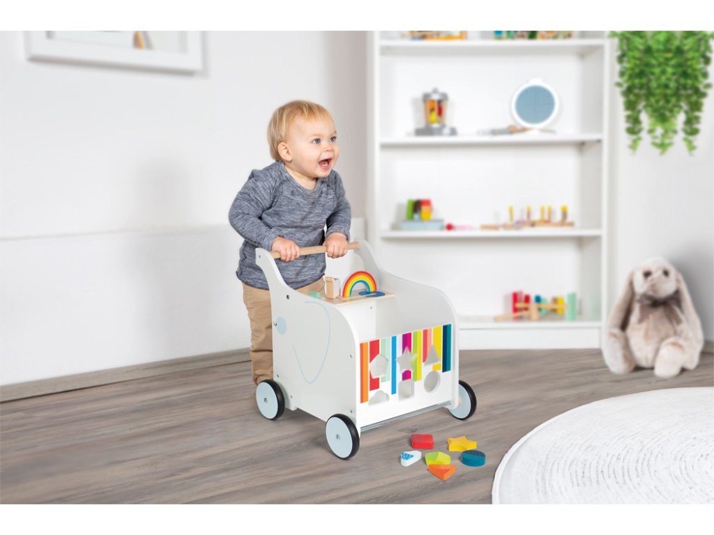 Toto chodítko je inovativní hračka navržená pro malé objevitele, kteří právě začínají svou cestu objevování světa kolem sebe. Duha a její barvy jsou krásným designovým prvkem slona. Multifunkční hračka kombinuje prvky podporující chůzi a praktického úložného prostoru na hračky. Chodítko je vybaveno pevným a bezpečným úchytem pro malé dětské ruce, což umožňuje dětem postavit se a podporuje první krůčky. V těle hračky je dostatek prostoru pro uložení oblíbených hraček. Vkládání šesti různých tvarů a posouvání posuvných dílků trénuje jemnou motoriku dětí zábavnou formou. Pogumovaná kolečka a integrovaná osa zajistí bezpečnou, stabilní a tichou jízdu. Hlavní vlastnosti: podporuje rozvoj motorikypomůže dětem s rozpoznáváním tvarů a barevvkládaní tvarů, posuvné dílypogumovaná kolečka pro tichou jízduintegrovaná osa pro bezpečnost a stabilituuvnitř úložný prostor