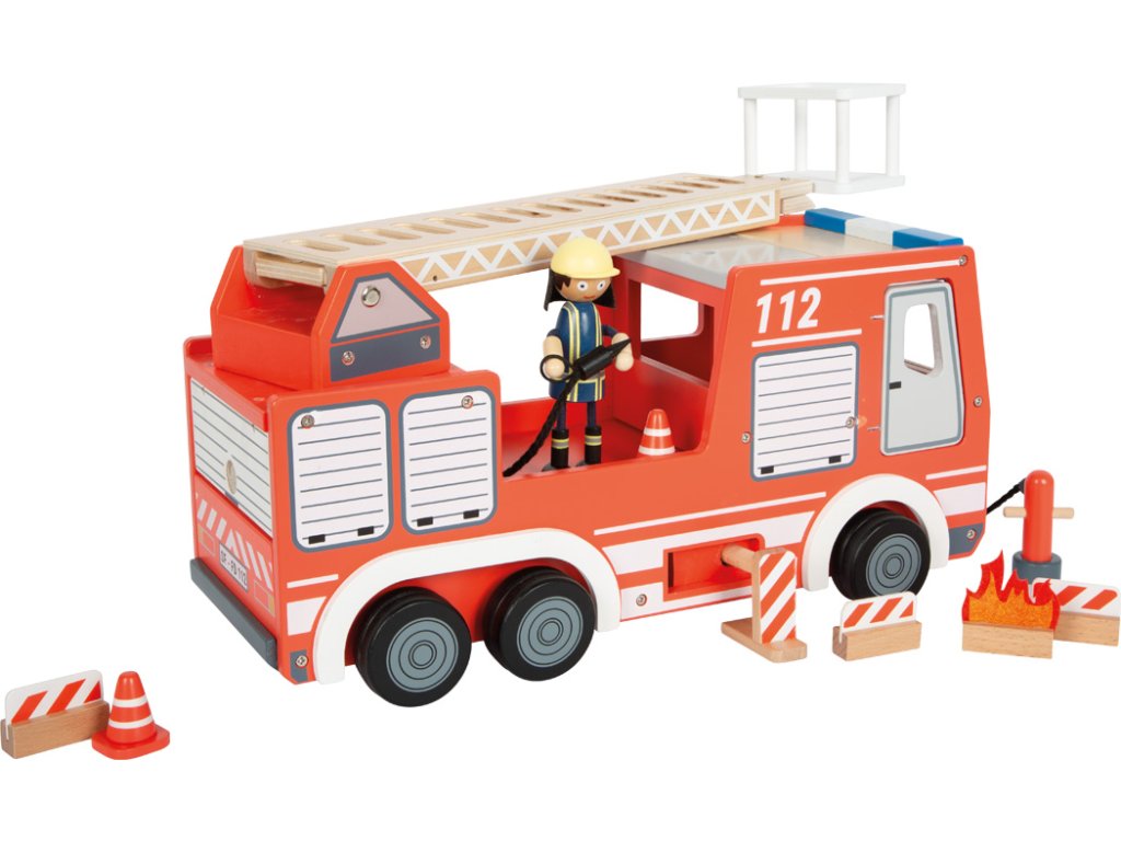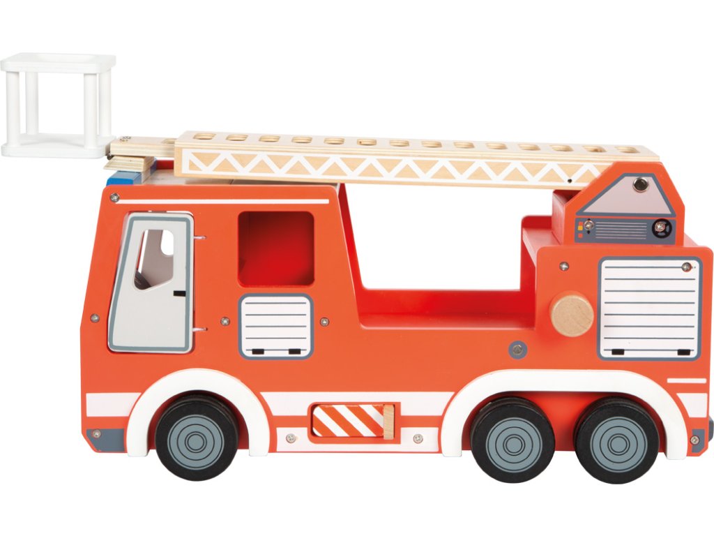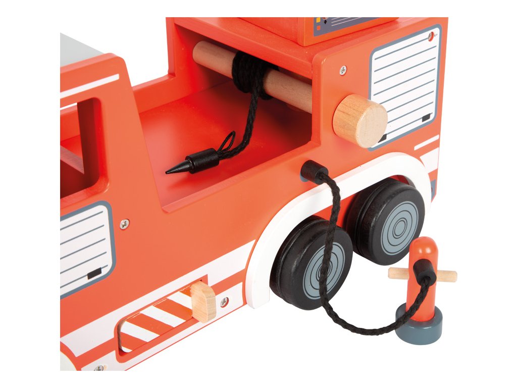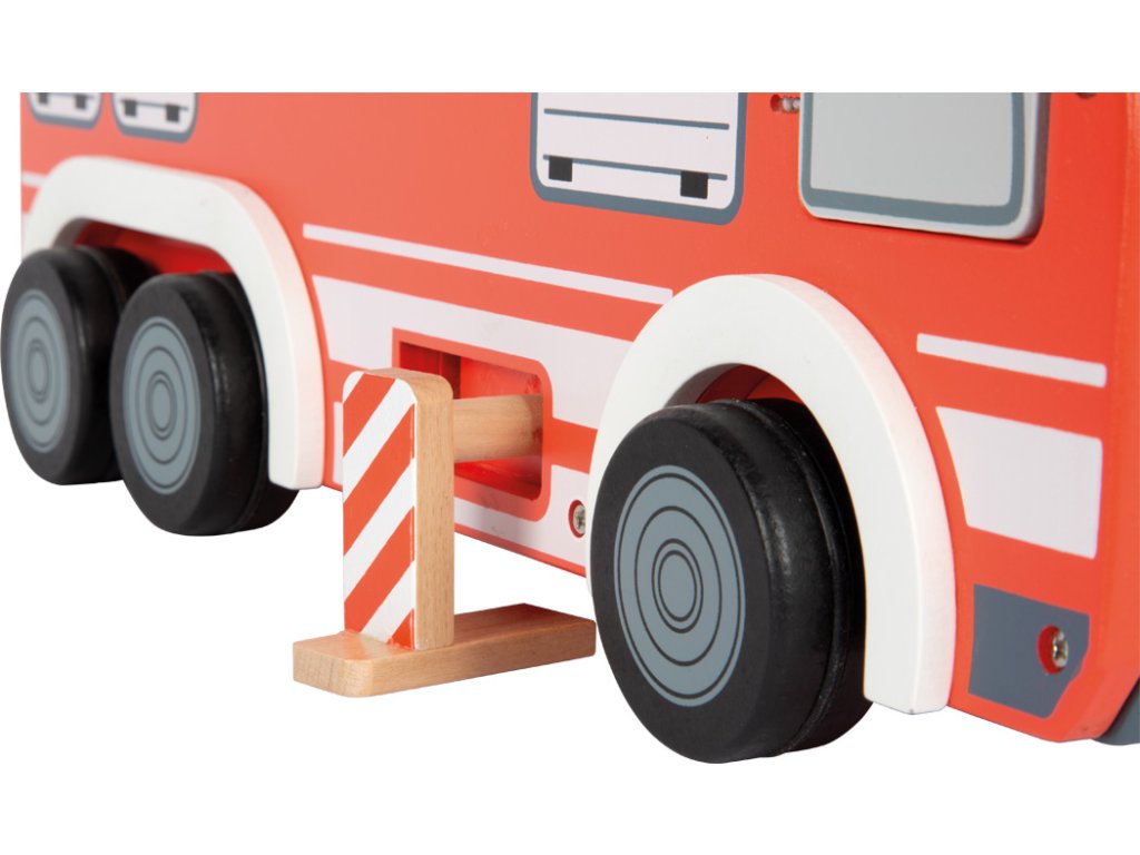 Velké hasičské auto, které přijede na místo, co nevidět! Navíc zaujme svými detaily a robustním zpracováním. Výsuvný žebřík s košem, který lze otáčet o 360 stupňů, umožňuje záchranné práce ve vysokých výškách a díky magnetu žebřík bezpečně uzamkne na místě. Výsuvné podpěrné nohy poskytují stabilní základnu, zatímco navíjecí hadice s magnetickým systémem a odpovídajícím hydrantem je připravena na akční hasičské mise. Otevírací střecha poskytuje úložný prostor pro širokou škálu příslušenství. V kabině řidiče s pohyblivými dveřmi je také dostatek místa pro přiloženou figurku hasiče (ohebná panenka s pohyblivýma rukama a nohama). Pogumovaná kola zajišťují tichou a bezpečnou cestu na místo další mise. Ať už se jedná o zabezpečení míst nehod pomocí bariérových zábran nebo o hašení požárů pomocí zatahovací hadice a rozprašovače vody, tato herní sada nabízí nespočet možností pro kreativní hraní na téma hašení požáru a záchrany. Funkční a detailní design zajišťuje obzvláště autentický zážitek ze hry.Hlavní vlastnosti: obsahuje 1 hasičský vůz s žebříkem a hadicí, 1 ohebnou figurku, 2 dopravní výstražné kužely, 3 zábrany, 1 výsuvný stojan, 1 hydrant, 1 plstěný oheňideální pro fanoušky autíček a hasičůpevné dřevo, zaoblené hranyrealistický designdo auta se vejde figurkapohyblivý žebříktichá pogumovaná kolečka