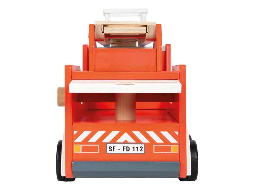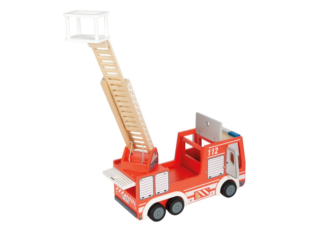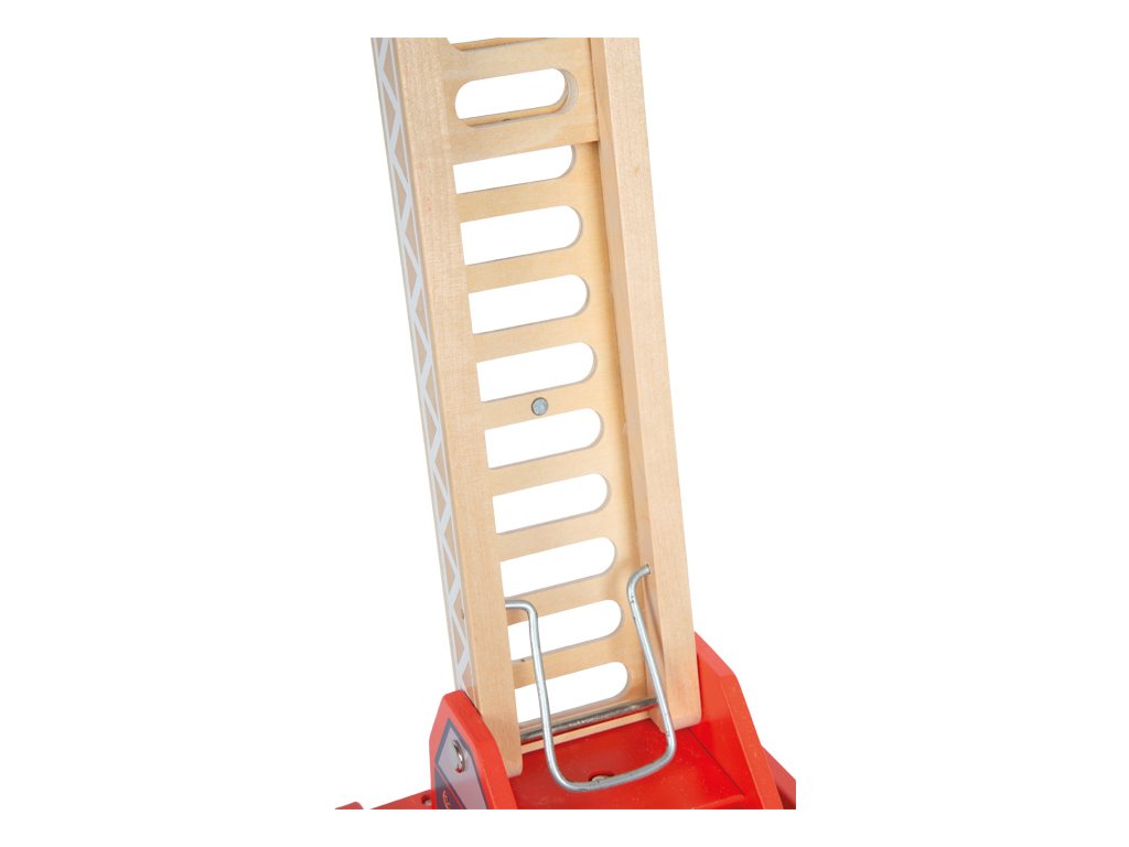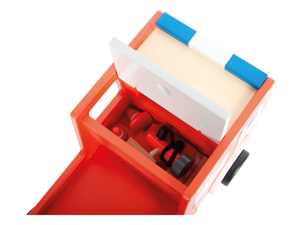 Velké hasičské auto, které přijede na místo, co nevidět! Navíc zaujme svými detaily a robustním zpracováním. Výsuvný žebřík s košem, který lze otáčet o 360 stupňů, umožňuje záchranné práce ve vysokých výškách a díky magnetu žebřík bezpečně uzamkne na místě. Výsuvné podpěrné nohy poskytují stabilní základnu, zatímco navíjecí hadice s magnetickým systémem a odpovídajícím hydrantem je připravena na akční hasičské mise. Otevírací střecha poskytuje úložný prostor pro širokou škálu příslušenství. V kabině řidiče s pohyblivými dveřmi je také dostatek místa pro přiloženou figurku hasiče (ohebná panenka s pohyblivýma rukama a nohama). Pogumovaná kola zajišťují tichou a bezpečnou cestu na místo další mise. Ať už se jedná o zabezpečení míst nehod pomocí bariérových zábran nebo o hašení požárů pomocí zatahovací hadice a rozprašovače vody, tato herní sada nabízí nespočet možností pro kreativní hraní na téma hašení požáru a záchrany. Funkční a detailní design zajišťuje obzvláště autentický zážitek ze hry.Hlavní vlastnosti: obsahuje 1 hasičský vůz s žebříkem a hadicí, 1 ohebnou figurku, 2 dopravní výstražné kužely, 3 zábrany, 1 výsuvný stojan, 1 hydrant, 1 plstěný oheňideální pro fanoušky autíček a hasičůpevné dřevo, zaoblené hranyrealistický designdo auta se vejde figurkapohyblivý žebříktichá pogumovaná kolečka