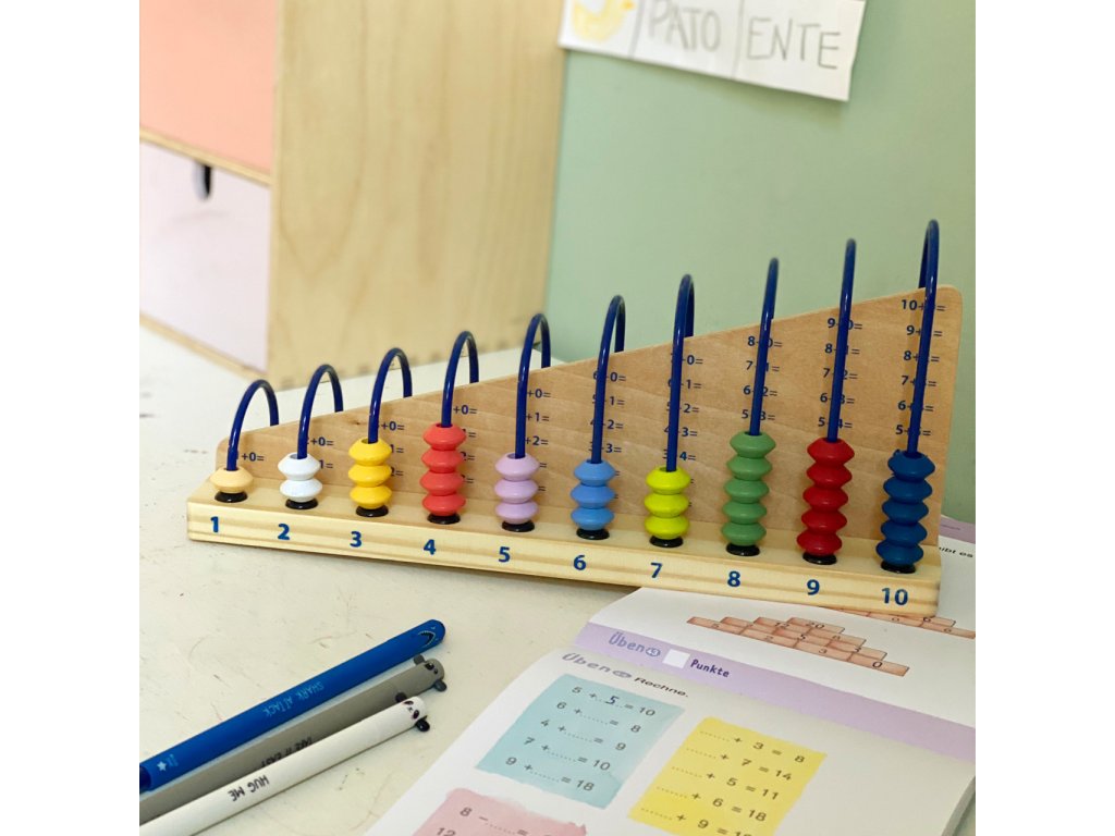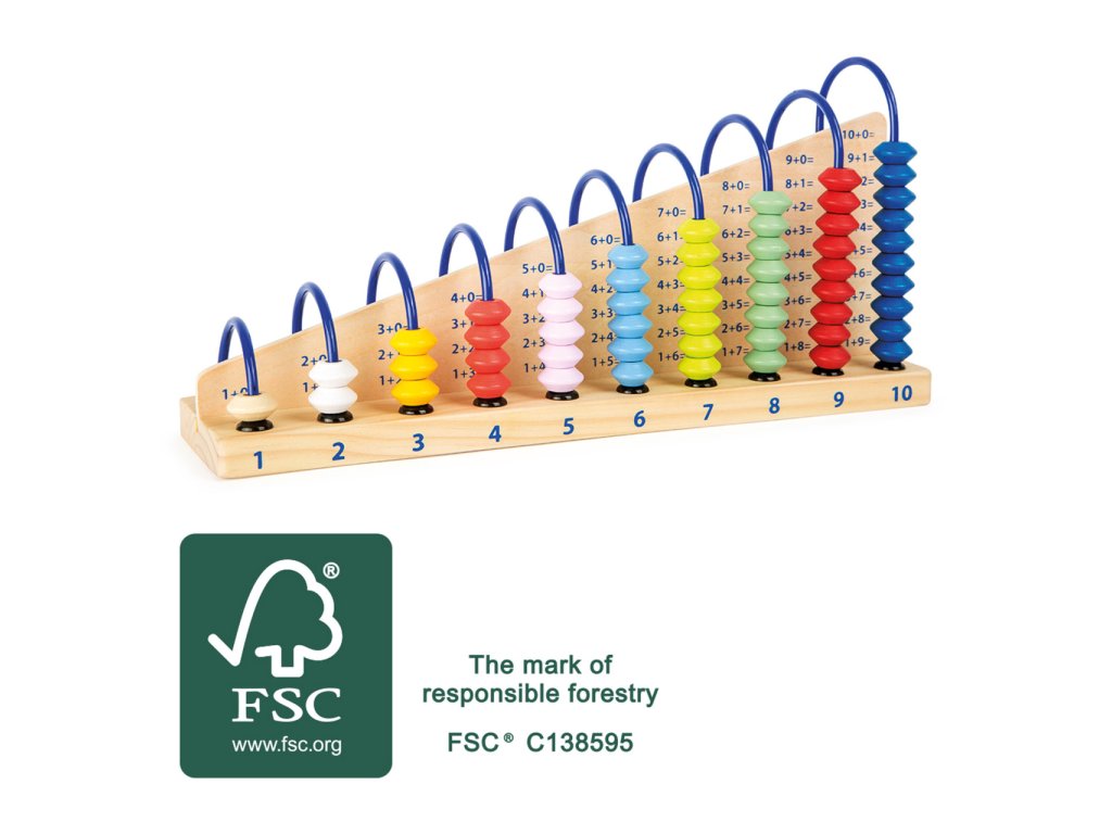 Dřevěné korálky na desíti kovových vesele malovaných obloucích, funguje jako vizuální pomůcka pro výpočty. Na vnitřní dřevěné stěně je 55 matematických příkladů z každé strany. Příklady odčítání a sčítání mohou děti lehce vypočíst pomocí dřevěných korálků! Kvalitní dřevěné počítadlo. Hlavní vlastnosti: barevné korálky100% FSC® dřevovýška 14 cm Značka a certifikát FSC® (Forest Stewardship Council) zaručuje, že dřevo, ze kterého byl produkt vyroben, nebylo vytěženo nelegálně a pochází z lesů obhospodařovaných šetrným či přírodě blízkým způsobem, ve kterém jsou dodržovány přísné environmentální a sociální požadavky. Značka FSC® na výrobku znamená, že svým nákupem pomáháte chránit lesy a podporujete šetrné, odpovědné či přírodě blízké hospodaření, díky kterému jsou naše lesy stabilnější, zdravější, mají přirozenou druhovou skladbu a lépe odolávají negativním následkům klimatických změn.