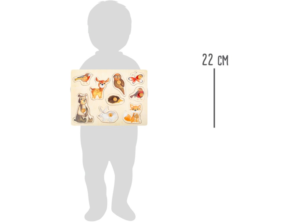 Rychlý výlet do lesa! Robustní puzzle ze dřeva, které má základnu a dále odnímatelné dílky s kuličkou pro jednodušší uchopení. Trénuje jemnou motoriku a trpělivost. Hlavní vlastnosti: obsahuje 9 vkládacích dílů - srnka, zajíc. ježek a dalšíprocvičuje jemnou motoriku a trpělivost