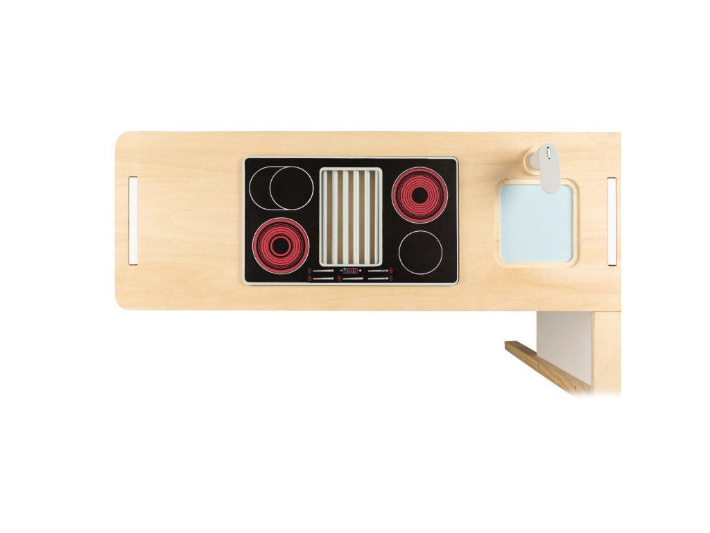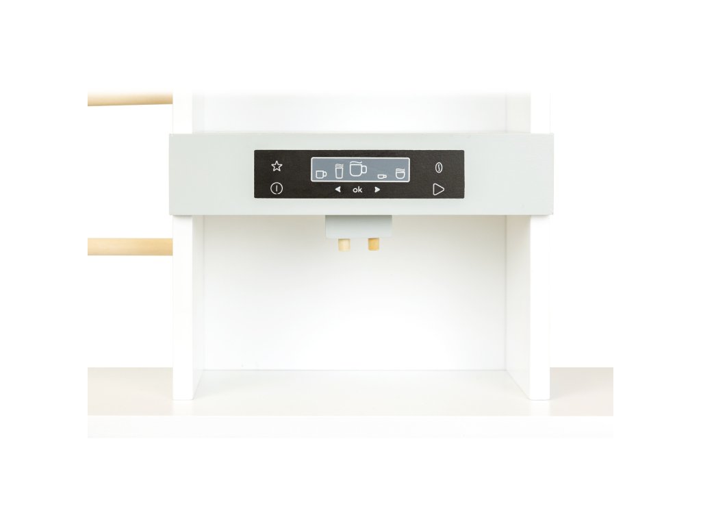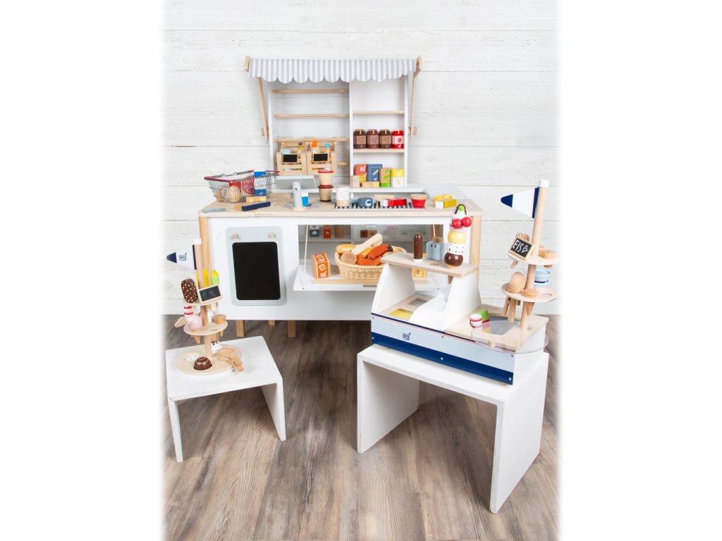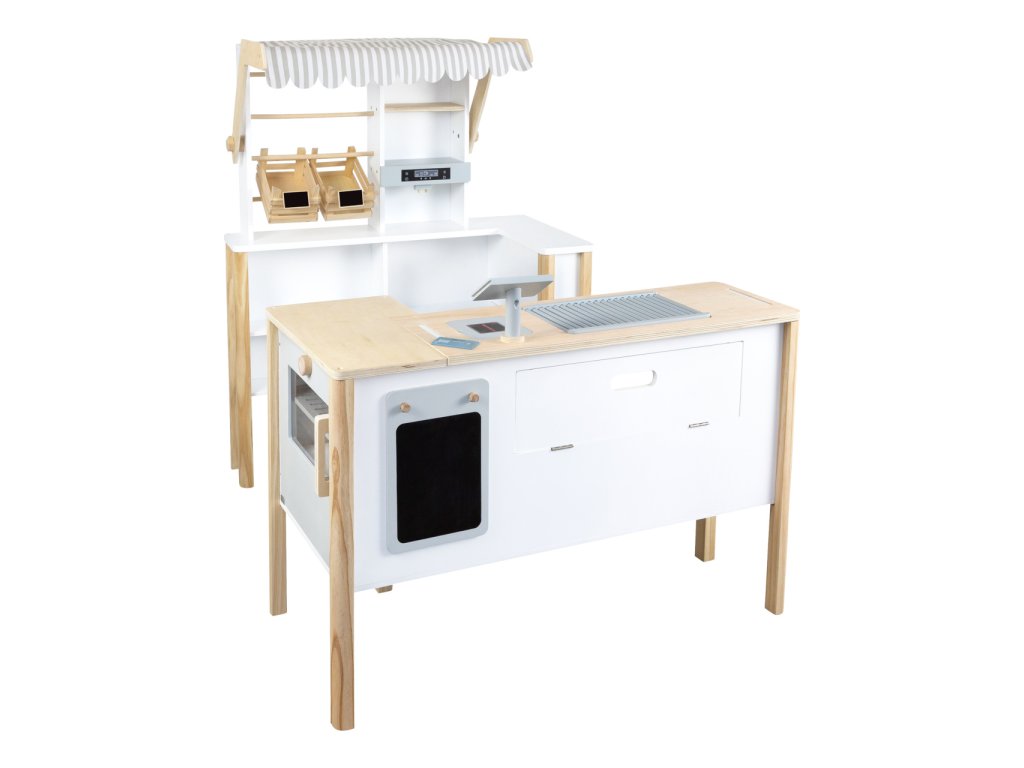 Prodejní stánek, kiosek, nebo bufet? Velký stánek v moderním skandinávském designu je modulární a multifunkční, skládá se z mnoha částí, které můžete přestavět během pár okamžiků a uspořádat i s ohledem k volnému prostoru u Vás doma. Variabilní herní prvky lze využít několika způsoby, pokladnu přestavěte na dřez, varnou desku na grill, z trouby vytvořte lednici. Ve výbavě dále naleznete váhu, výklopné police, popisovací tabule a také kávovar i úložné prostory se 2 bedýnkami. Markýza malého pultu se dá sklopit pro úsporu místa (její potah se může barevně lišit). Stánek nabízí dostatek prostoru pro hru více dětí najednou. Imitováním všedních situací se děti naučí jaké to je být prodejcem, zákazníkem, jaké je to vařit nebo jednat s lidmi. Výrobek vyžaduje montáž, dodáváno s obrázkovým návodem k sestavení. Hlavní vlastnosti:multifunkční, různorodé využitímodulární konstrukce s variabilním vybavenímrozvíjí komunikační a sociální dovednosti dětí