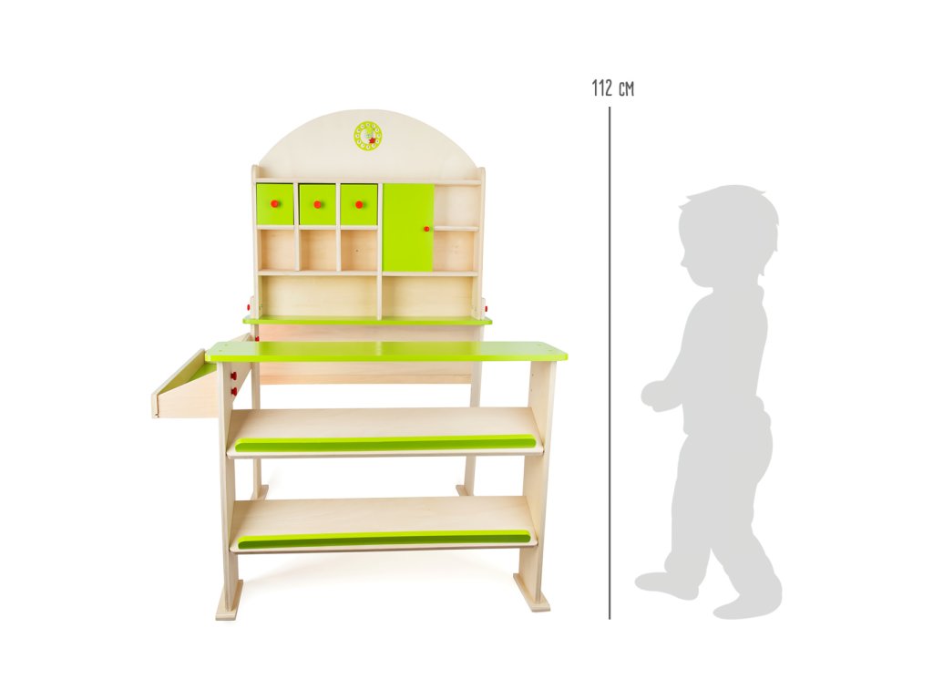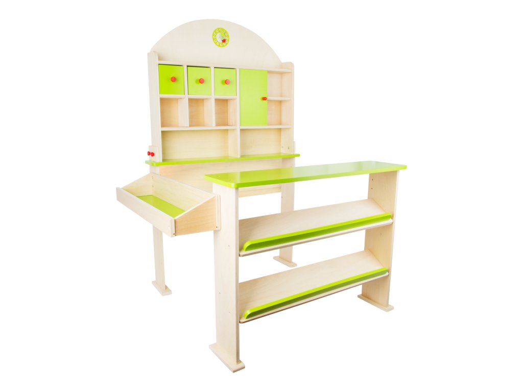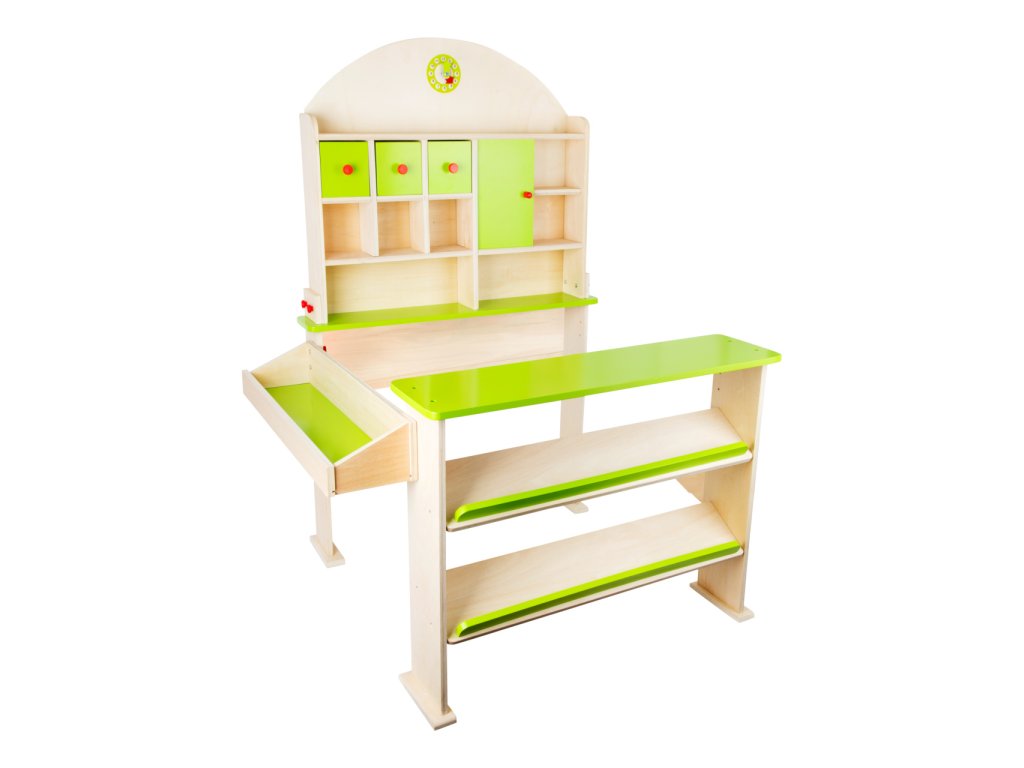 Podpořte své děti v poznávání společenských zvyklostí a rozvíjení komunikačních i početních dovedností pomocí moderního prodejního stánku. Jeho základem je prostorný pult, na který lze pohodlně umístit řadu doplňkového příslušenství, například pokladnu, váhu a krájecí prkénka. Šikmé policové díly jsou zvlášť vhodné k ukládání rozmanitých bedýnek. Pro jednotlivé makety a zboží lze využít další samostatnou polici. Zadní stěna obchodu nabízí několik různých odkládacích ploch a skříněk opatřených funkčními dvířky. Její štít navíc zdobí jednoduché hodiny, na nichž lze vyznačit otevírací dobu. Všechny součásti jsou vyrobeny z velmi odolné překližky a díky praktické, rozebiratelné konstrukci využívající robustní křídlové matice lze stánek snadno uklidit tak, aby šetřil místem. Výrobek vyžaduje montáž, dodáváno s obrázkovým návodem k sestavení. Hlavní vlastnosti:velké množství rozmanitých úložných prostor4 dílná, snadno rozebiratelná konstrukcerobustní a odolné dřevěné provedení