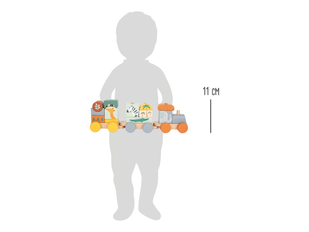 Složte jej a vyražte ze stanice! Tento dřevěný vláček v trendy barvách se rozjede až po nastoupení všech pasažérů – zebry, slona, žirafy a krokodýla. Vláček s mnoha detaily je zároveň nasazovací hračkou, která dává dětem volnost při skládání – každá kostka pasuje na více míst. Příští zastávka: Safari! Hlavní vlastnosti: ilustrováno v pastelových barváchobsahuje 1 lokomotivu, 2 vagóny a 13 dílůtrénuje motoriku a představivost
