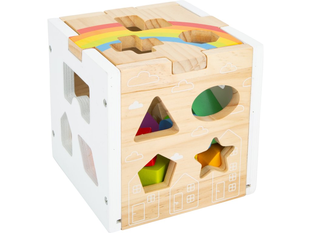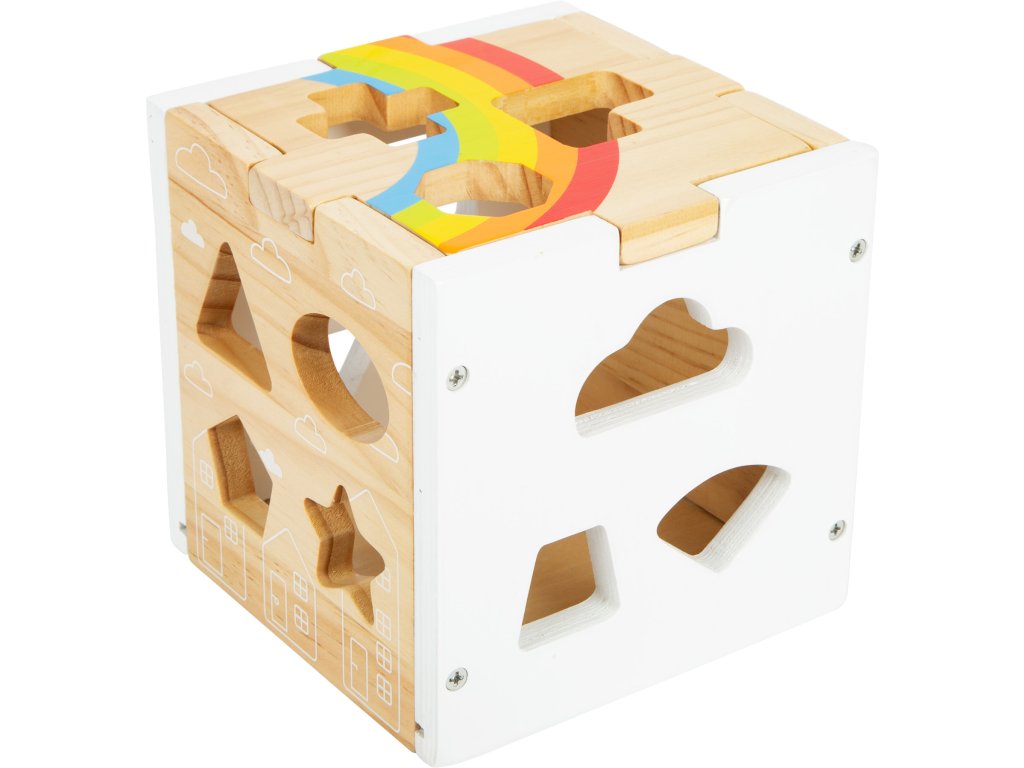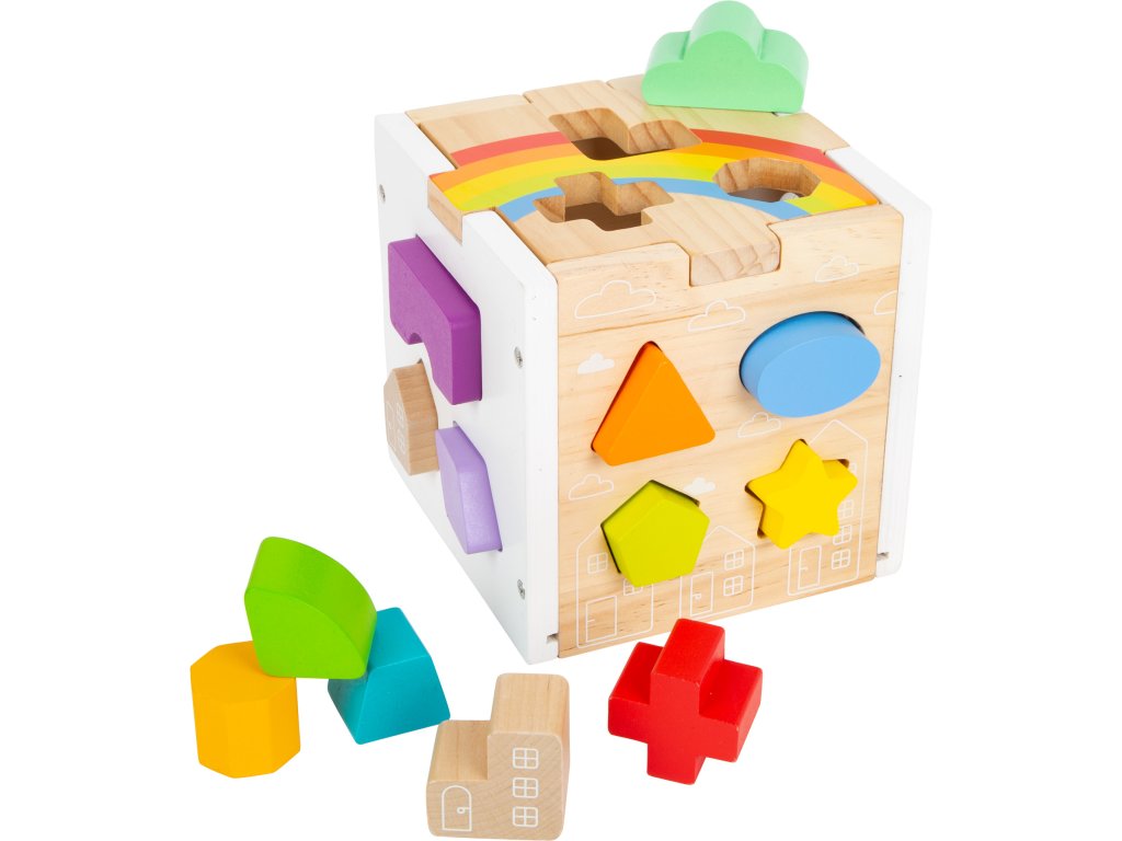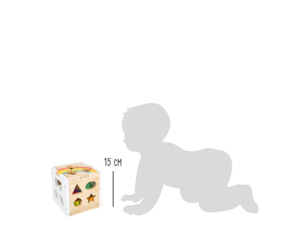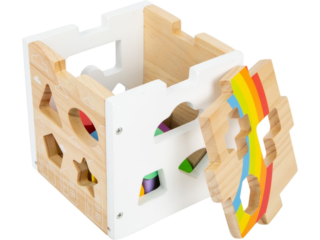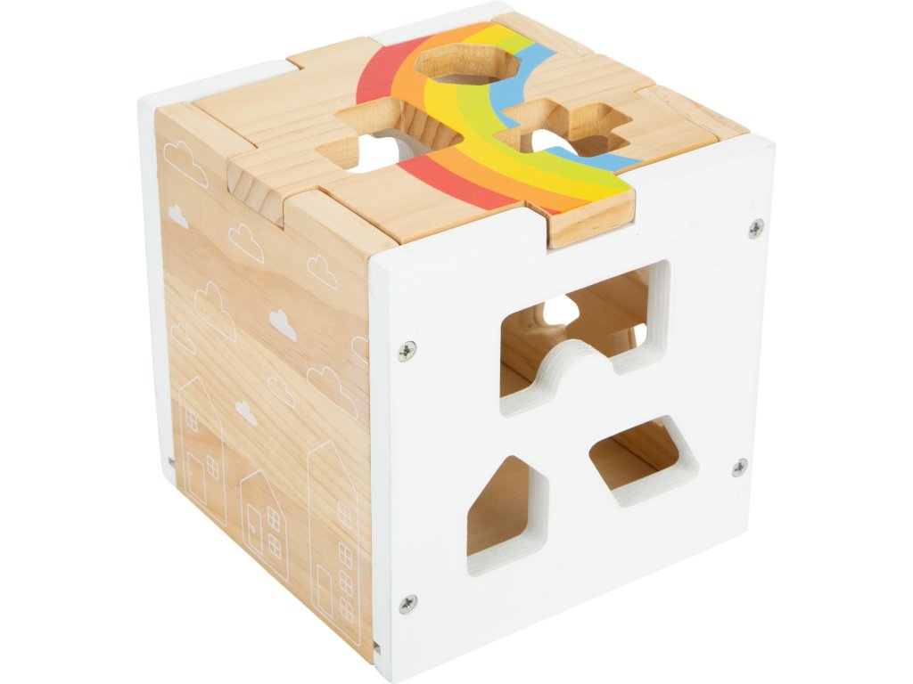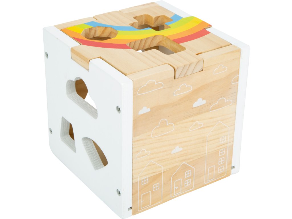 Tato moderní kostka z robustního dřeva kombinuje jednoduchý barevný design přírodního dřeva a bílé barvy doplněný barevnými dílky. Najdete zde 13 dílků různých tvarů a barev, které při vkládání do kostky trénují rozeznávání barev a tvarů u dětí a také jejich motoriku. Kromě klasických tvarů je zde i mráček, hvězda nebo domeček. Minimalistické ilustrace, oddělitelné víko, perfektní zábava pro děti. Hlavní vlastnosti Minimalistický designSpojení přírodního a barevného dřevaZaoblené hranyOddělitelné víko