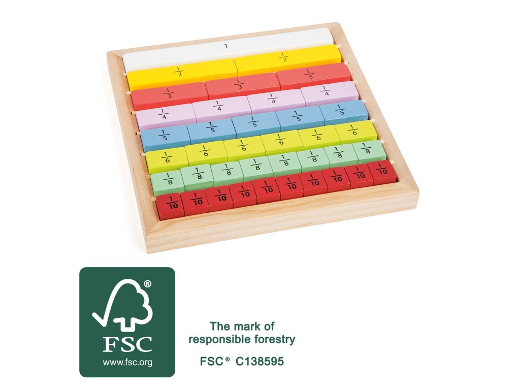 Barevná zábava! Tato hra vyrobená ze 100% FSC® certifikovaného dřeva děti podpoří při procvičování zlomků. Děti motivuje k poznávání světa čísel. ¼ = ? Hlavní vlastnosti: dřívka různé délky a barvy, s potiskem číslice100% FSC® dřevotrénuje zručnost, počty Značka a certifikát FSC® (Forest Stewardship Council) zaručuje, že dřevo, ze kterého byl produkt vyroben, nebylo vytěženo nelegálně a pochází z lesů obhospodařovaných šetrným či přírodě blízkým způsobem, ve kterém jsou dodržovány přísné environmentální a sociální požadavky. Značka FSC® na výrobku znamená, že svým nákupem pomáháte chránit lesy a podporujete šetrné, odpovědné či přírodě blízké hospodaření, díky kterému jsou naše lesy stabilnější, zdravější, mají přirozenou druhovou skladbu a lépe odolávají negativním následkům klimatických změn.