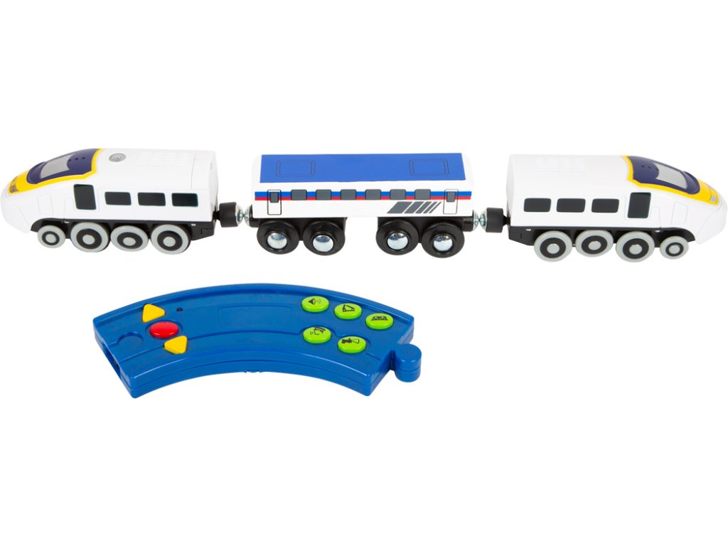 Moderní lokomotiva z plastu a dřevěného vagónku s dálkovým ovládáním, má celkem 8 funkcí. Lokomotivu můžete ovládat do dvou směrů, po stisknutí tlačítka vydává zvuky(hlášení z reproduktoru, signál brány, píšťalka průvodčího, zvuky jízdy, přejezd přes most), dokonce můžete zapnout i světla. Skvělý doplněk k oblíbené dřevěné vláčkodráze. Vláček je kompatibilní se všemi běžnými značkami vláčkodráh jako je Bigjigs, Maxim, Brio, Woody, Bino, Tomáš, Tesco, Ikea a další. Baterie mašinky 3xAAA a 2xAA ovladače nejsou součástí balení. Hlavní vlastnosti: kompatibilní se všemi běžnými značkami vláčkodráhhračka se zvukem a světlem8 funkcí