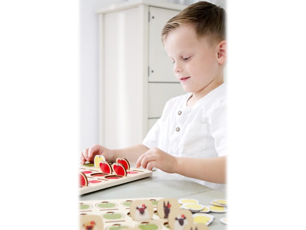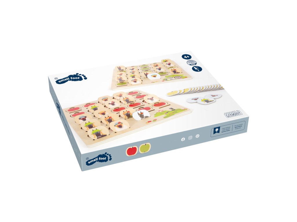 Kdo sebral jablka? S touto hrou může hádat celá rodina, budou vám stačit dobré pozorovací schopnosti, abyste co nejrychleji odhalili postavičku „4 přátelé“. Klasická hra je vyrobena z robustního dřeva a má design vhodný pro děti. V balení najdete 2 hrací desky, na které naskládáte ilustrované dílky, 22 kartonových kartiček s obrázky postaviček. 2 v 1, lze hrát také jako pexeso. Uloženo v kvalitním boxu.Kráva Olga a kohout Heinz se snaží zjistit, kdo ukradl jablka z louky, podezřelí se ale ukryli velmi dobře! Hra je vhodná pro úvod do světa podobností a rozdílností. Společenská hra má velmi jednoduchá pravidla a je vhodná pro lidi všeho věku. Pomáhá s rozvojem kombinačních dovedností a trénuje soustředěnost. Hlavní vlastnosti: populární hra s jednoduchými pravidly z robustního dřevadvě hrací desky, 22 kartonových kartiček2 v 1, lze také použít jako pexesokvalitní úložný boxpodporuje rozvoj kombinačních schopností a trénuje soustředěnostkompatibilní s ostatními hrami „4 přátelé“