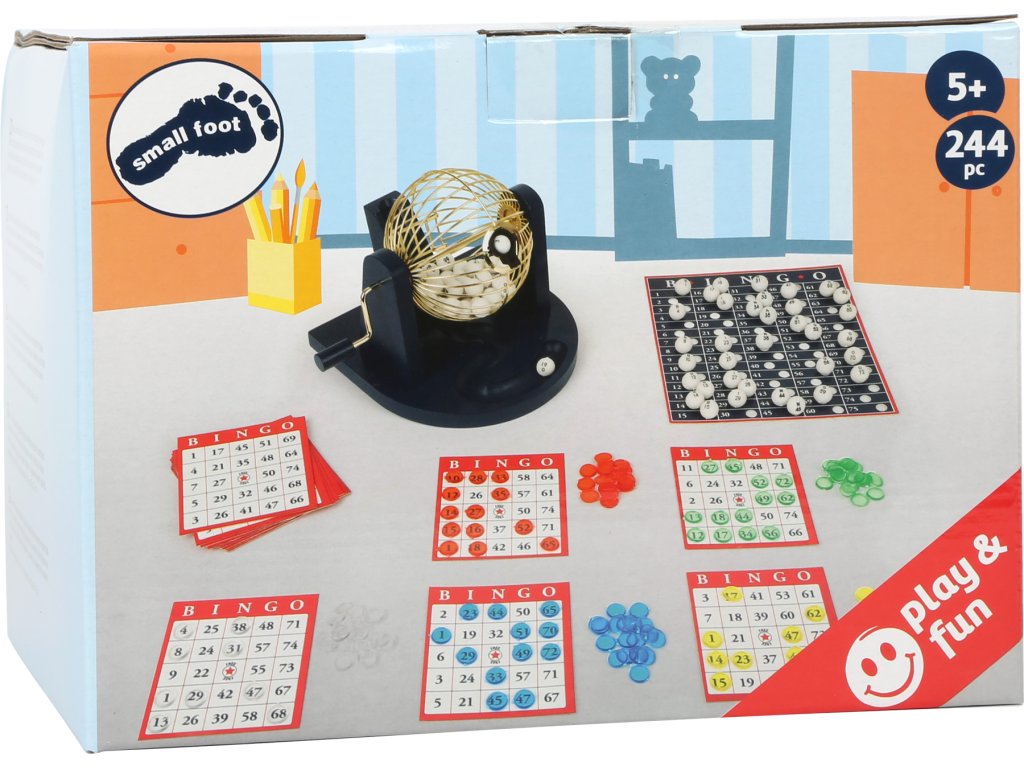 Zábava pro celou rodinu! 75 kuliček s číslem a písmenem slova BINGO je umístěno v losovacím bubnu a postupně losováno. Každý z hráčů má kartičku s čísly a několik transparentních žetonů. Shoda vylosovaného čísla a cifry na kartičce znamená uložení žetonu na místo. Jakmile žetony vytvoří horizontální, vertikální nebo diagonální čáru o 5 oknech, je to BINGO! Hráč shodu hlásí hlasitým výkřikem. Za každé opodstatněné zvolání získáváte bod a hra pokračuje. Hlavní vlastnosti: hra pro 2-5 hráčůprocvičuje čísla a postřeh