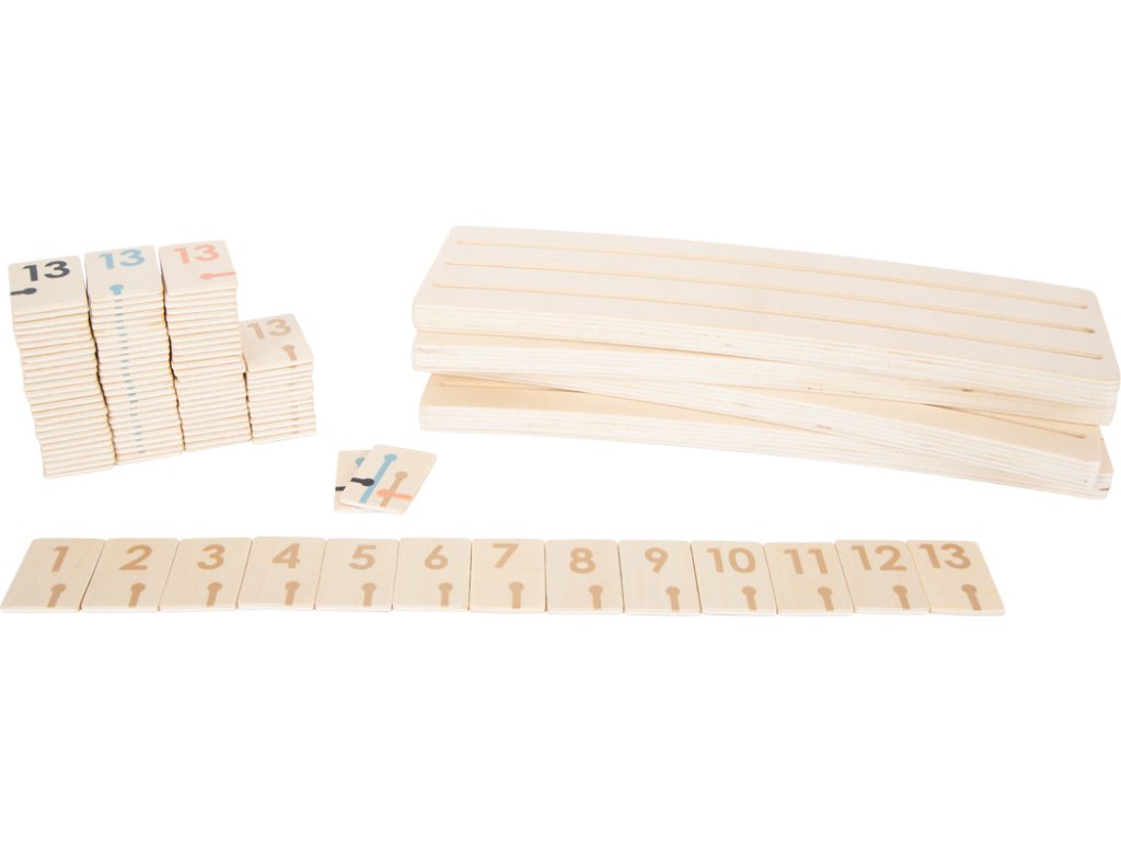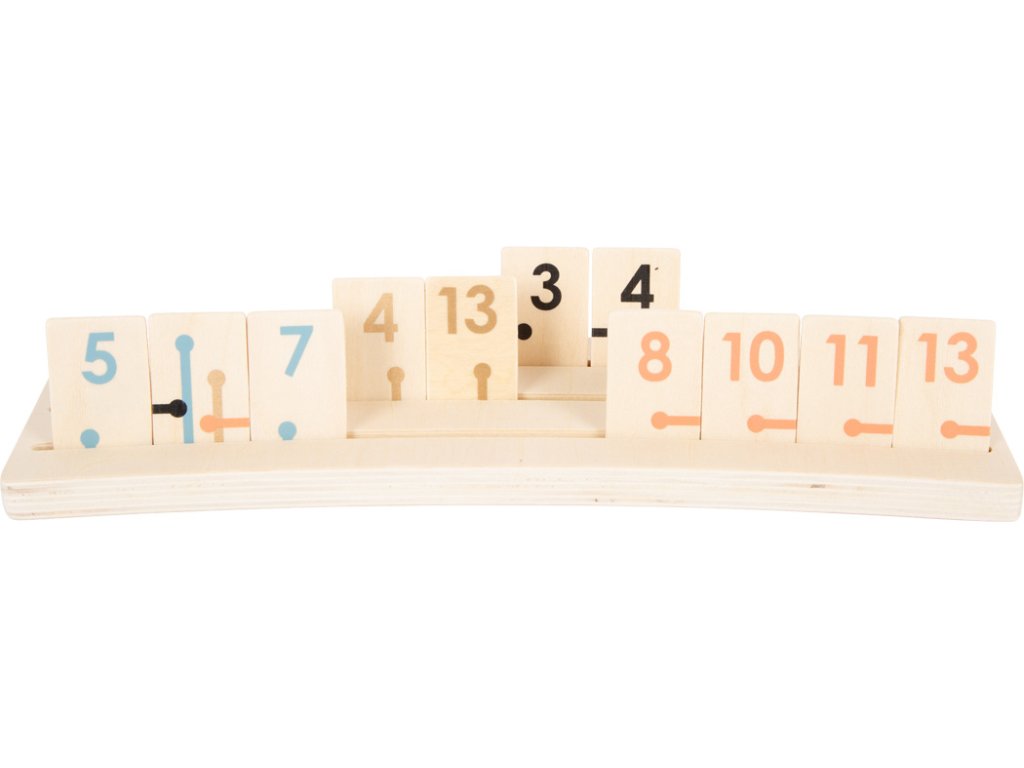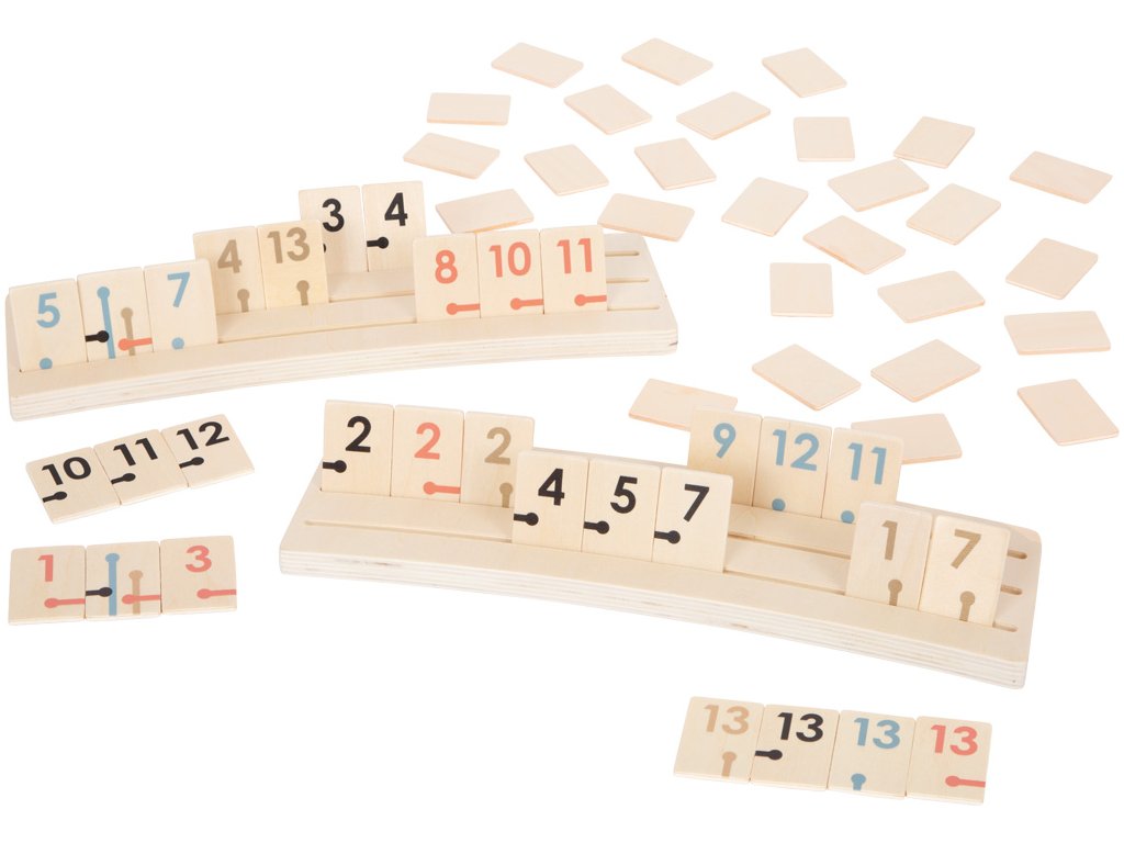 Klasická strategická hra ze dřeva v moderním, "dospělém" motivu se sofistikovanými zlatými detaily, trendy pastelovými barvami a přírodním dřevem. Vysoce kvalitní dřevěné herní dílky, které mají kontrastní potisk a symboly, díky kterým je lze jednoduše rozeznat. Dřevěný držák herních dílků je mírně zahnutý, chrání tak před nakukováním protihráčů. Hra je zabalena v odolném a kvalitním lepenkovém boxu, díky kterého můžete hru jednoduše uskladnit. Podporuje rozvoj soustředěnosti a pozornosti. Skvěle se hodí k ostatním hrám ze série "Gold Edition". Hra vypadá pěkně i jako dekorace. Jednoduchá hra nadchne hráče všeho věku. Hlavní vlastnosti: dřevěná rodinná hra trénuje pozornost a soustředěnost krásná barevná kombinace a viditelné dřevo Zkrácený návod hry:Před začátkem hry položte hrací dílky na stůl, číslicemi dolů. Každý hráč si vezme jeden dílek. Začíná hráč s nejnižším číslem. Pokud hrají 2 hráči, každý si vytáhne 10 hracích dílků. Pokud hrají 3 až 4 hráči, každý si vytáhne 7 hracích dílků. Tyto dílky si poté rozložte na své stojánky tak, aby na ně ostatní hráči neviděli. Zbývající kameny položte na stranu. Stavějte tercie a postupky. Dílky žolíků můžete použít v jakékoliv kombinaci pro tercie i postupky. Pro první vyložení potřebujete alespoň 30 bodů. V každé kombinaci můžete použít pouze jednoho žolíka. Pokud dílky vyložit nemůžete, vezměte si dílek z dobíracího balíčku, jinak jedno kolo stojíte. Pokud v příštím kole opět nemůžete vyložit, vezměte si dílek navíc...