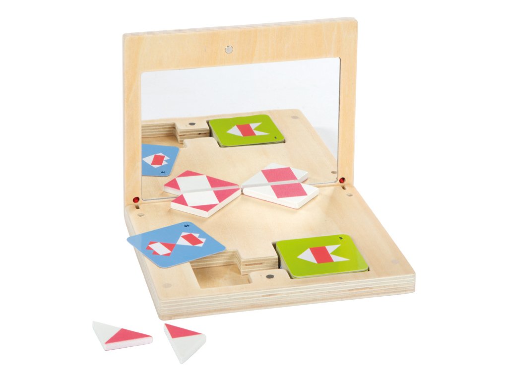Objevte zrcadlové obrazy a symetrie hrou. Tato skvělá hra v praktické dřevěné krabičce je určena k intenzivnímu zkoumání symetrických obrazců a geometrických tvarů. Cílem dětského zrcadlového tangramu je umístit čtyři tvarové destičky z pevného dřeva před velké nerozbitné zrcadlo tak, aby umístěný obrazec spolu s obrazcem v zrcadle tvořil obrázek na příslušné kartě předlohy. Na 32 oboustranně potištěných šablonových kartách najdete úkoly se zvyšující se obtížností. Díky praktickému magnetickému uzávěru a kompaktním rozměrům je hra také ideálním společníkem a zábavou na cestách. Geometrické zrcadlo je fascinující hra a výuková zábava pro trénink prostorové a geometrické představivosti. Je vhodná také pro rozpoznávání vzorů, tvarů, obrazců a jejich zrcadlových obrazů a symetrií. Vzdělávací hra, která zároveň hravou formou podporuje soustředění. Díky odolnému materiálu má hra na symetrii dlouhou životnost a lze ji používat několik let. Ideálně se doplňuje s dalšími vzdělávacími hrami z produktové řady "Educate". Hlavní vlastnosti: lze doplnit dalšími vzdělávacími hrami z produktové řady "Educate"baleno v praktické krabičce s magnetickým uzávěremhra vhodná k učení symetrických obrazců a geometrických tvarů32ks s oboustranně potištěnými kartamirůzně obtížné úlohy o symetriipodporuje soustředění