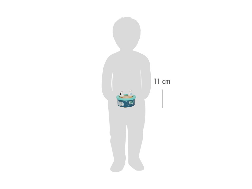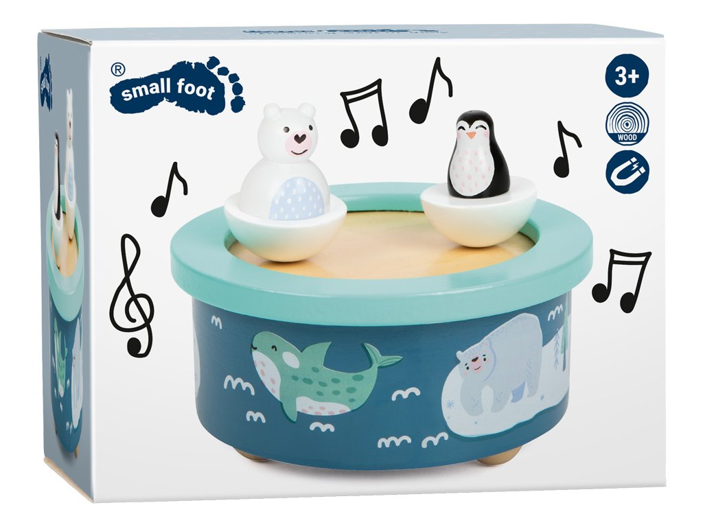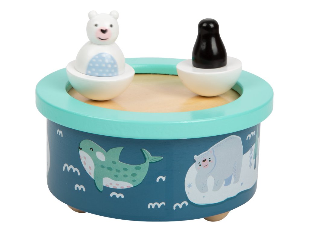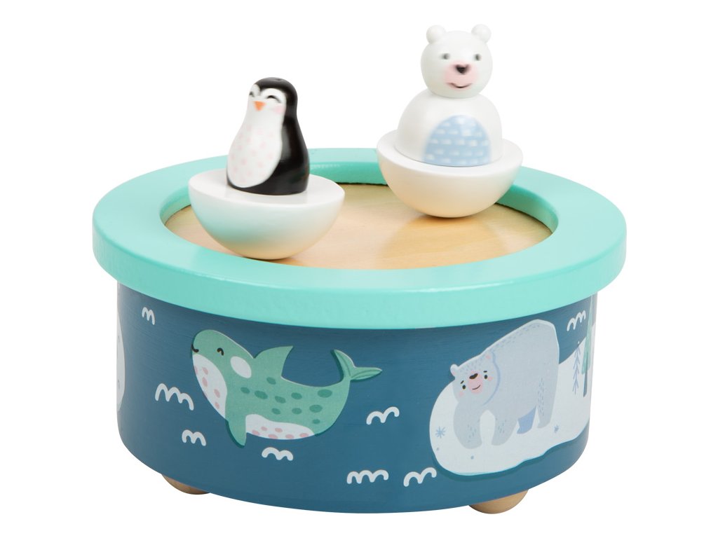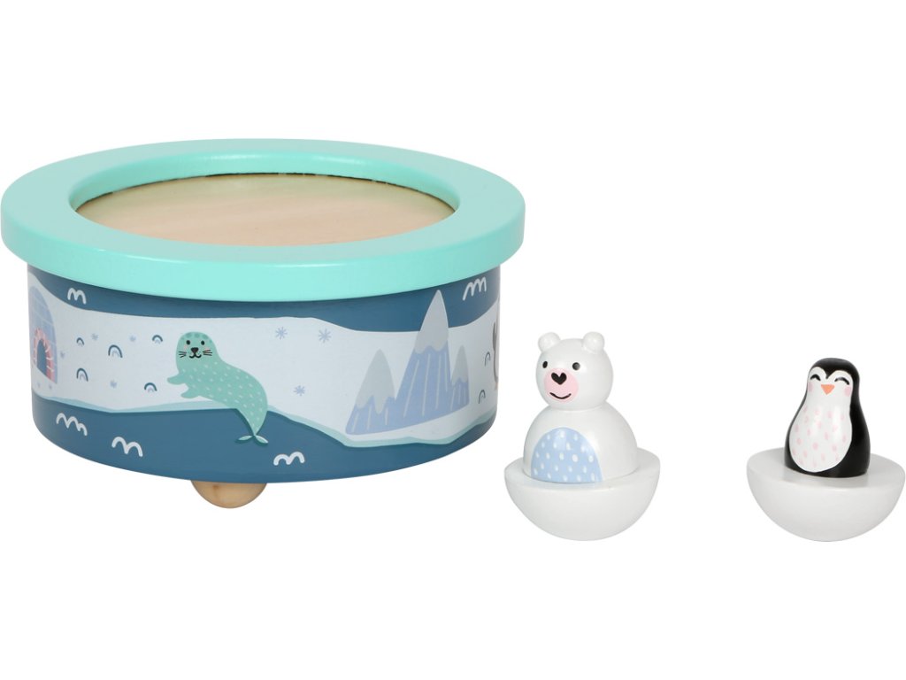 Hrací skříňka s arktickým motivem děti uspí anglickou ukolébavkou. Polární medvěd a tučňák se pohybují do kolečka v rytmu melodie. Obě dřevěné figurky lze ze skříňky oddělit, drží za pomoci magnetu. Děti mohou hudební skříňku natáhnout jednoduše samy, procvičí si při tom jemnou motoriku. Materiál příjemný na dotek, zaoblené hrany pro bezpečnost dětí. Kvalitní potisk a moderní barvy, bude se hodit do každého pokojíčku. Hlavní vlastnosti: Figurky se pohybují v rytmu ukolébavkyTrénuje jemnou motorikuZaoblené hrany